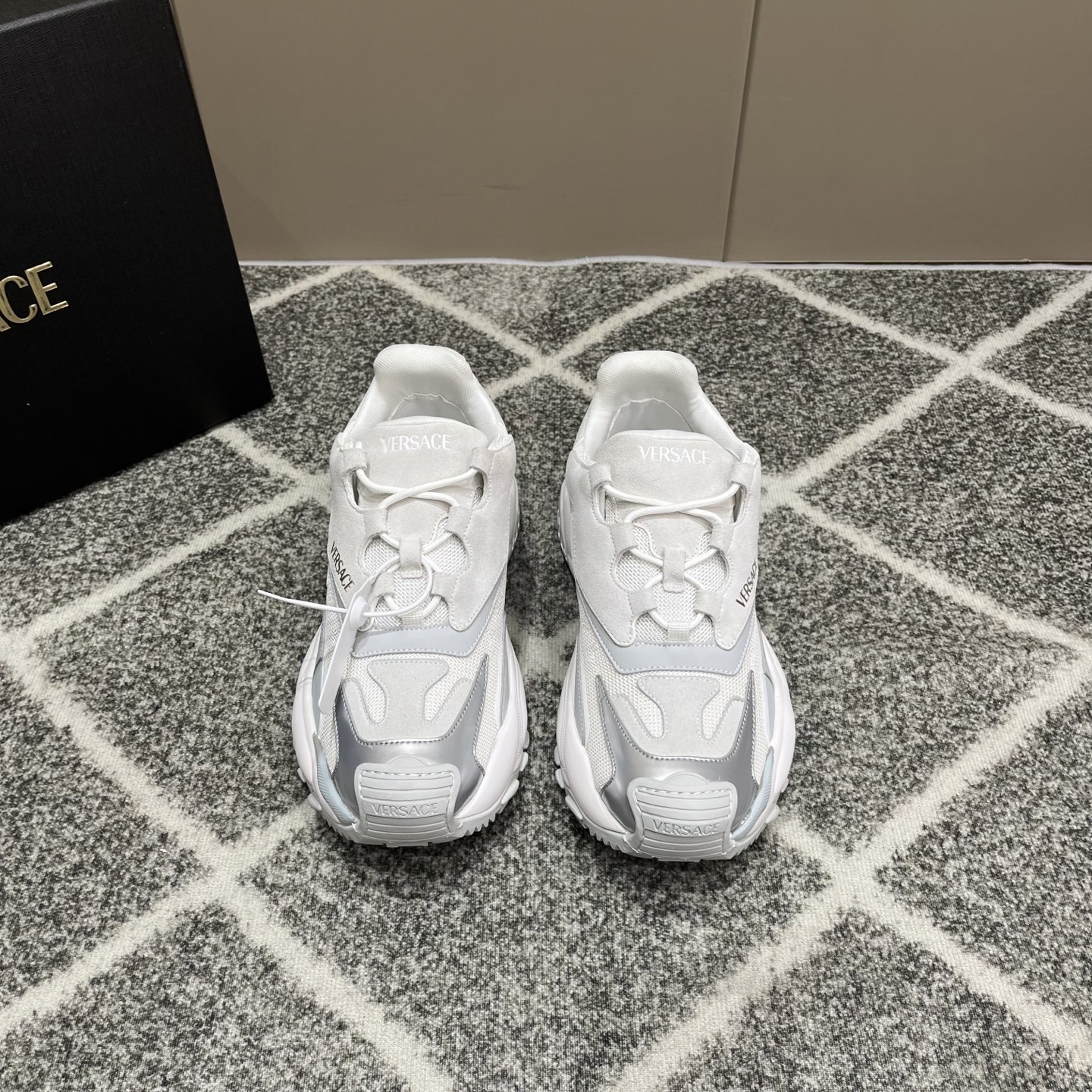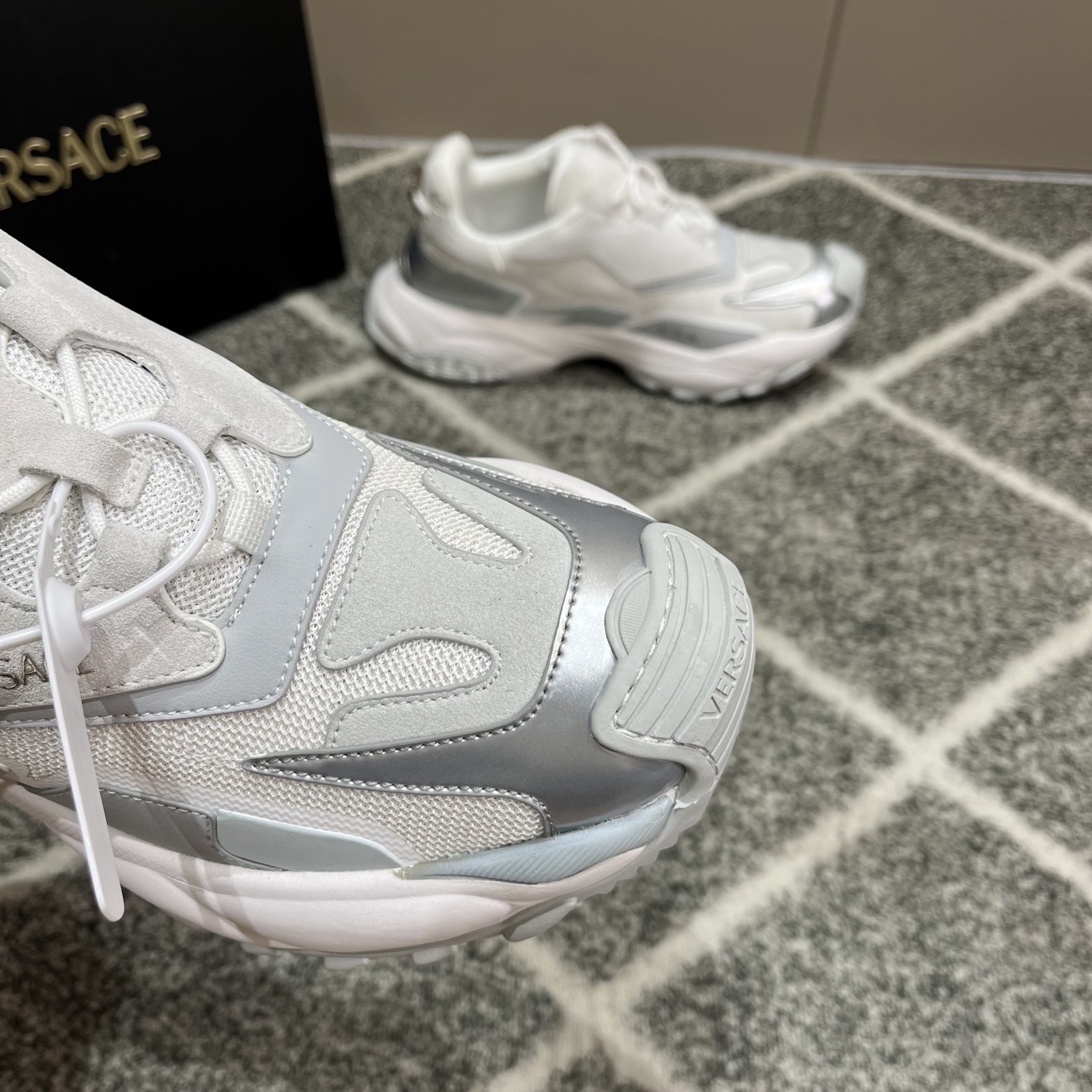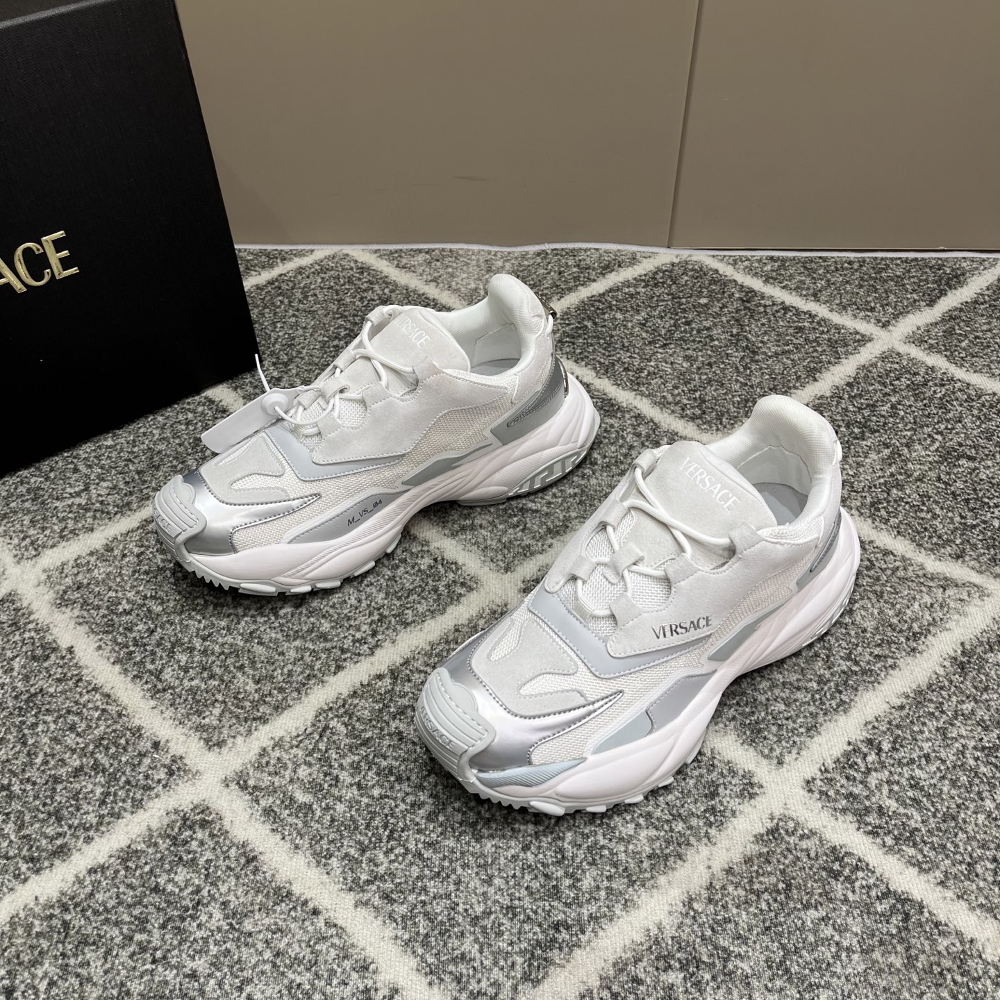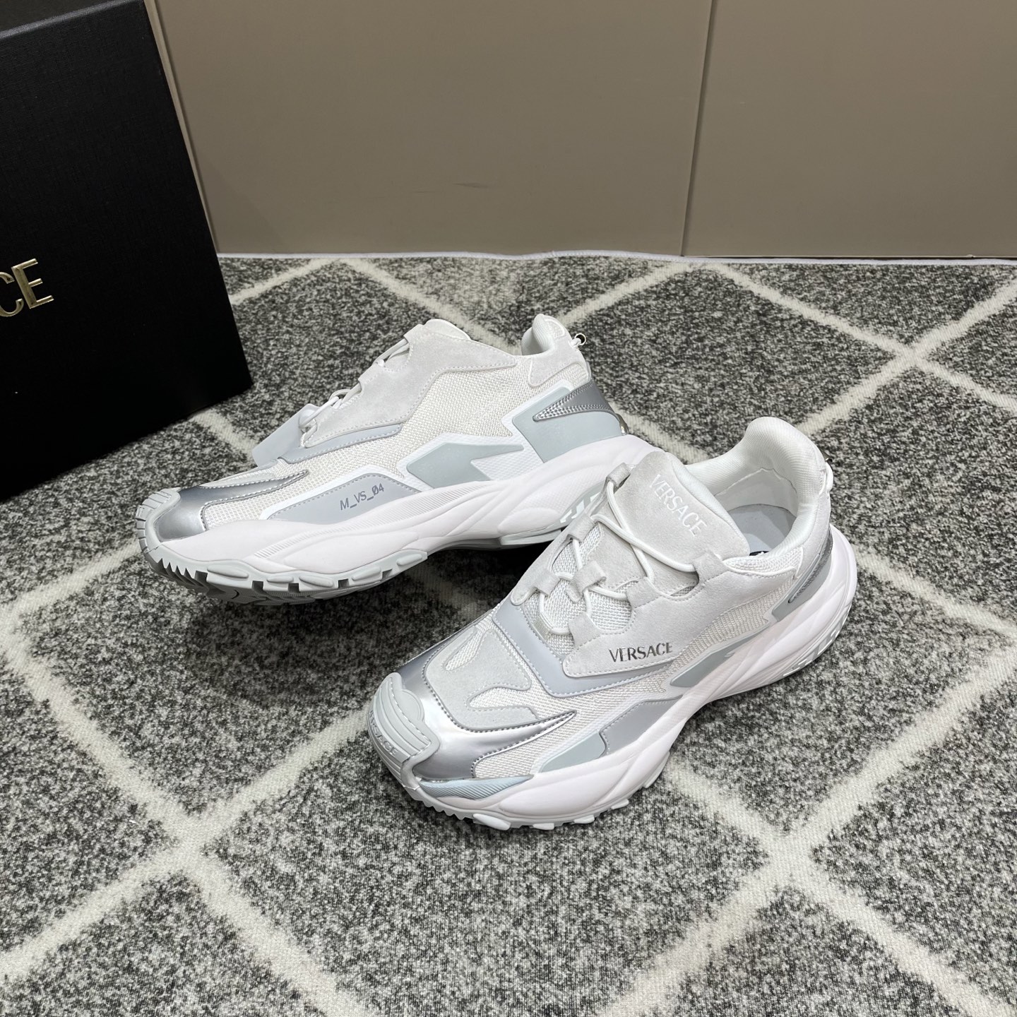 这款鞋子是AAAAA 1:1 质量 (非常棒). 使用了和原版一模一样的材料. 商标部分也保持了和范思哲/Versace一样. 图片拍摄是实物鞋子拍摄, 您所收到的实物保证和我们图片一模一样.