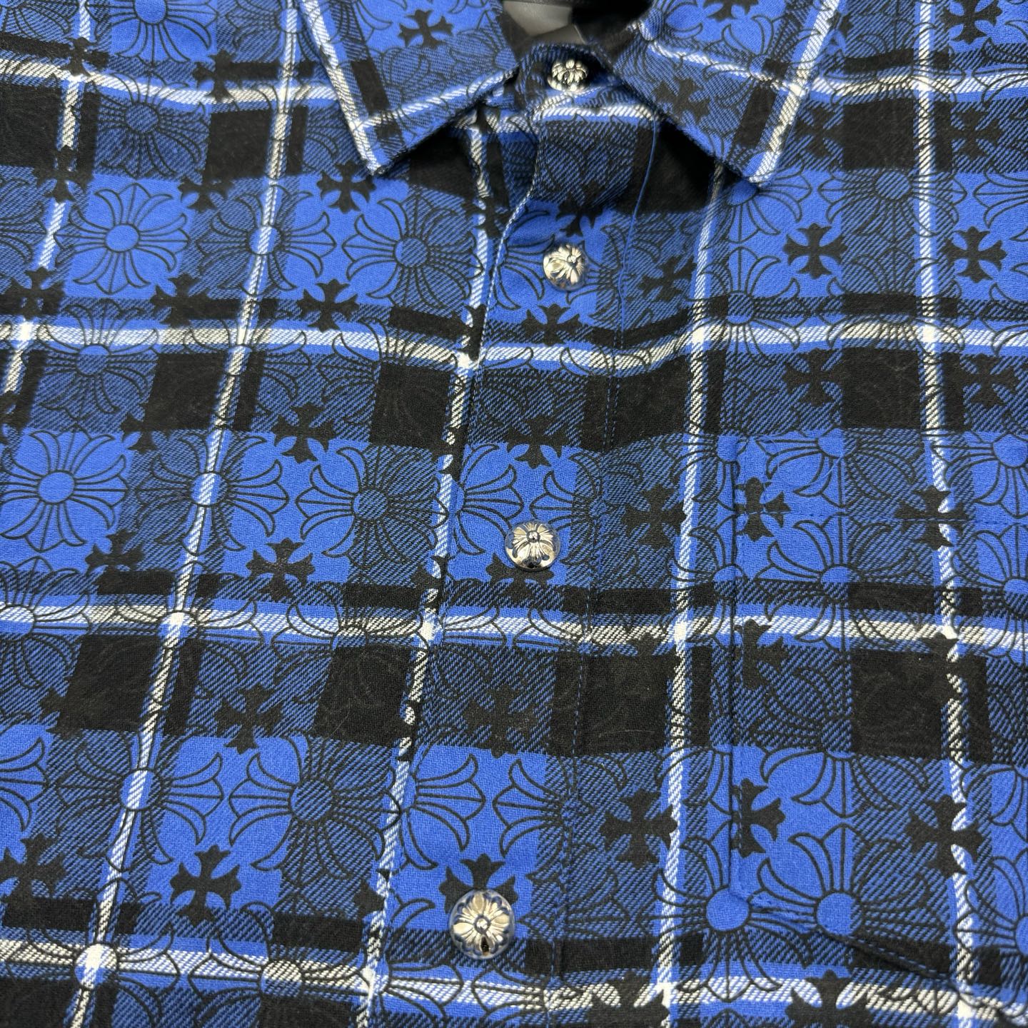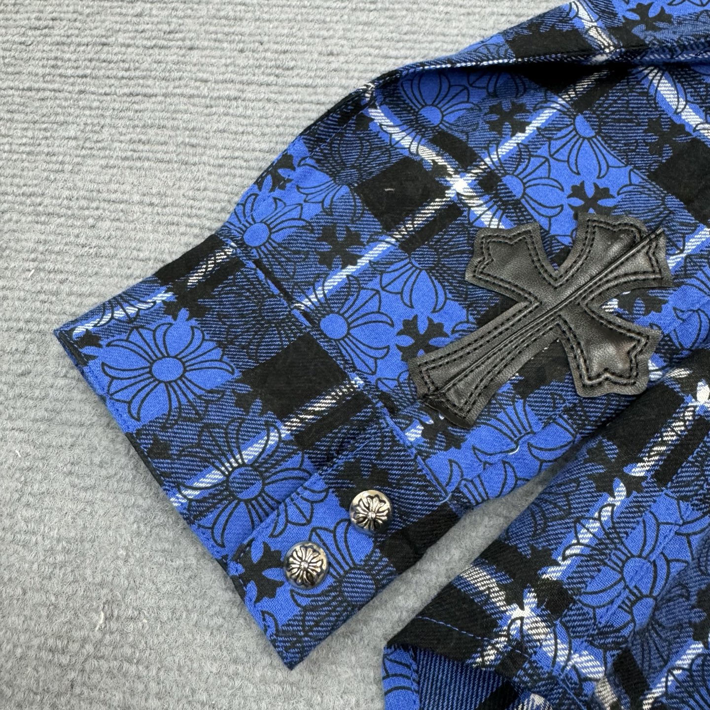 这款衣服是AAAAA 1:1 质量 (非常棒). 使用了和原版一模一样的材料. 商标部分也保持了和克罗心/Chrome Hearts一样. 图片拍摄是实物衣服拍摄, 您所收到的实物保证和我们图片一模一样.