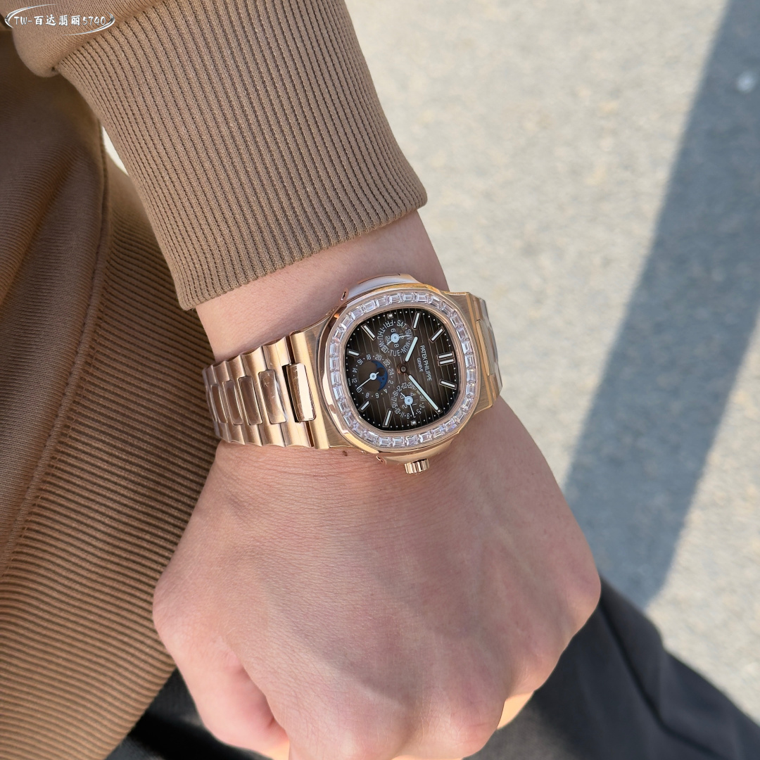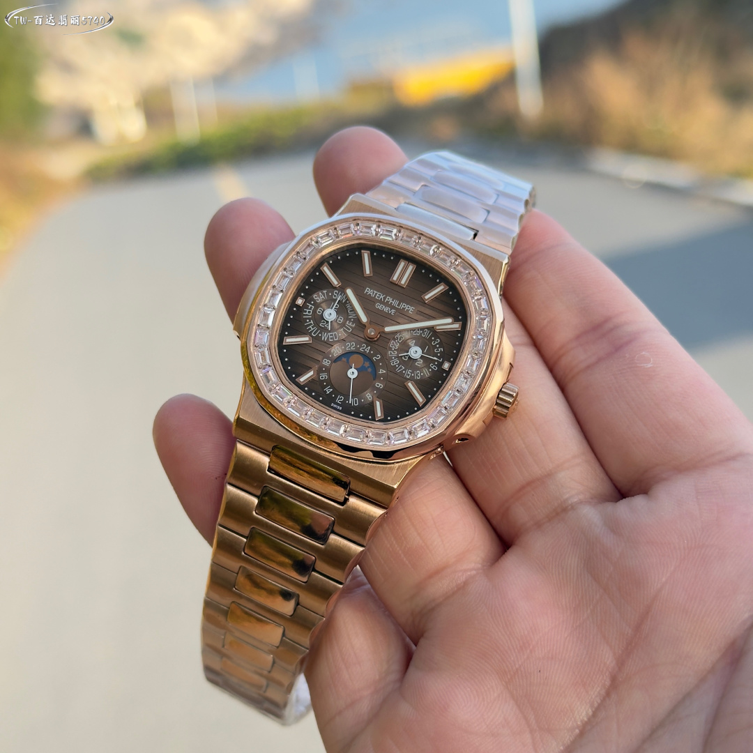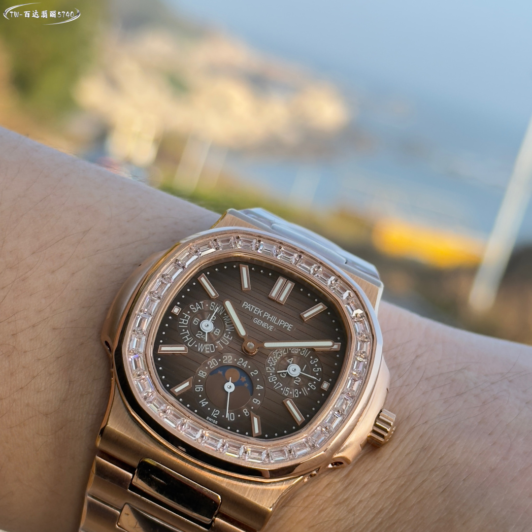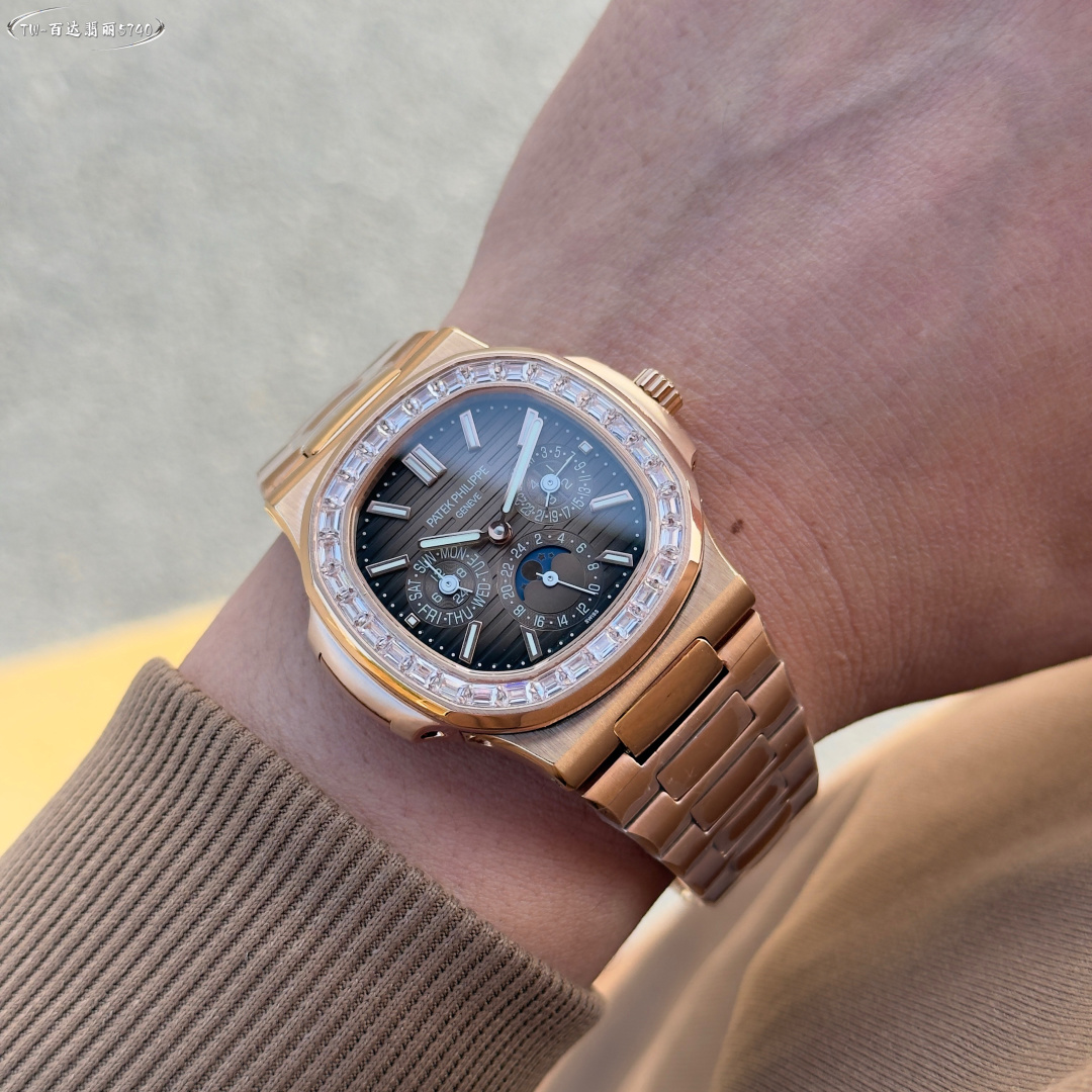 这款手表是AAAAA 1:1 质量 (非常棒). 使用了和原版一模一样的材料. 商标部分也保持了和百达翡丽/Patek Philippe一样. 图片拍摄是实物手表拍摄, 您所收到的实物保证和我们图片一模一样.