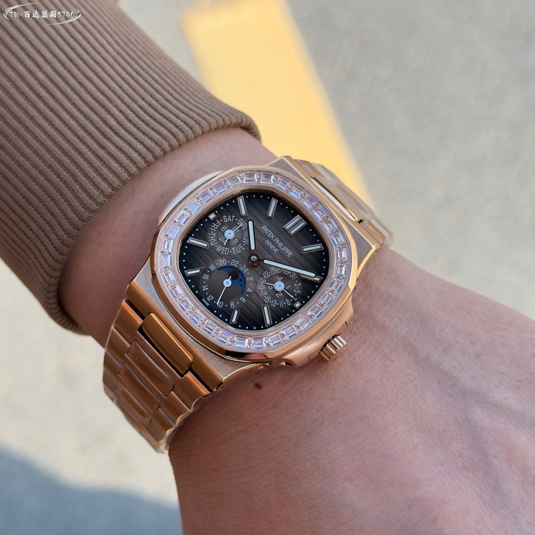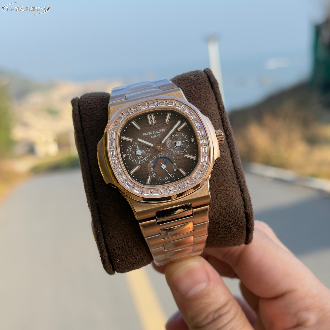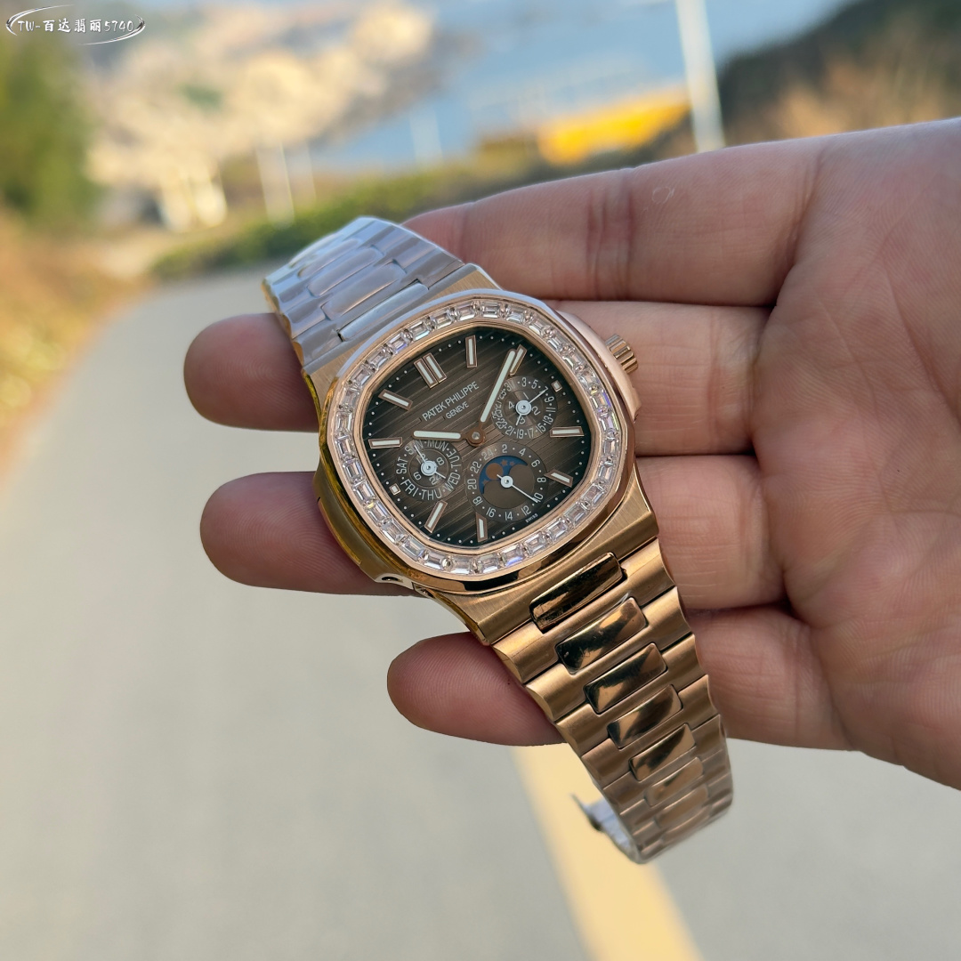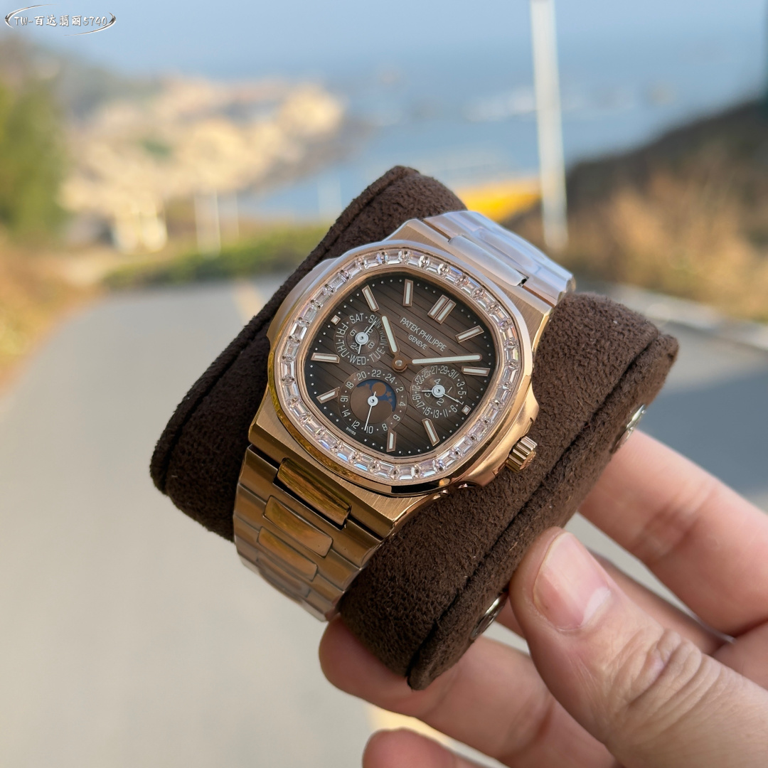 这款手表是AAAAA 1:1 质量 (非常棒). 使用了和原版一模一样的材料. 商标部分也保持了和百达翡丽/Patek Philippe一样. 图片拍摄是实物手表拍摄, 您所收到的实物保证和我们图片一模一样.