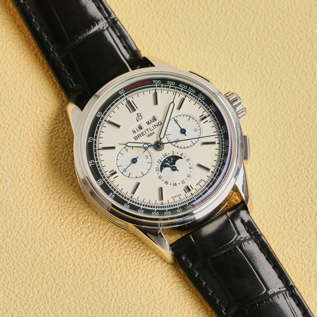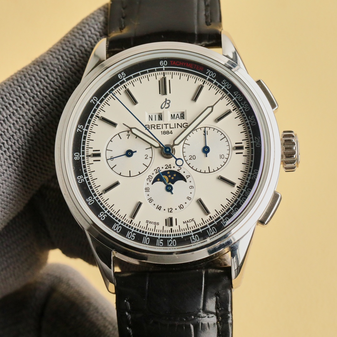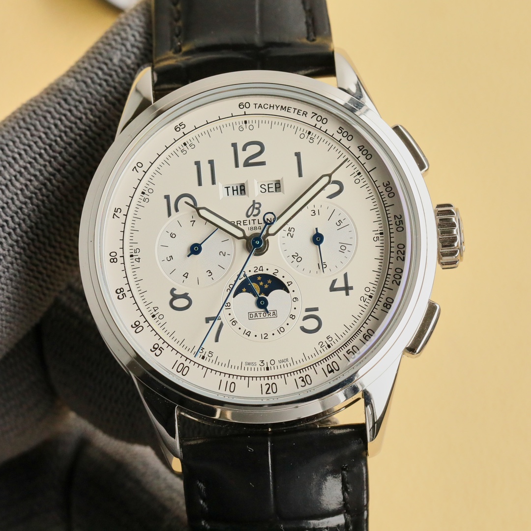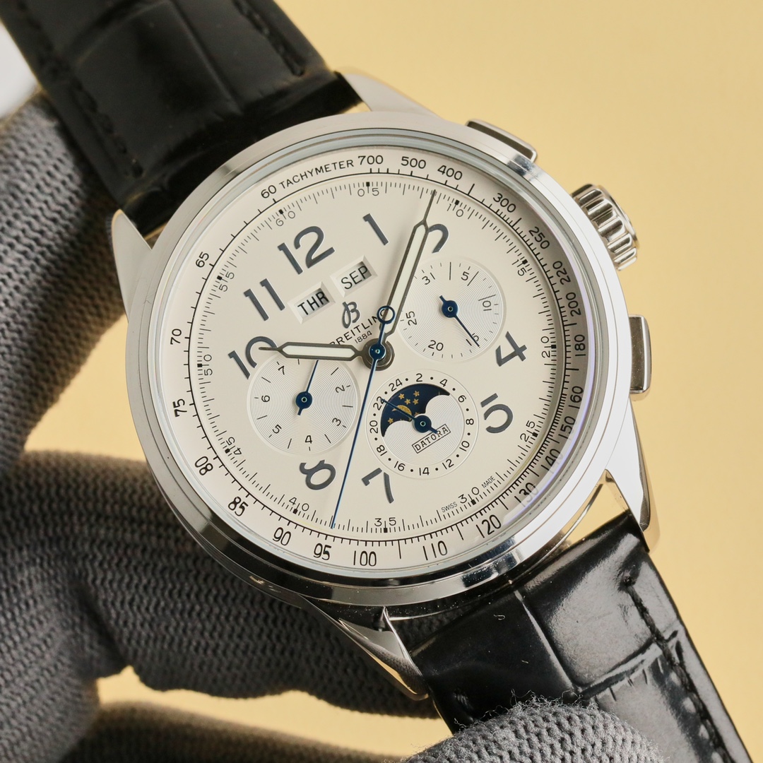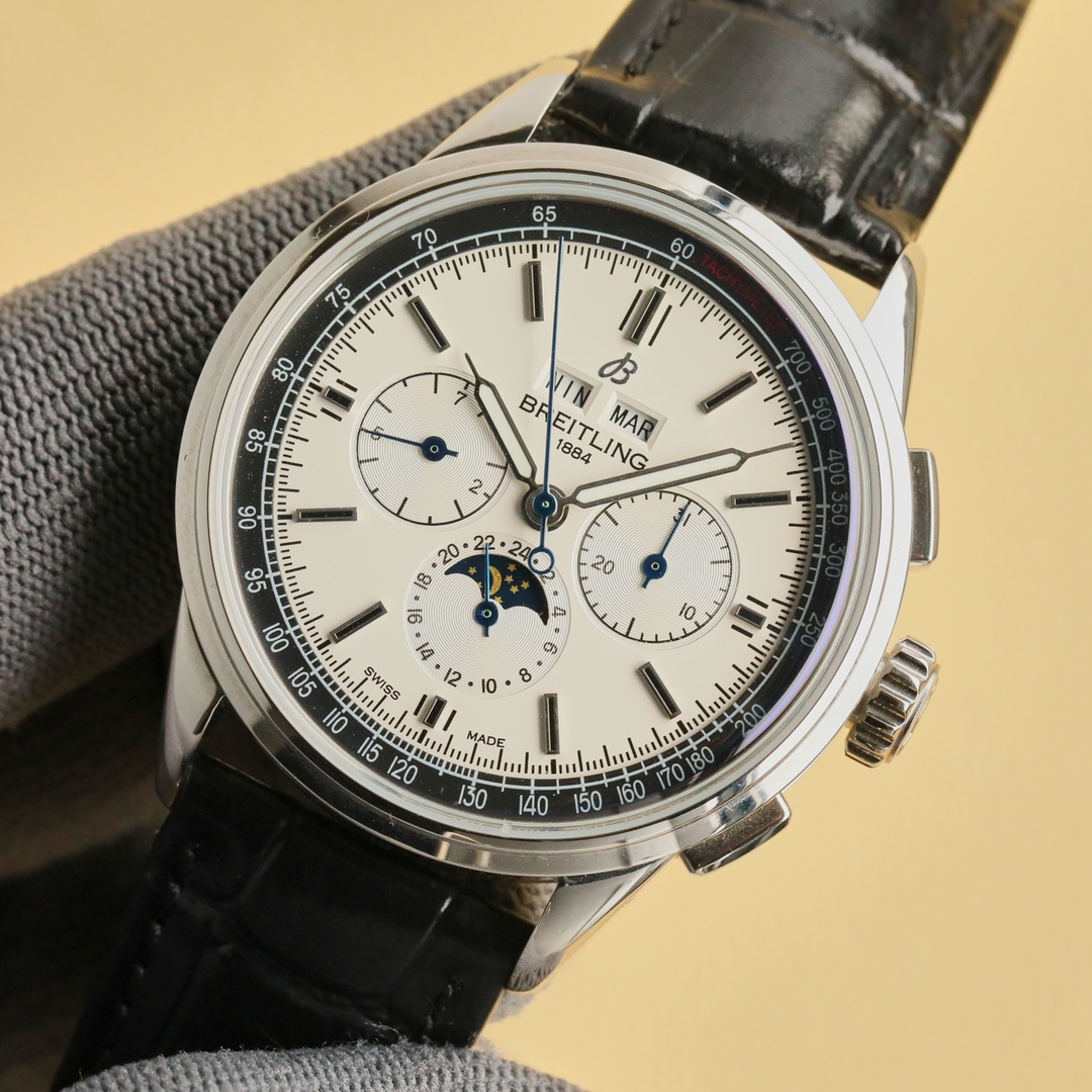 这款手表是AAAAA 1:1 质量 (非常棒). 使用了和原版一模一样的材料. 商标部分也保持了和Breitling一样. 图片拍摄是实物手表拍摄, 您所收到的实物保证和我们图片一模一样.