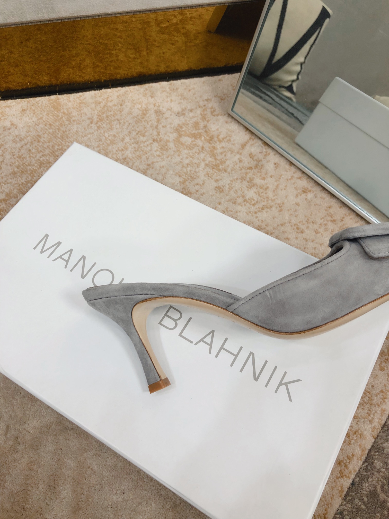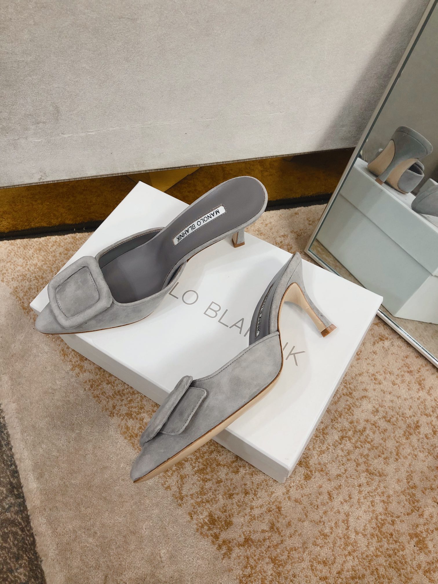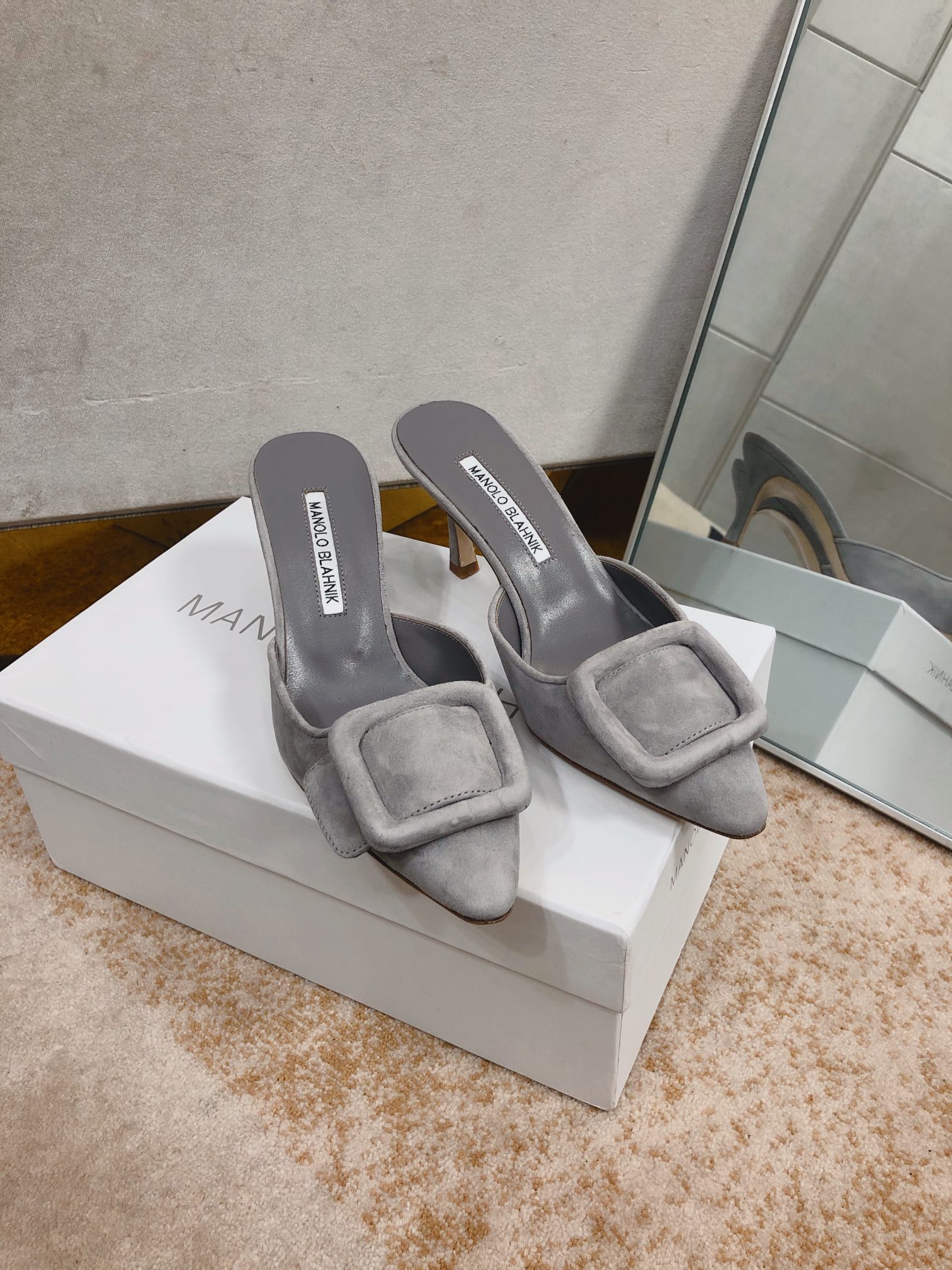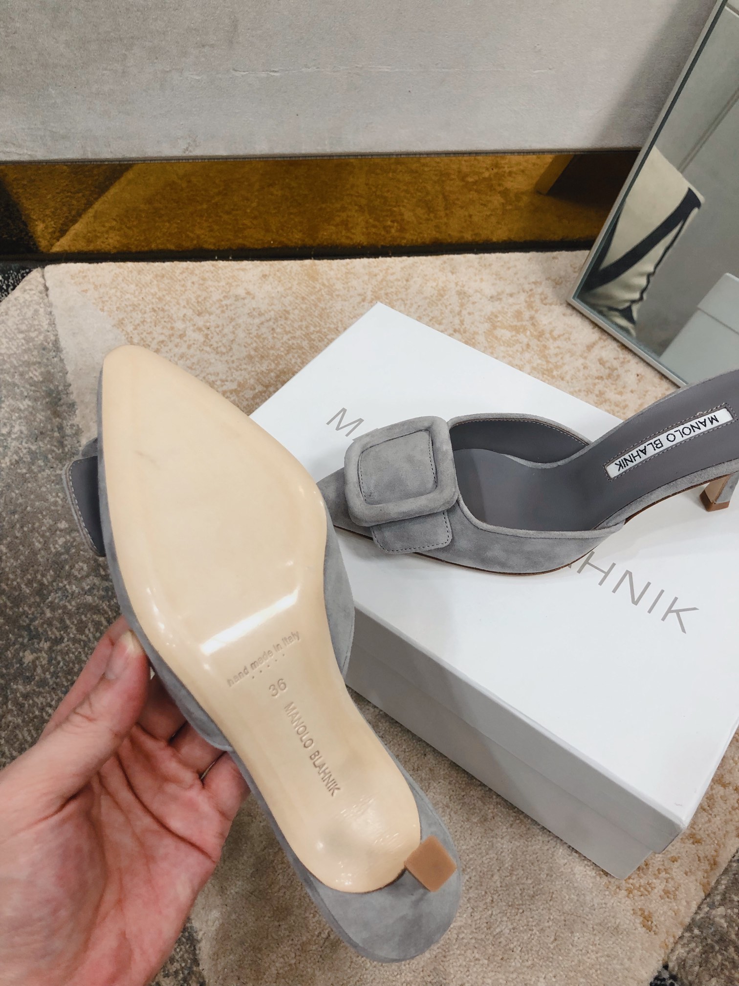这款鞋子是AAAAA 1:1 质量 (非常棒). 使用了和原版一模一样的材料. 商标部分也保持了和马诺洛·布拉尼克/Manolo Blahnik一样. 图片拍摄是实物鞋子拍摄, 您所收到的实物保证和我们图片一模一样.