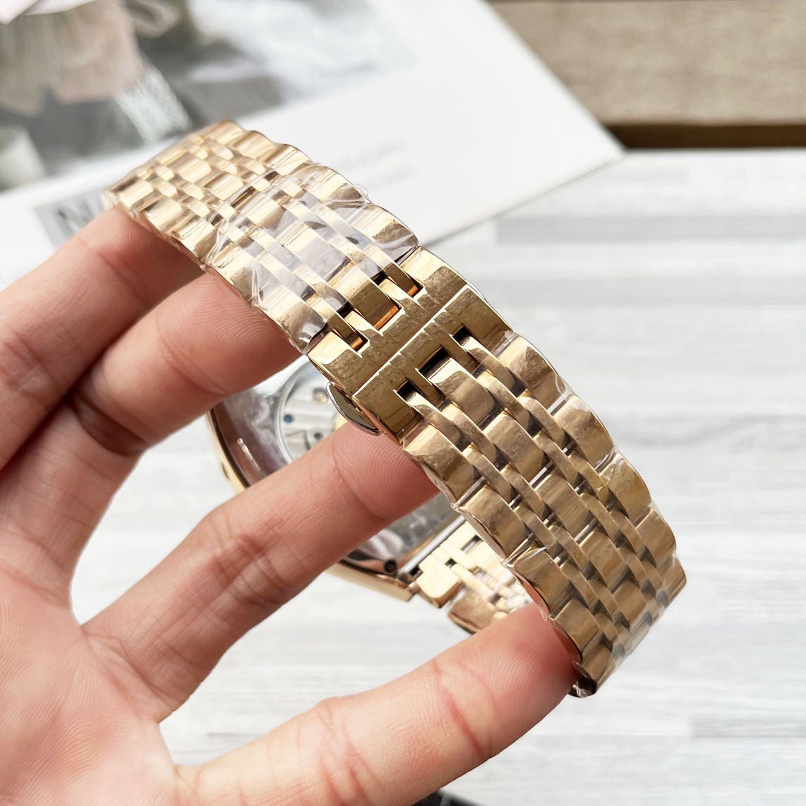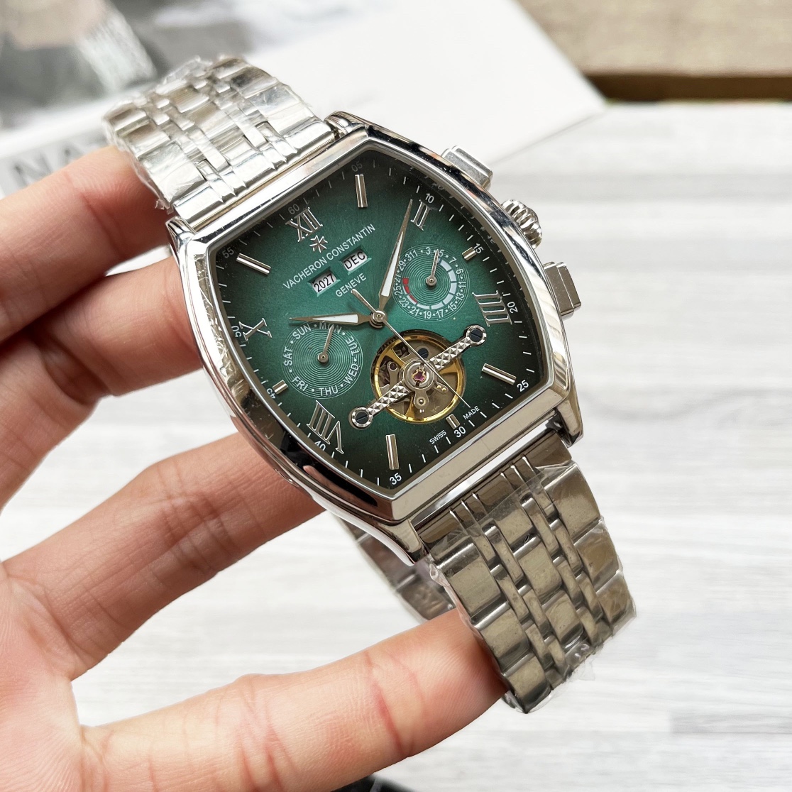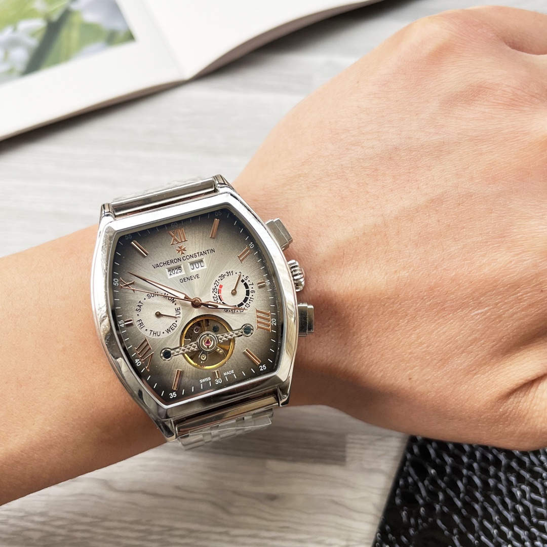 这款手表是AAAAA 1:1 质量 (非常棒). 使用了和原版一模一样的材料. 商标部分也保持了和江诗丹顿/Vacheron Constantin一样. 图片拍摄是实物手表拍摄, 您所收到的实物保证和我们图片一模一样.