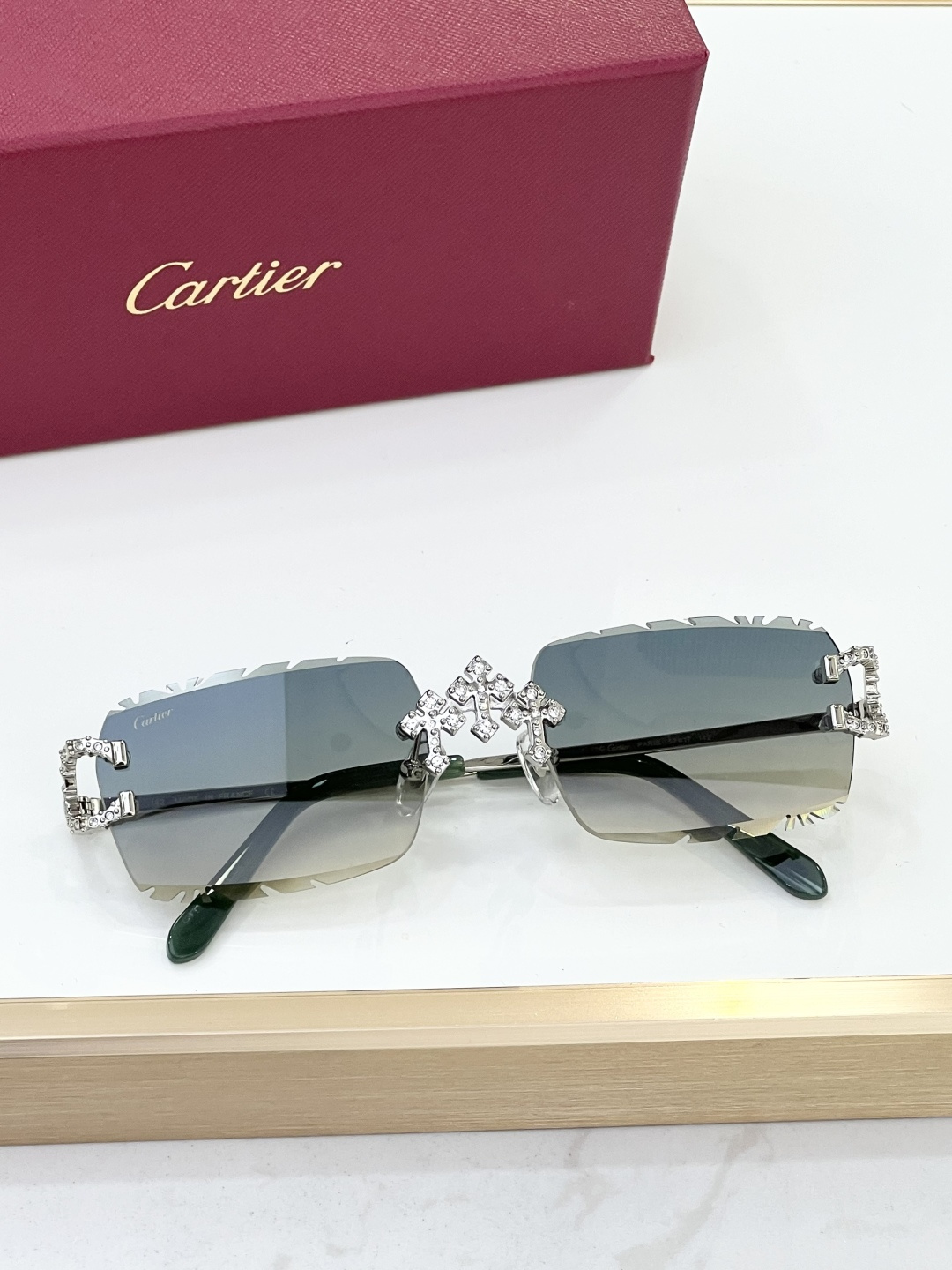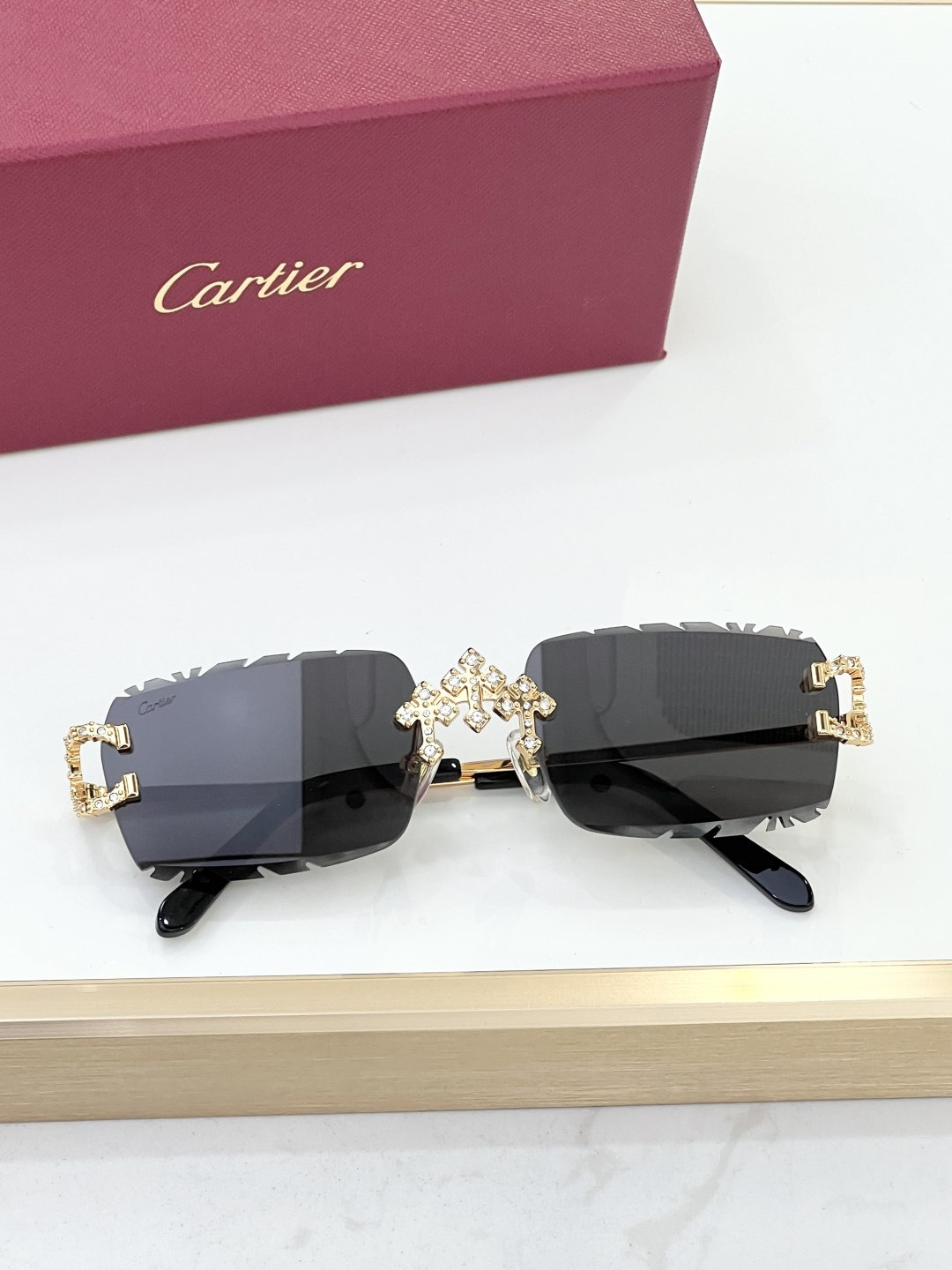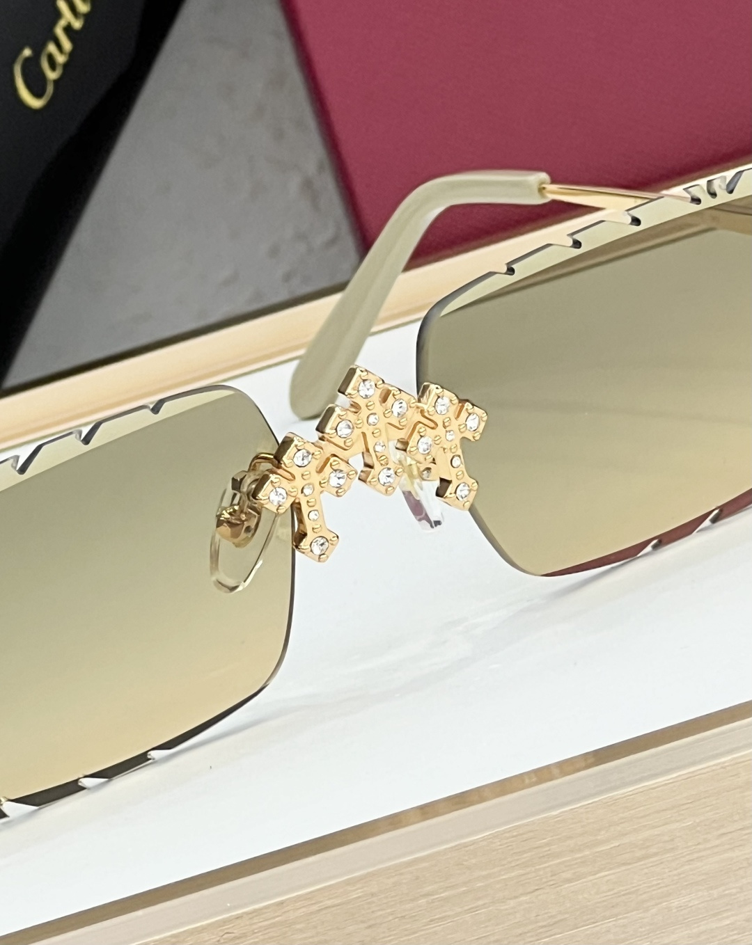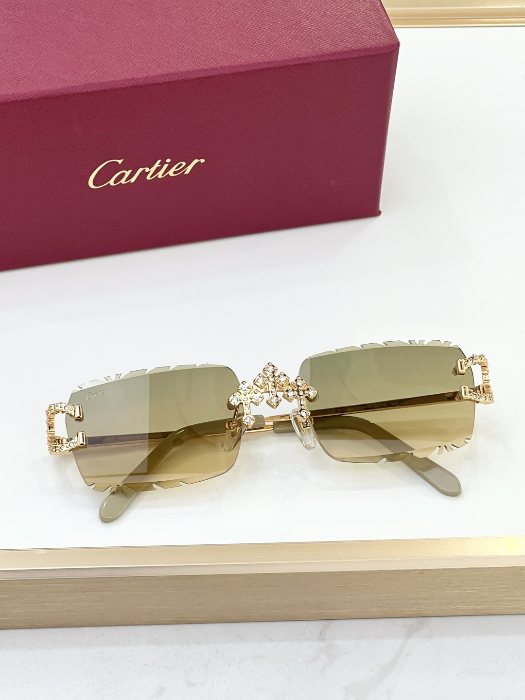 这款太阳眼镜是AAAAA 1:1 质量 (非常棒). 使用了和原版一模一样的材料. 商标部分也保持了和卡地亚/Cartier一样. 图片拍摄是实物太阳眼镜拍摄, 您所收到的实物保证和我们图片一模一样.