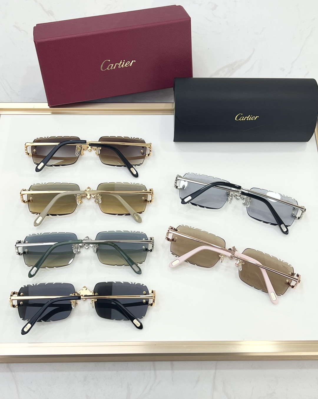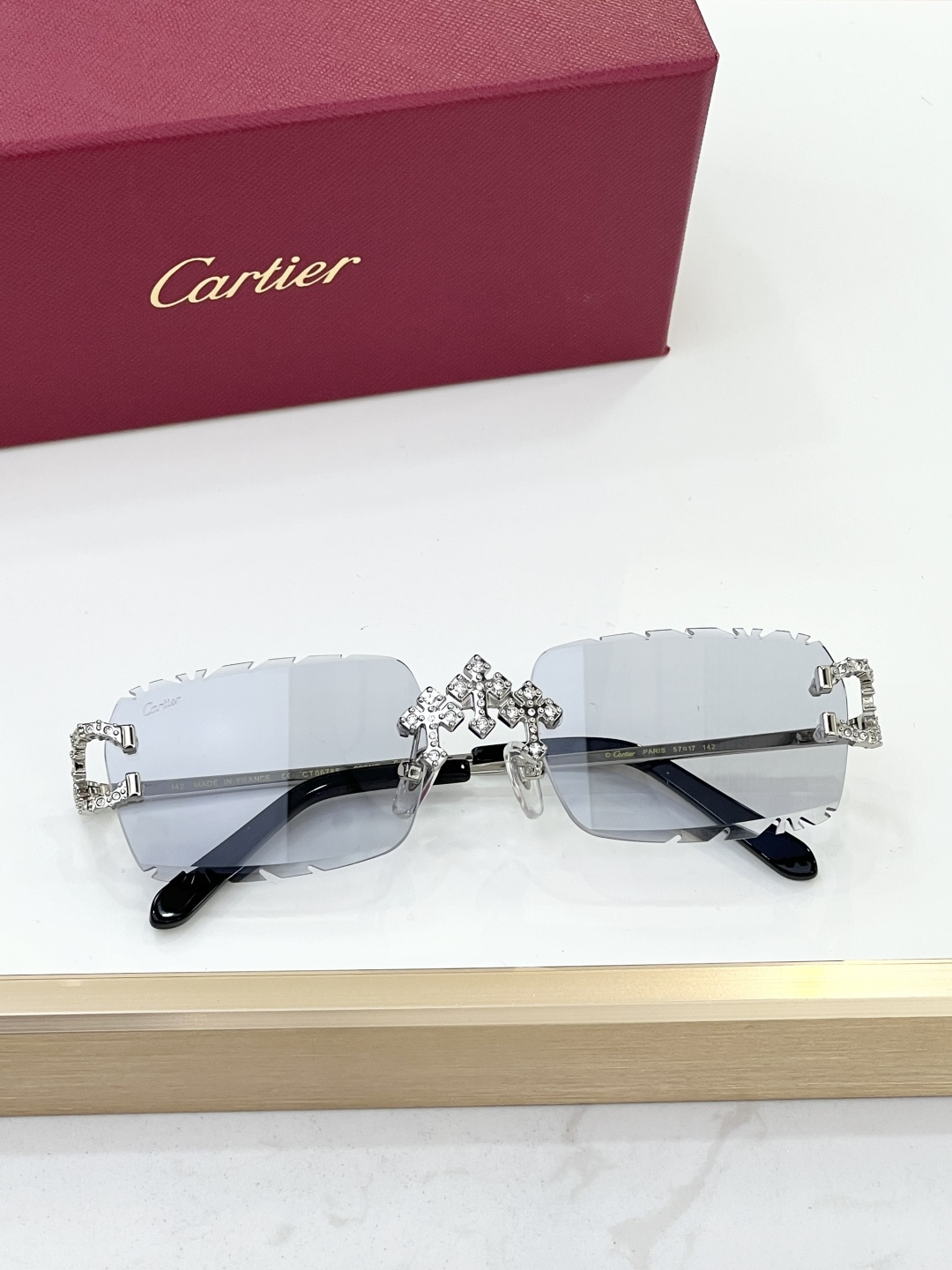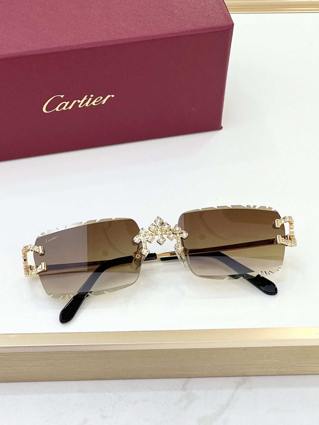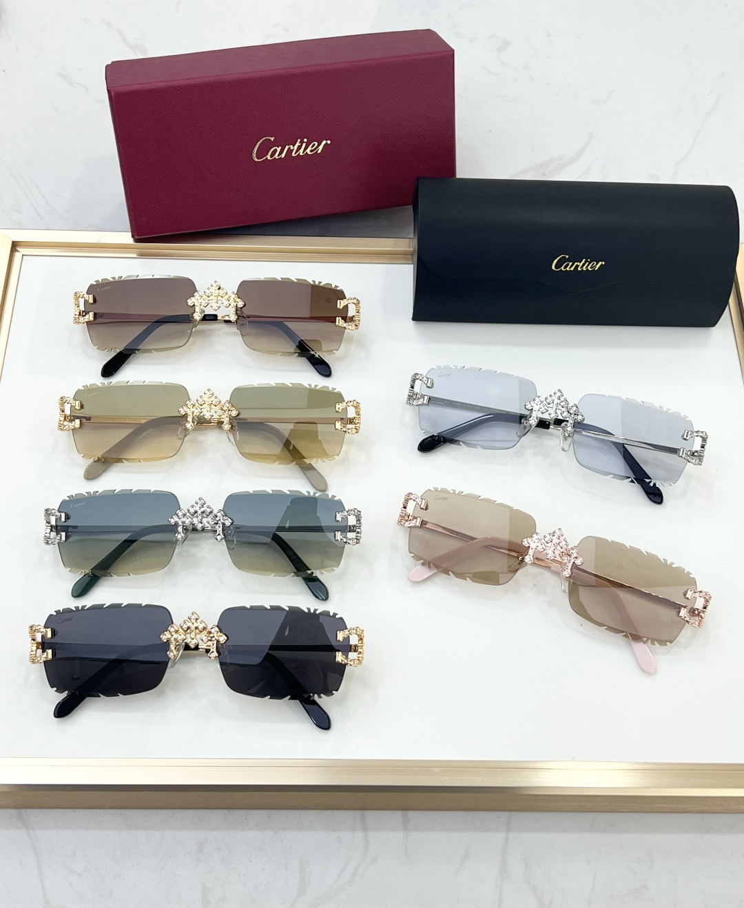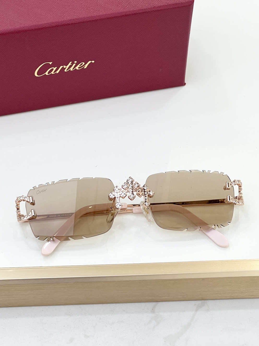这款太阳眼镜是AAAAA 1:1 质量 (非常棒). 使用了和原版一模一样的材料. 商标部分也保持了和卡地亚/Cartier一样. 图片拍摄是实物太阳眼镜拍摄, 您所收到的实物保证和我们图片一模一样.