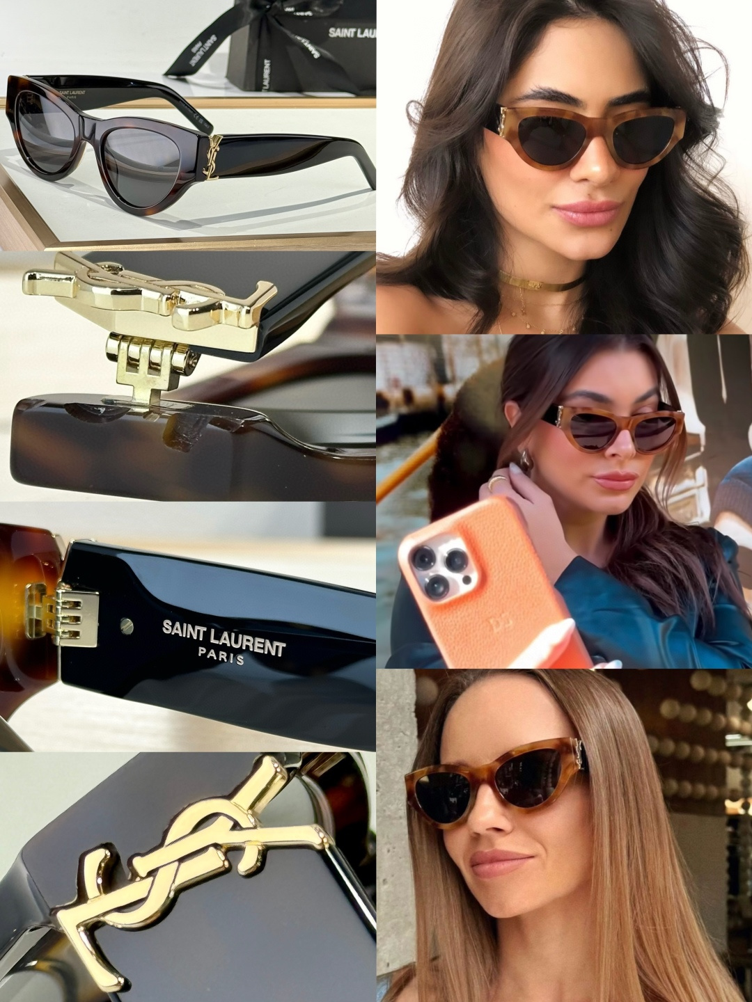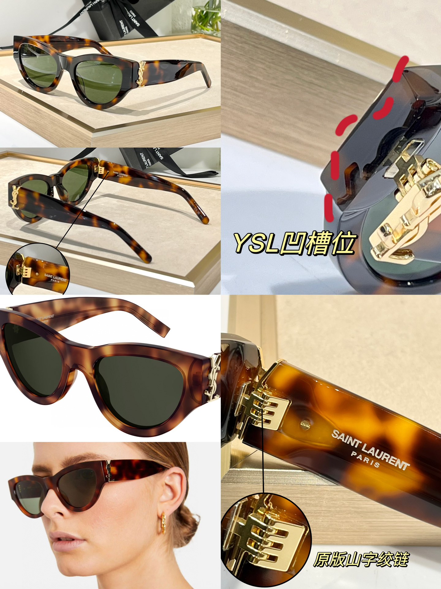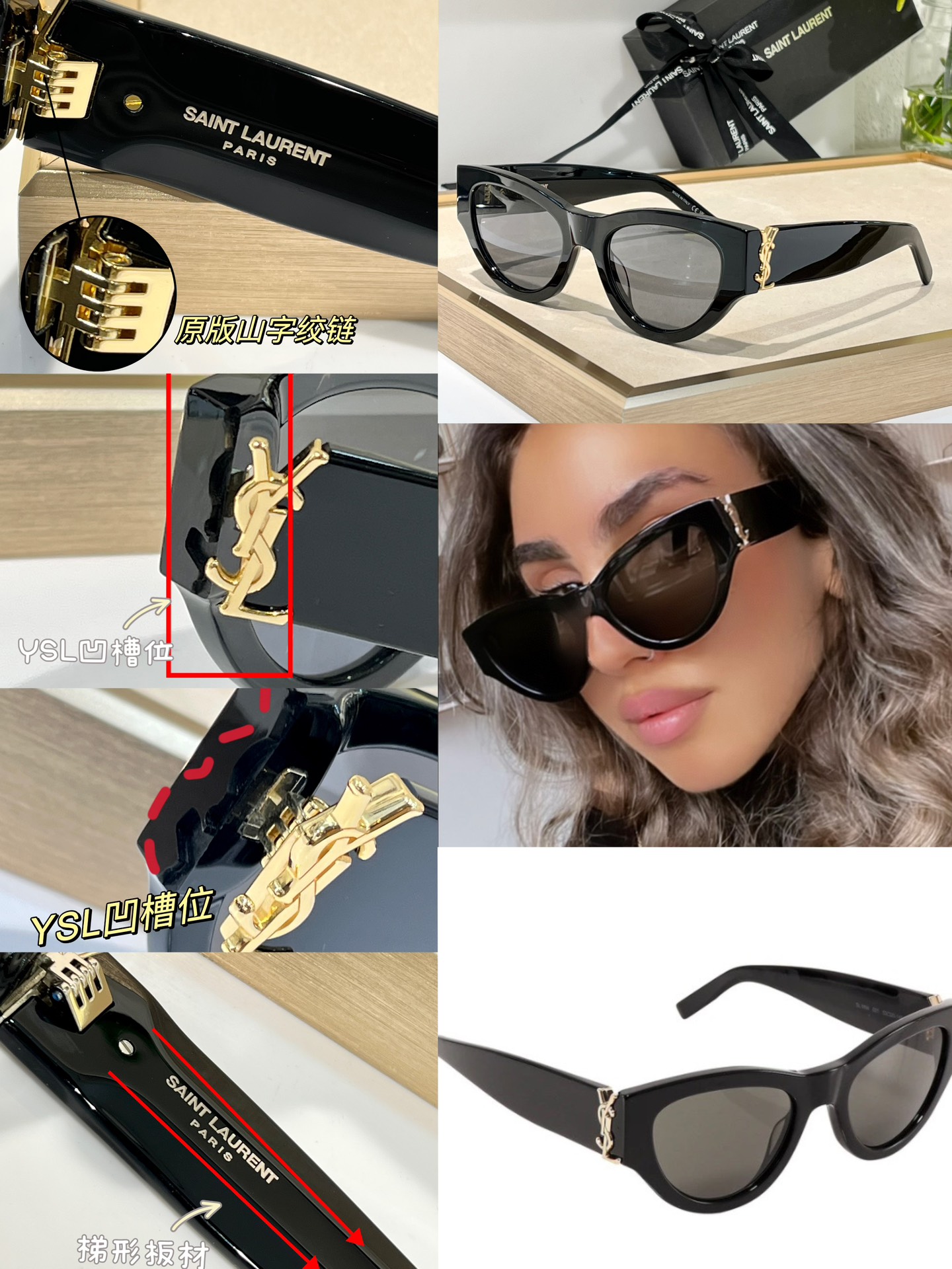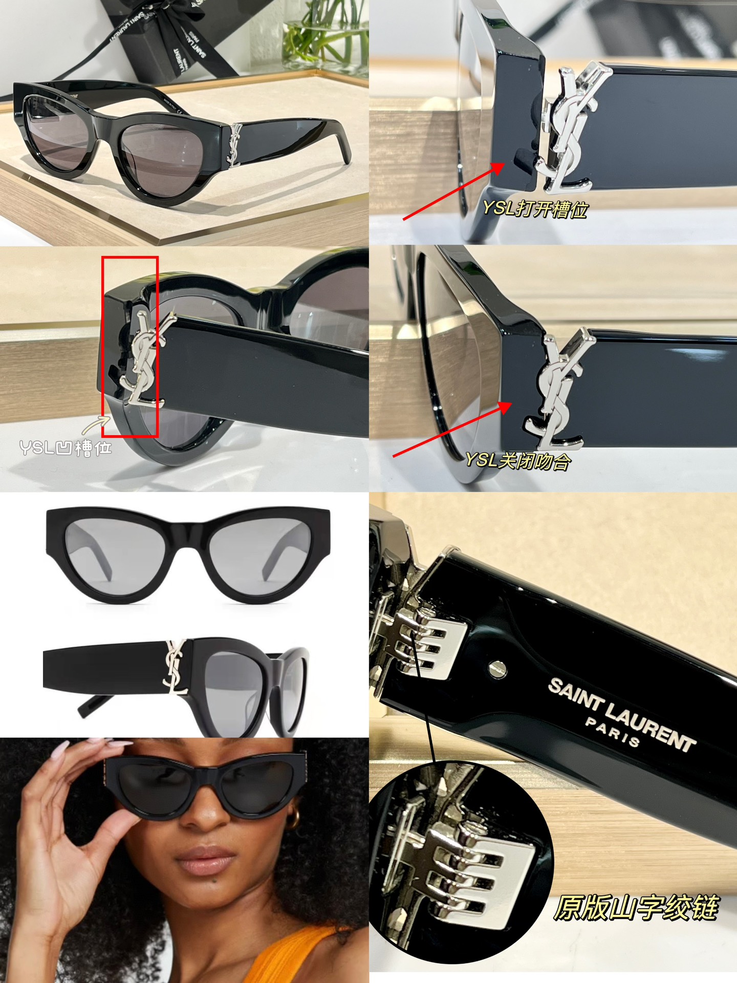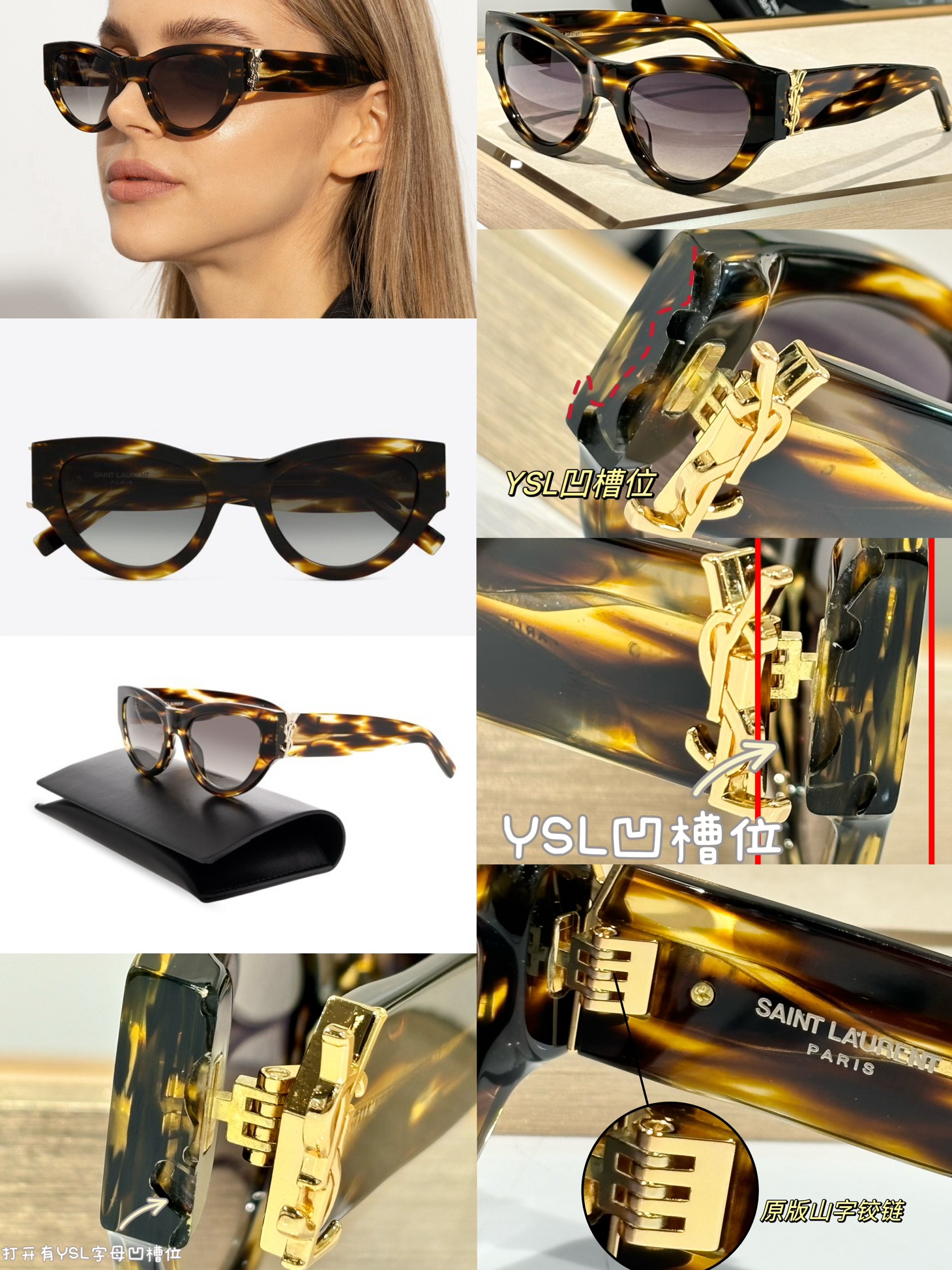 这款太阳眼镜是AAAAA 1:1 质量 (非常棒). 使用了和原版一模一样的材料. 商标部分也保持了和圣罗兰/Saint Laurent一样. 图片拍摄是实物太阳眼镜拍摄, 您所收到的实物保证和我们图片一模一样.