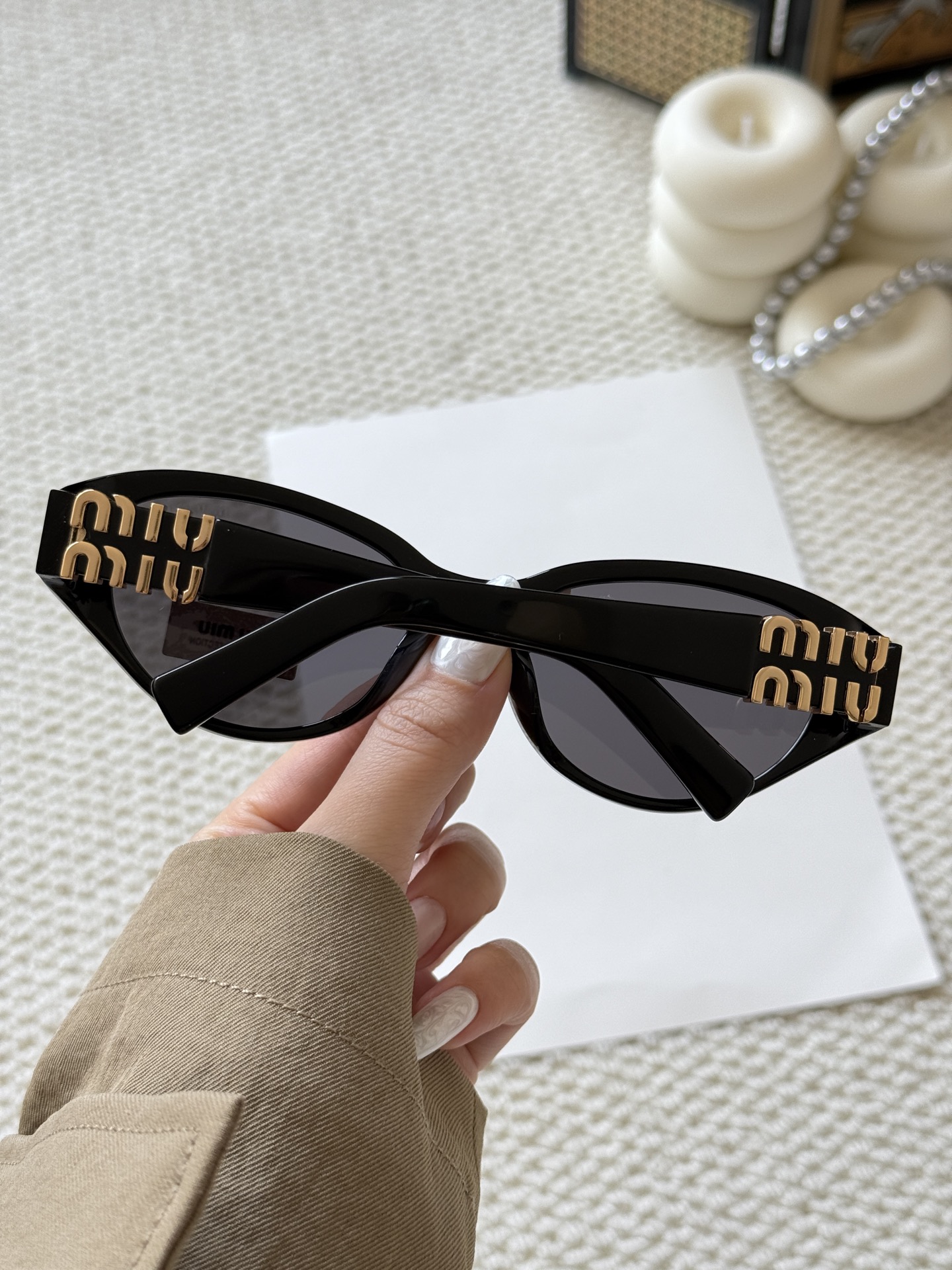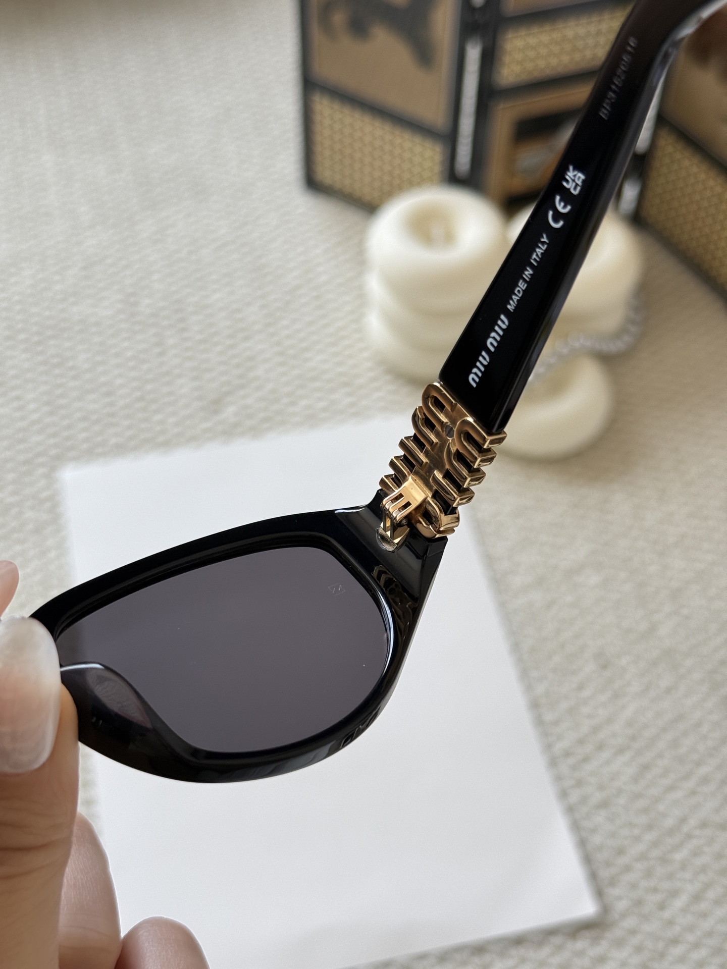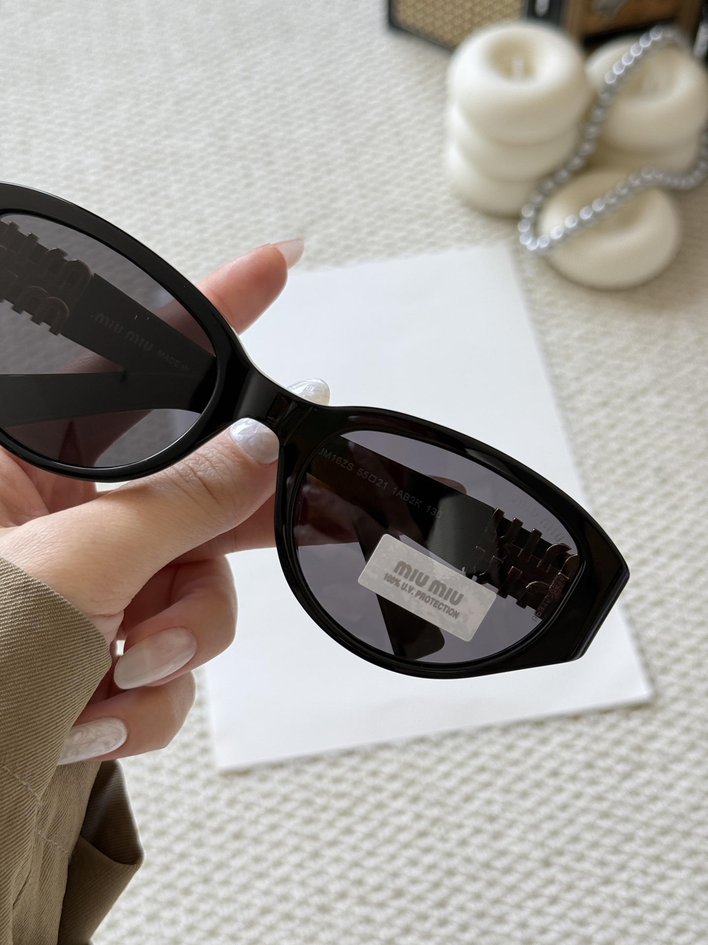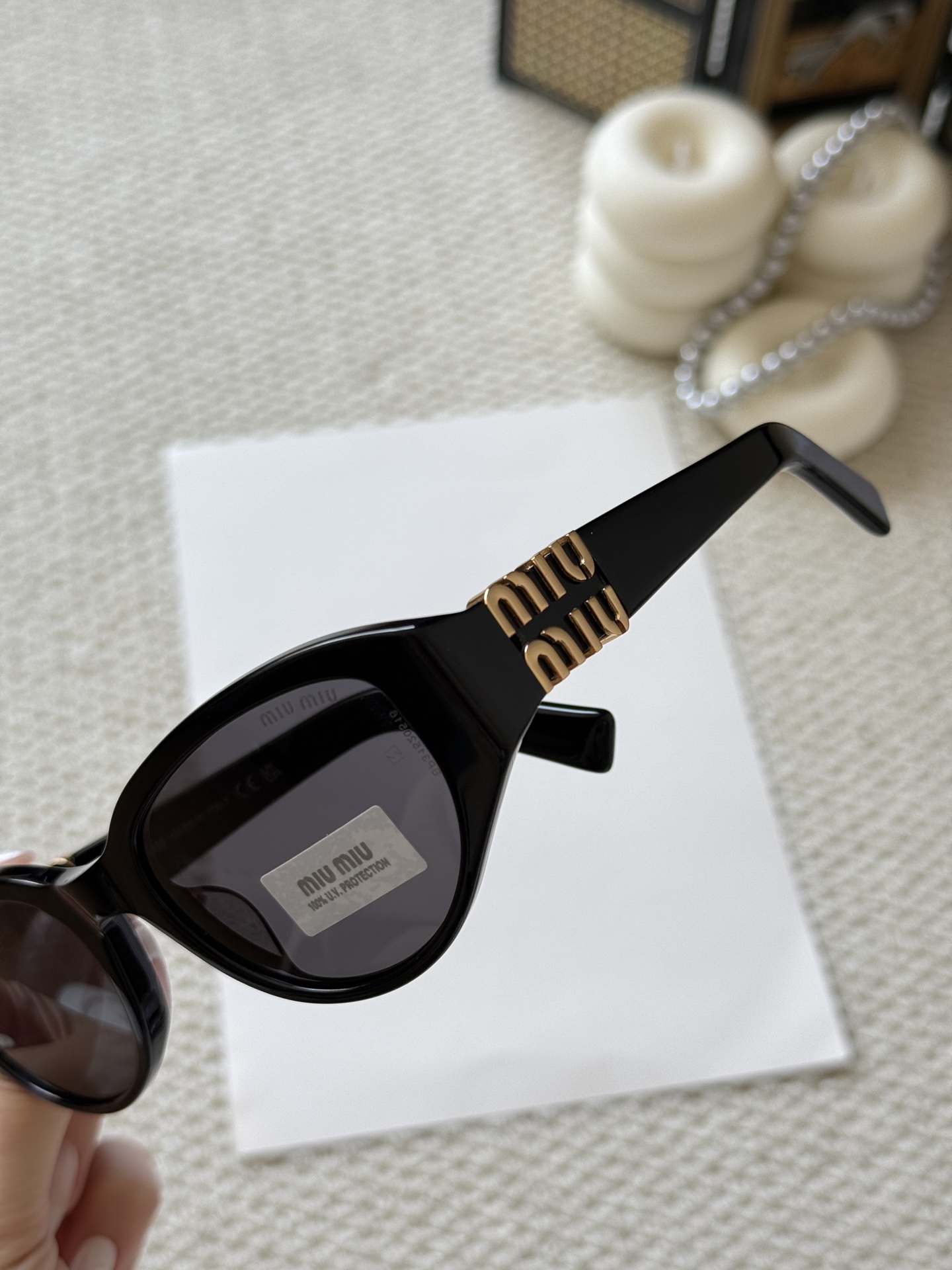 这款太阳眼镜是AAAAA 1:1 质量 (非常棒). 使用了和原版一模一样的材料. 商标部分也保持了和缪缪/Miu Miu一样. 图片拍摄是实物太阳眼镜拍摄, 您所收到的实物保证和我们图片一模一样.