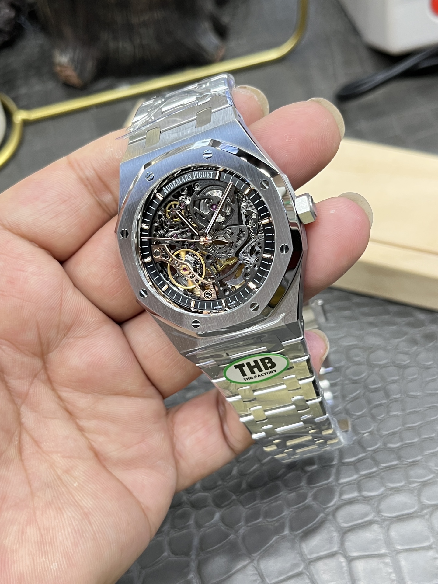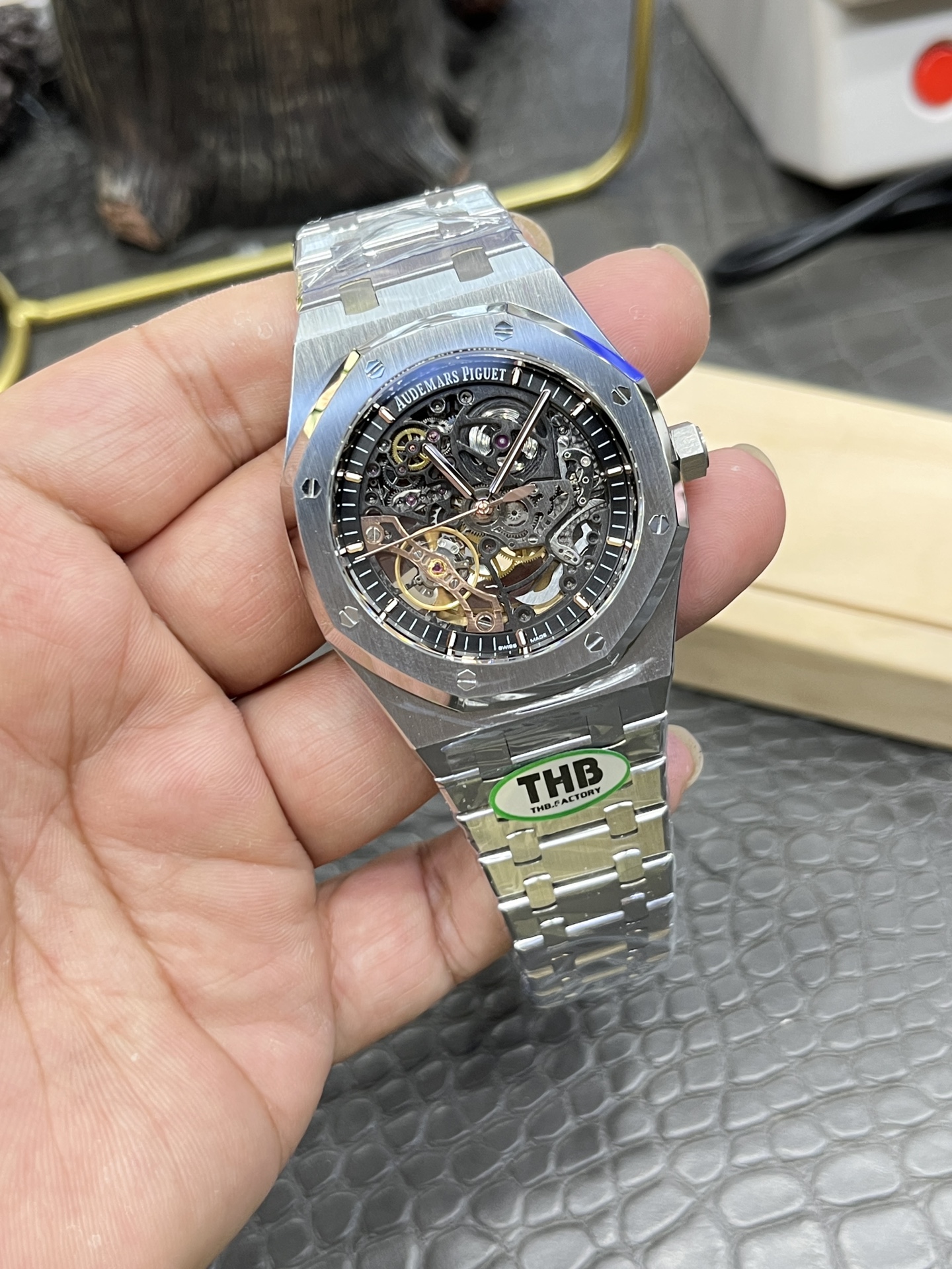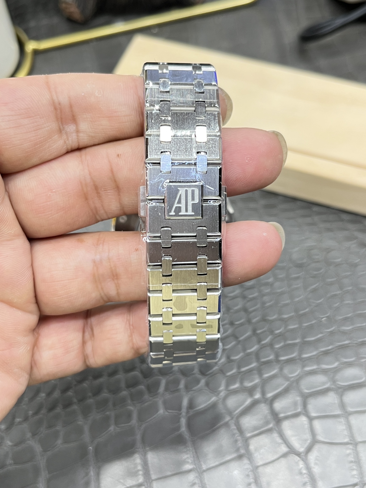 这款手表是AAAAA 1:1 质量 (非常棒). 使用了和原版一模一样的材料. 商标部分也保持了和爱彼/Audemars Piguet一样. 图片拍摄是实物手表拍摄, 您所收到的实物保证和我们图片一模一样.