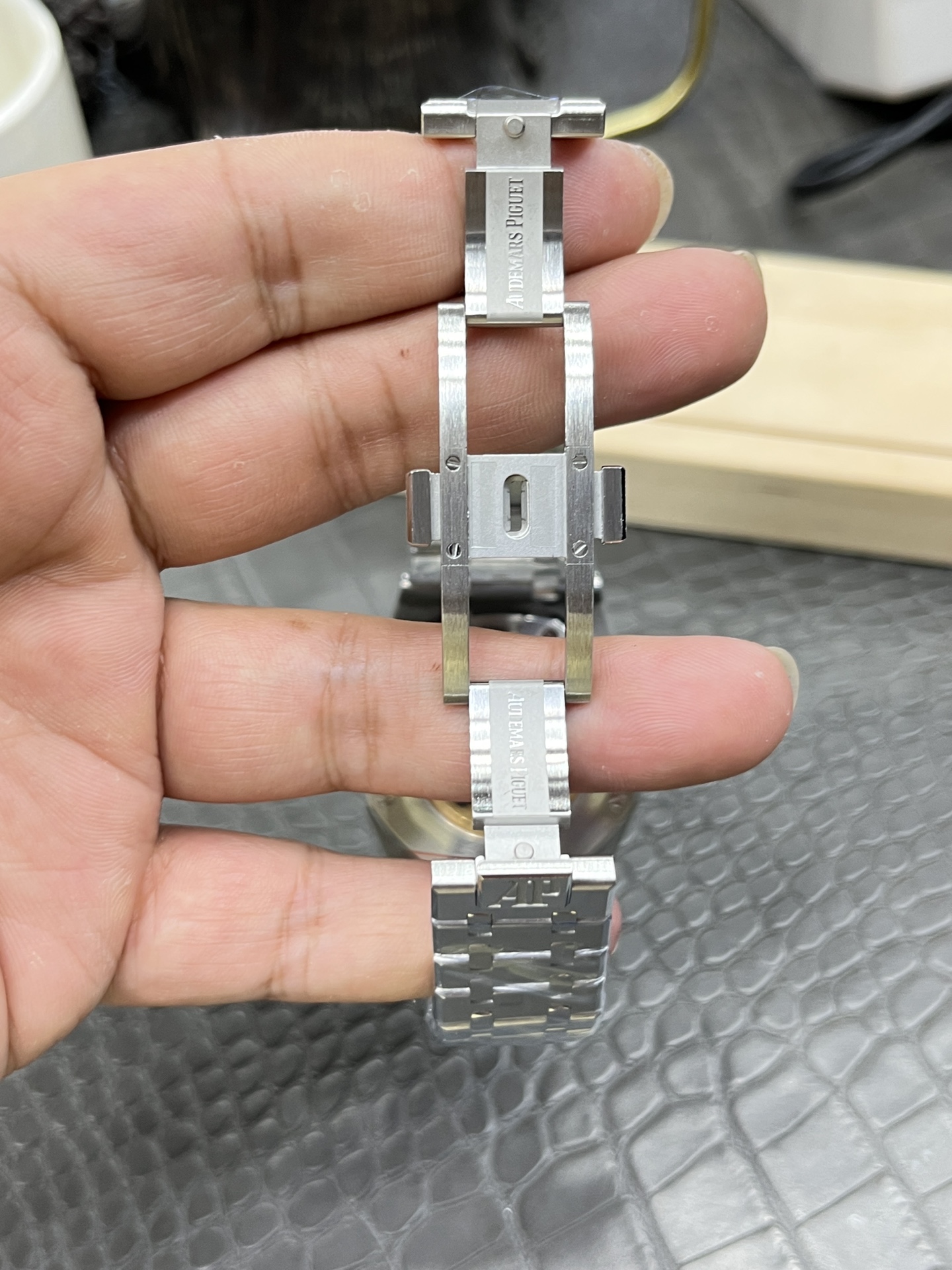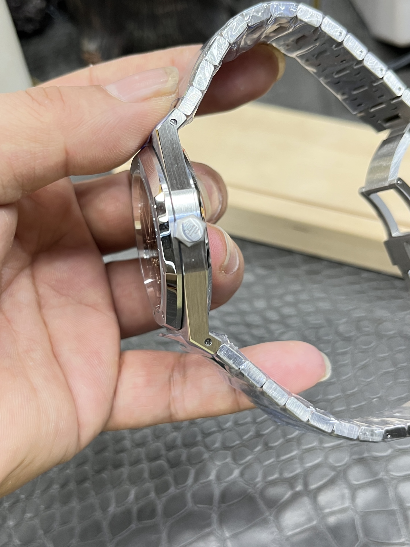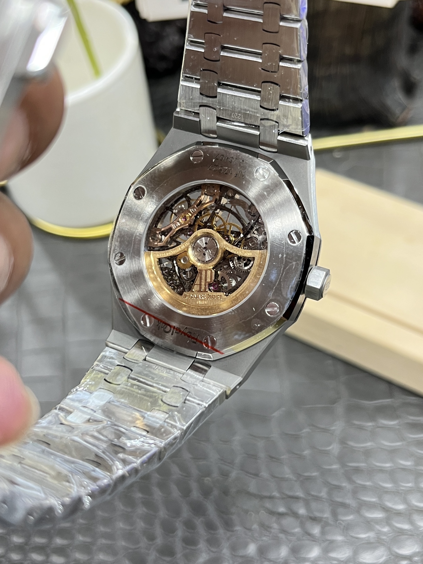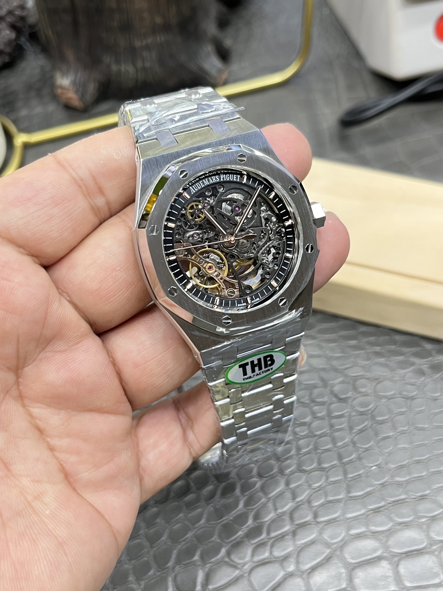这款手表是AAAAA 1:1 质量 (非常棒). 使用了和原版一模一样的材料. 商标部分也保持了和爱彼/Audemars Piguet一样. 图片拍摄是实物手表拍摄, 您所收到的实物保证和我们图片一模一样.