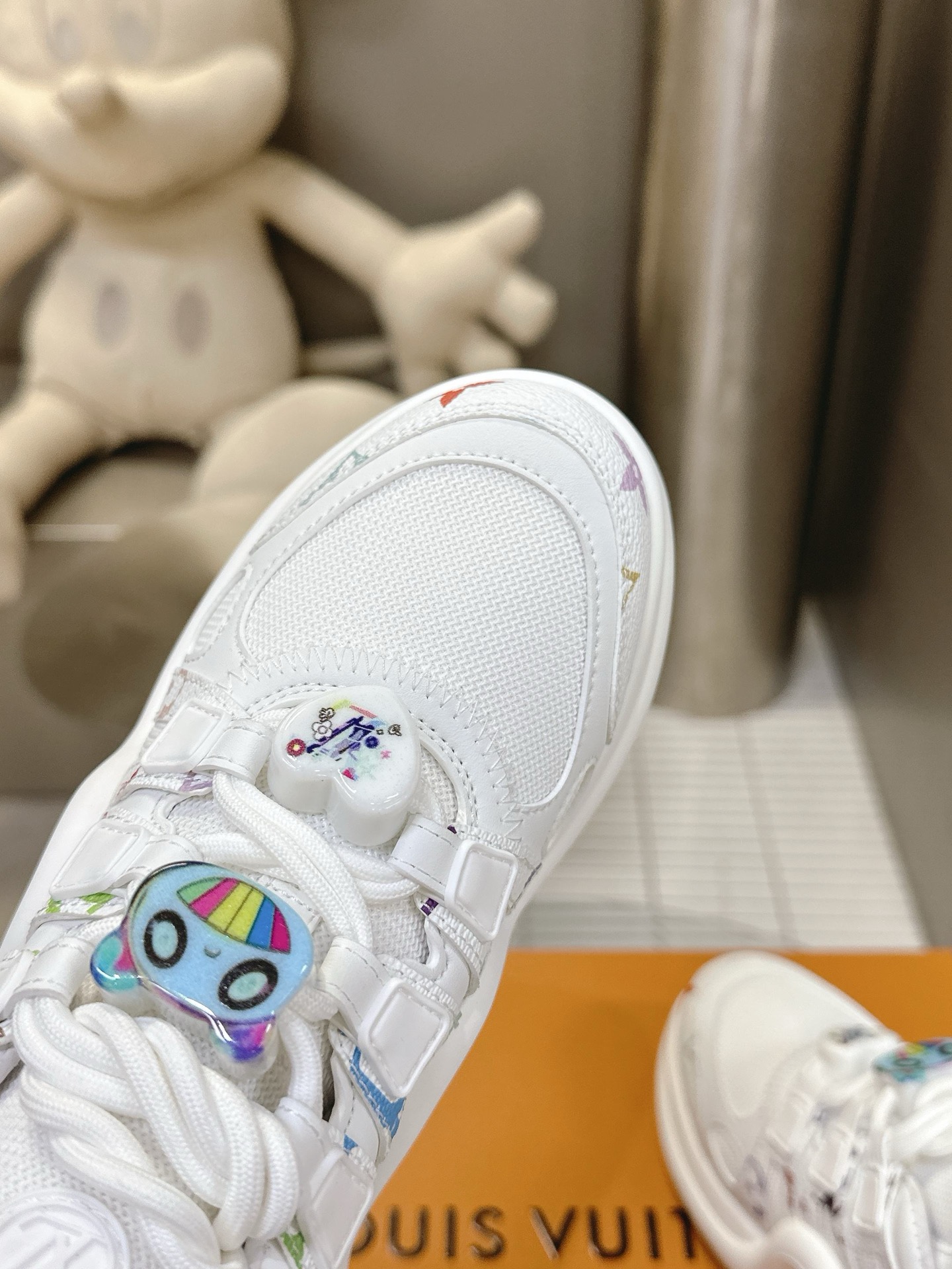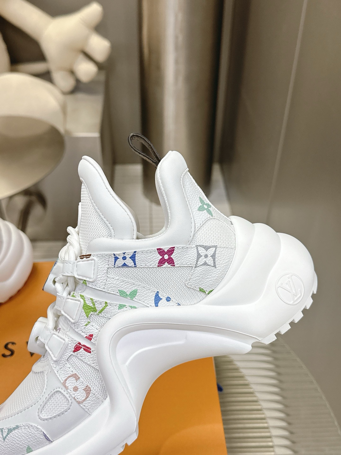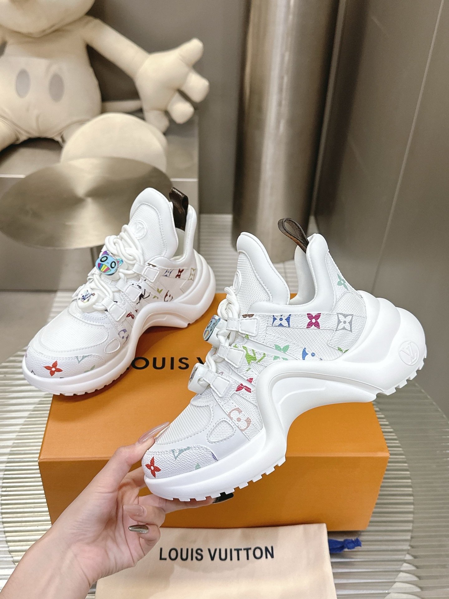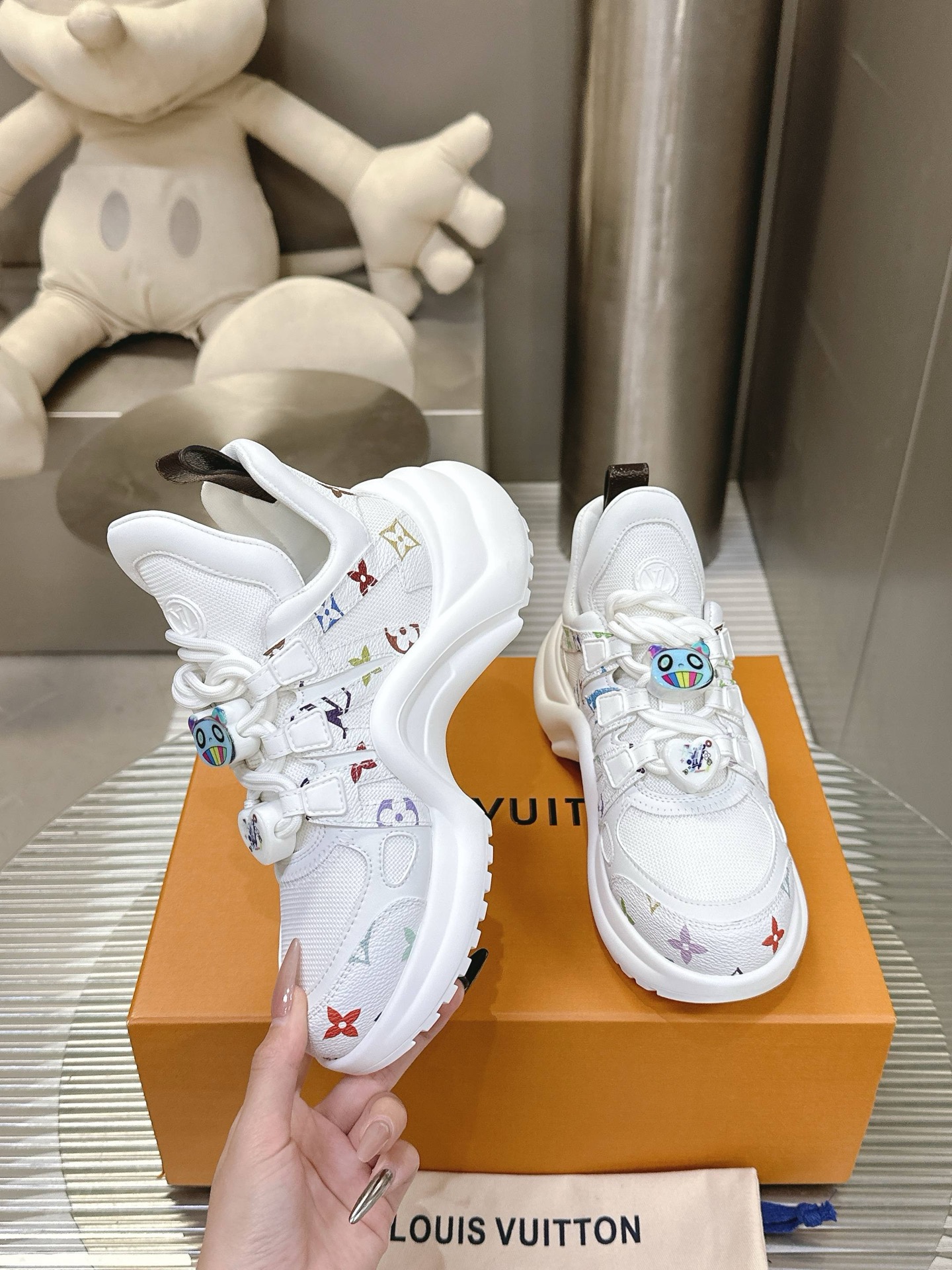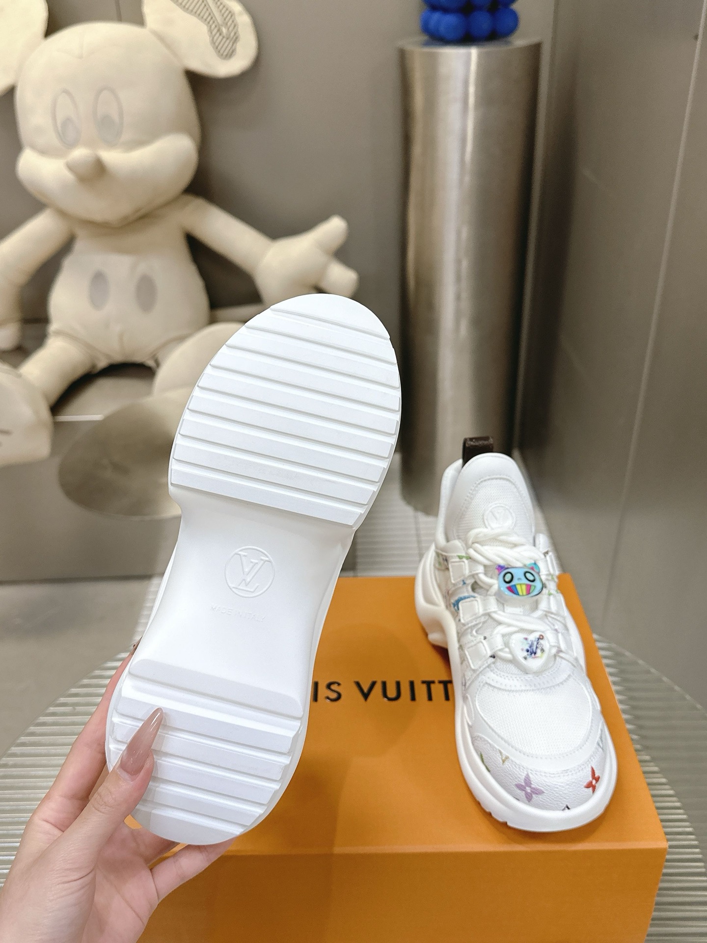 这款鞋子是AAAAA 1:1 质量 (非常棒). 使用了和原版一模一样的材料. 商标部分也保持了和路易威登/Louis Vuitton一样. 图片拍摄是实物鞋子拍摄, 您所收到的实物保证和我们图片一模一样.