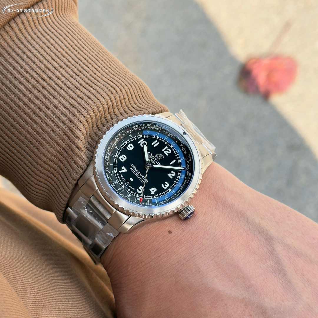 这款手表是AAAAA 1:1 质量 (非常棒). 使用了和原版一模一样的材料. 商标部分也保持了和Breitling一样. 图片拍摄是实物手表拍摄, 您所收到的实物保证和我们图片一模一样.