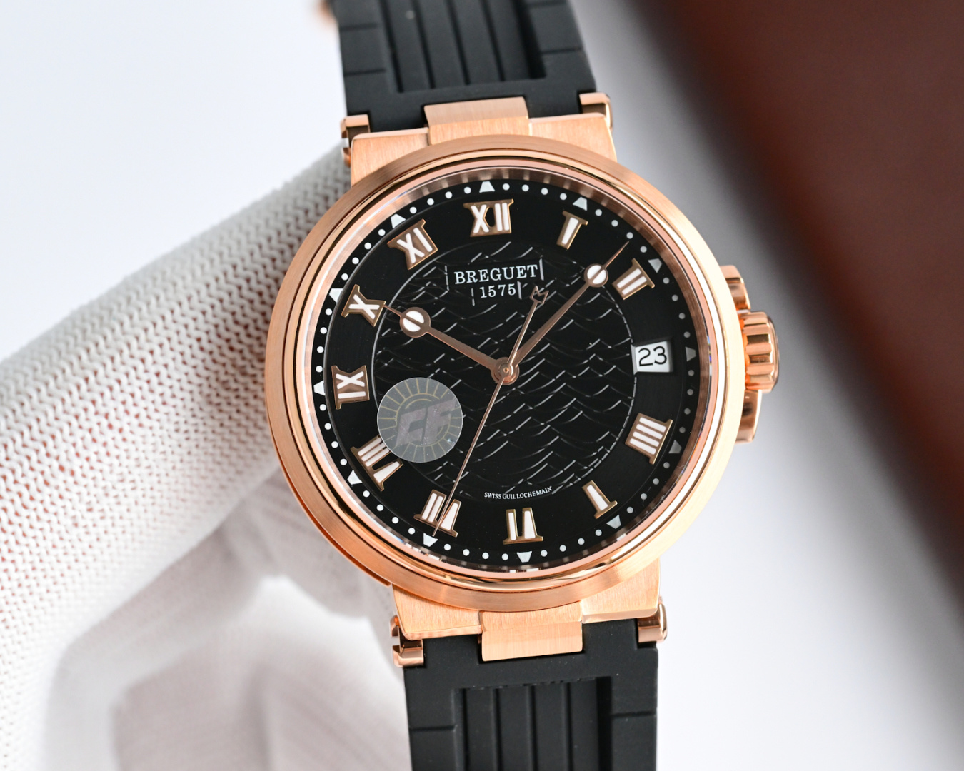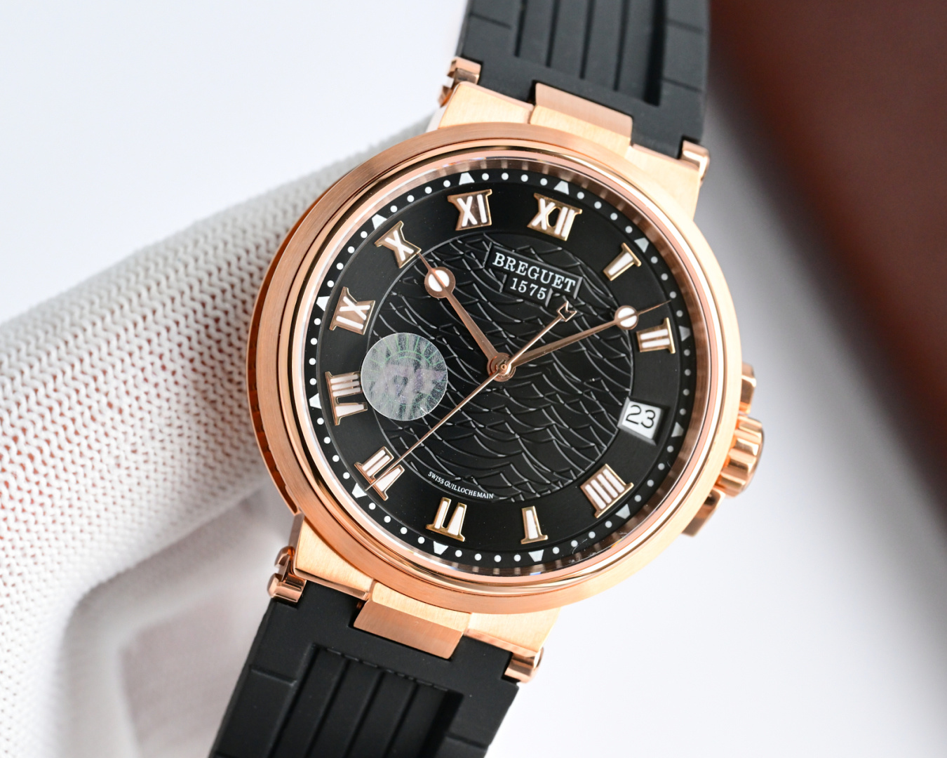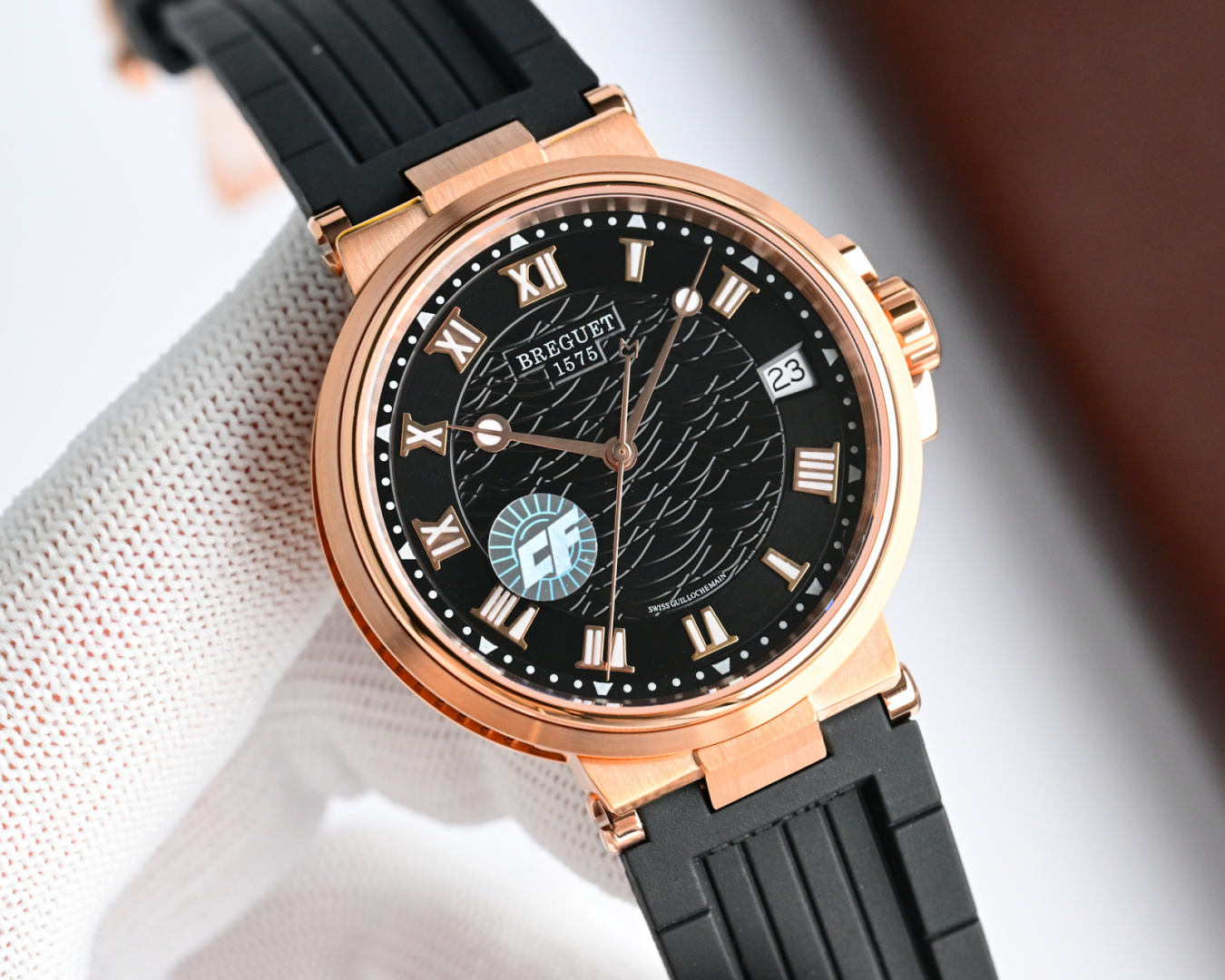 这款手表是AAAAA 1:1 质量 (非常棒). 使用了和原版一模一样的材料. 商标部分也保持了和Breguet一样. 图片拍摄是实物手表拍摄, 您所收到的实物保证和我们图片一模一样.