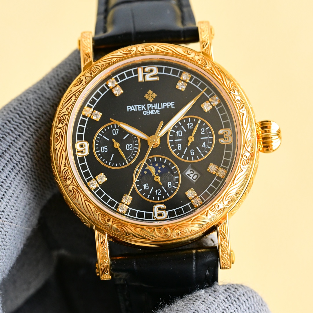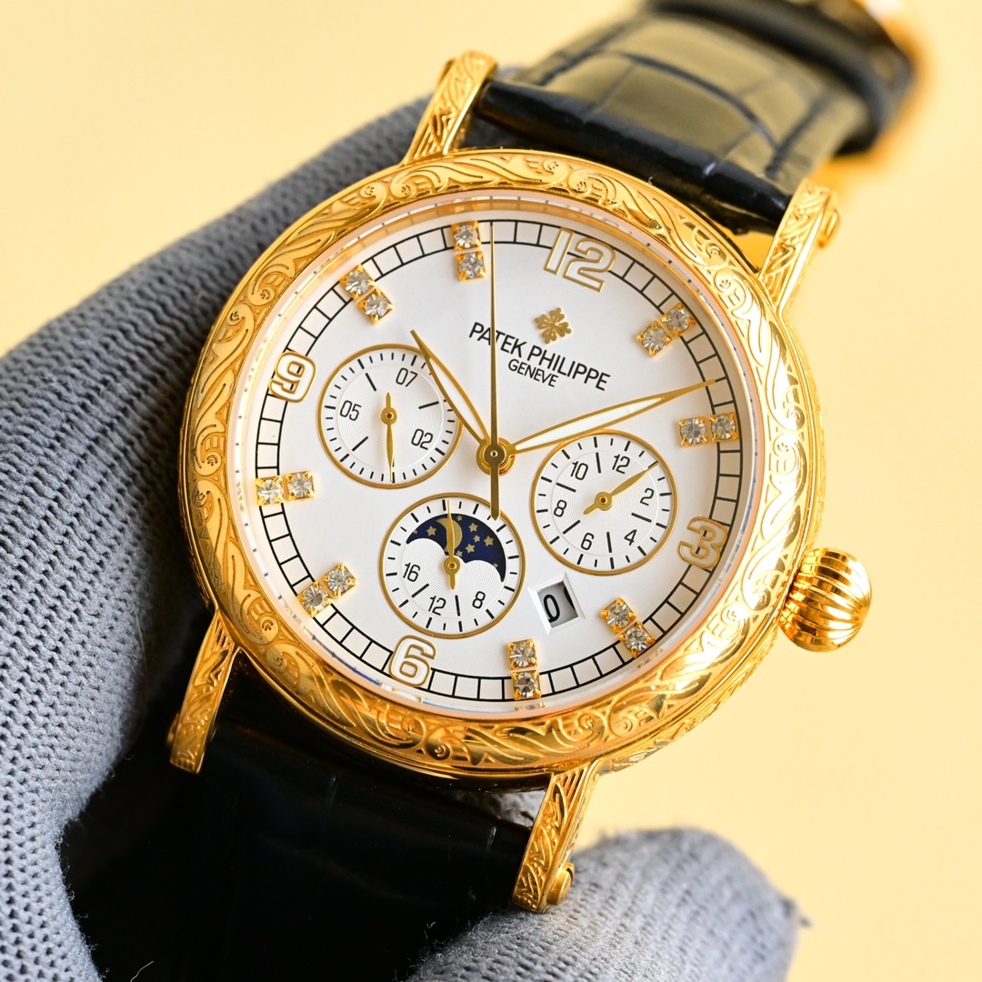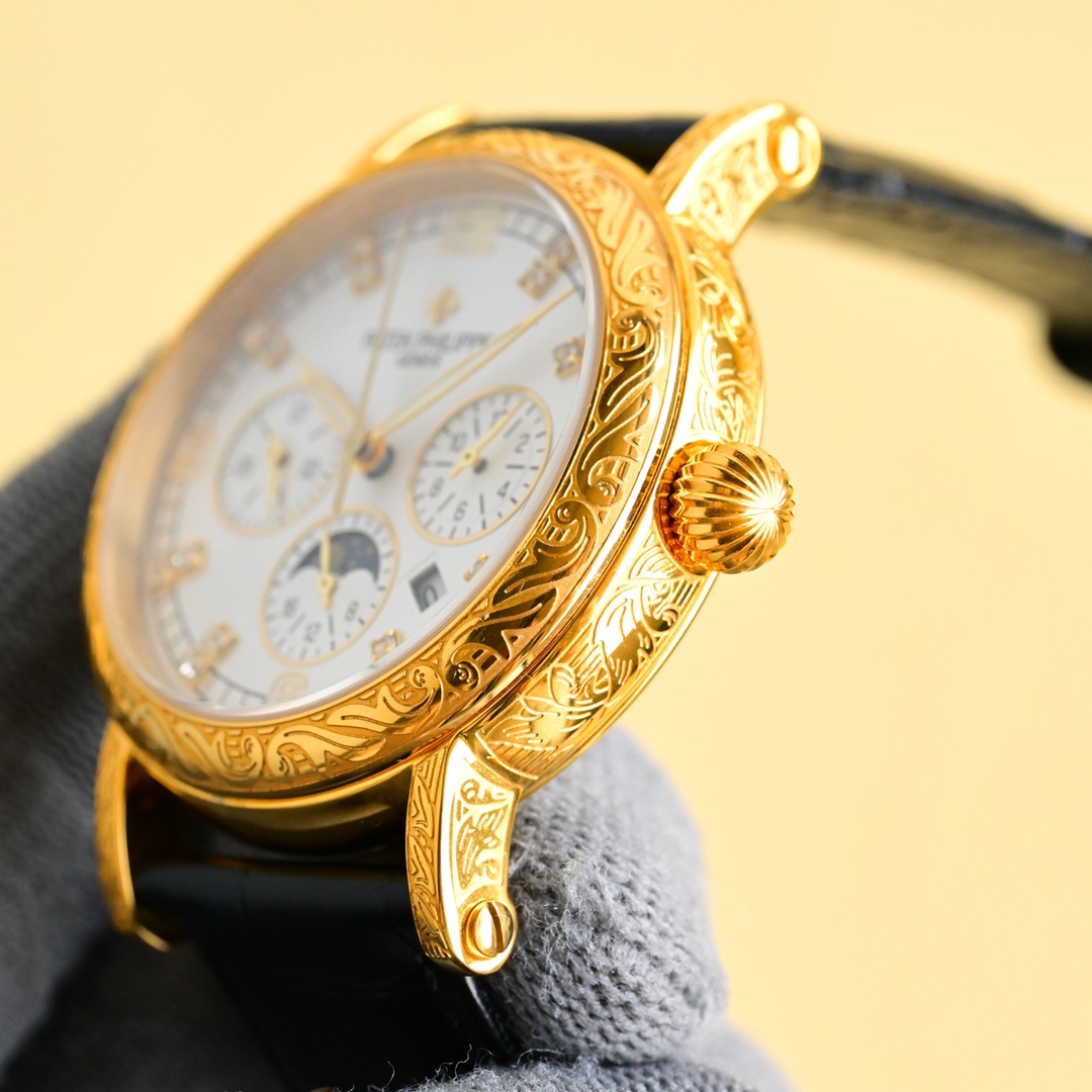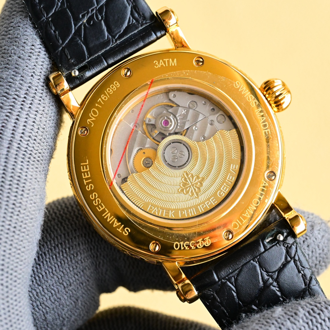 这款手表是AAAAA 1:1 质量 (非常棒). 使用了和原版一模一样的材料. 商标部分也保持了和百达翡丽/Patek Philippe一样. 图片拍摄是实物手表拍摄, 您所收到的实物保证和我们图片一模一样.