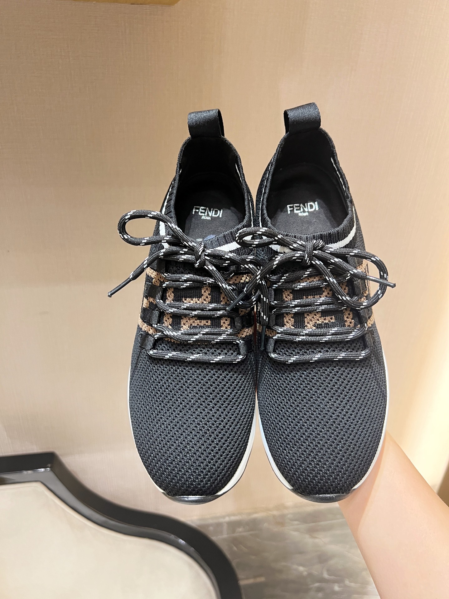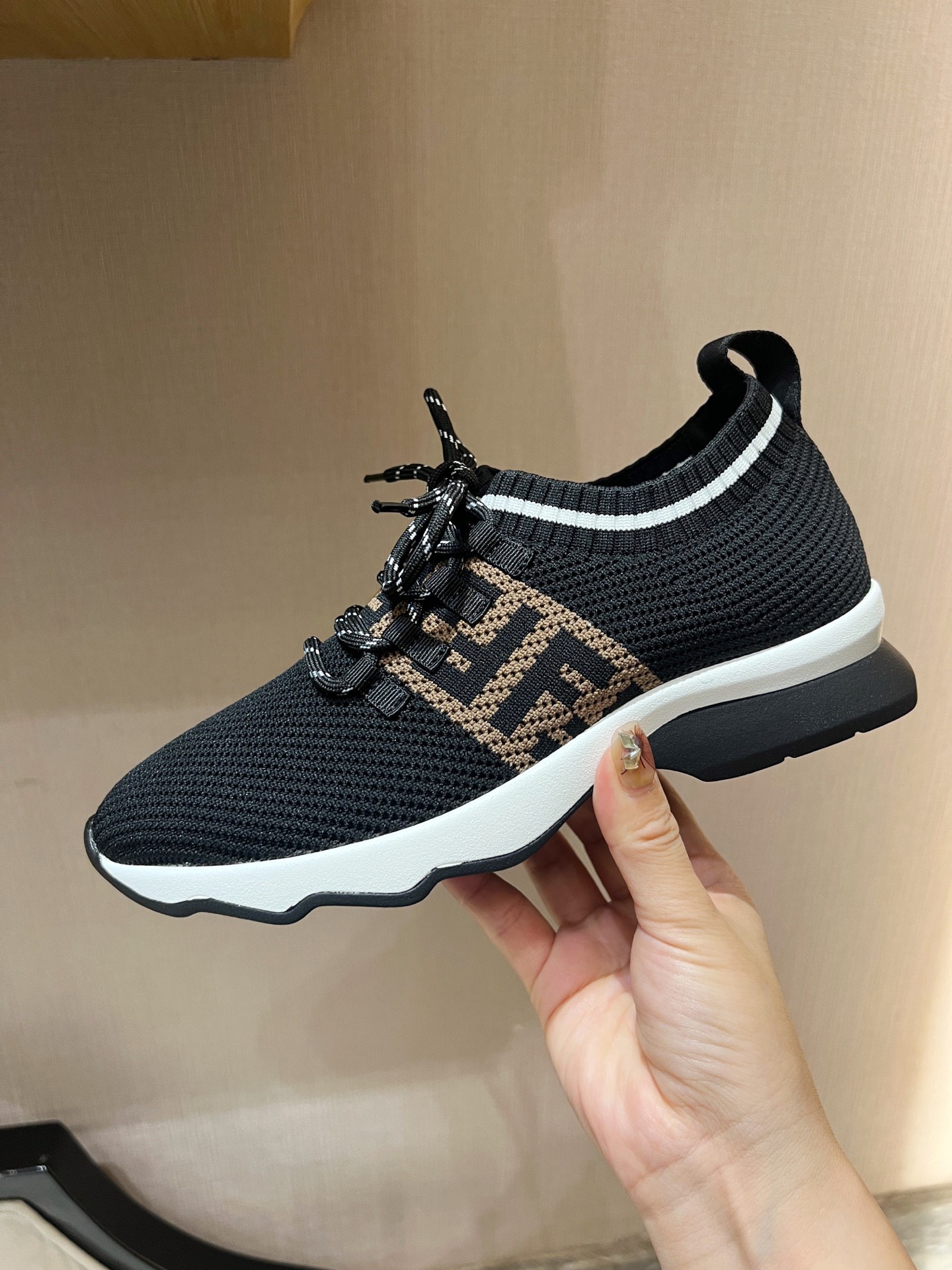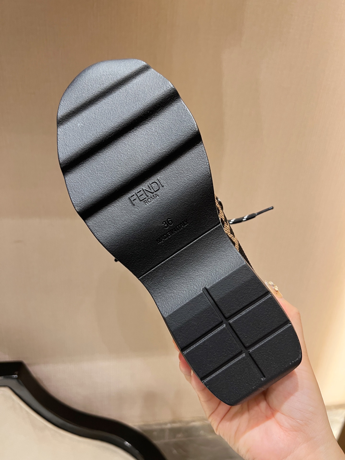 这款鞋子是AAAAA 1:1 质量 (非常棒). 使用了和原版一模一样的材料. 商标部分也保持了和芬迪/Fendi一样. 图片拍摄是实物鞋子拍摄, 您所收到的实物保证和我们图片一模一样.