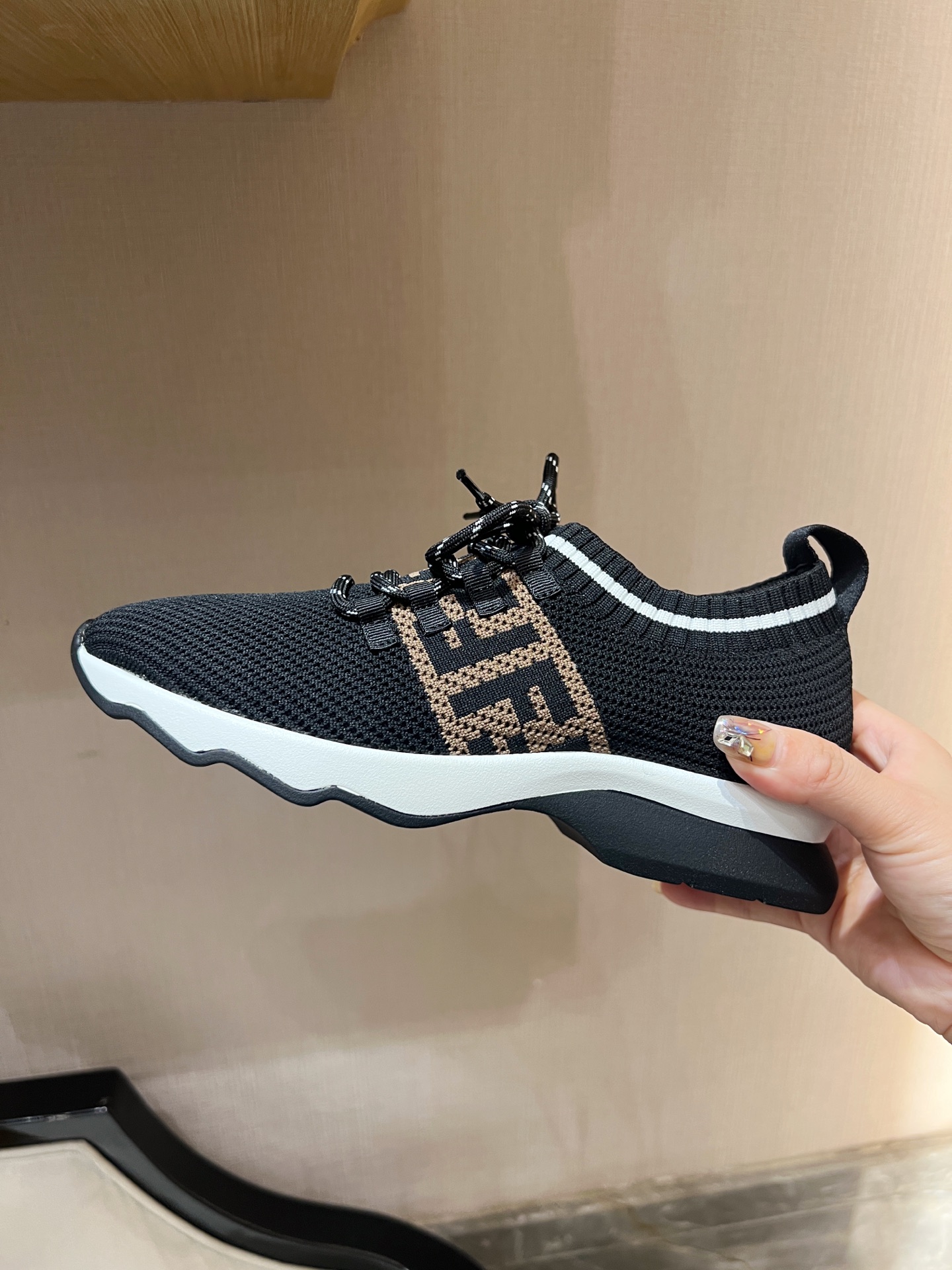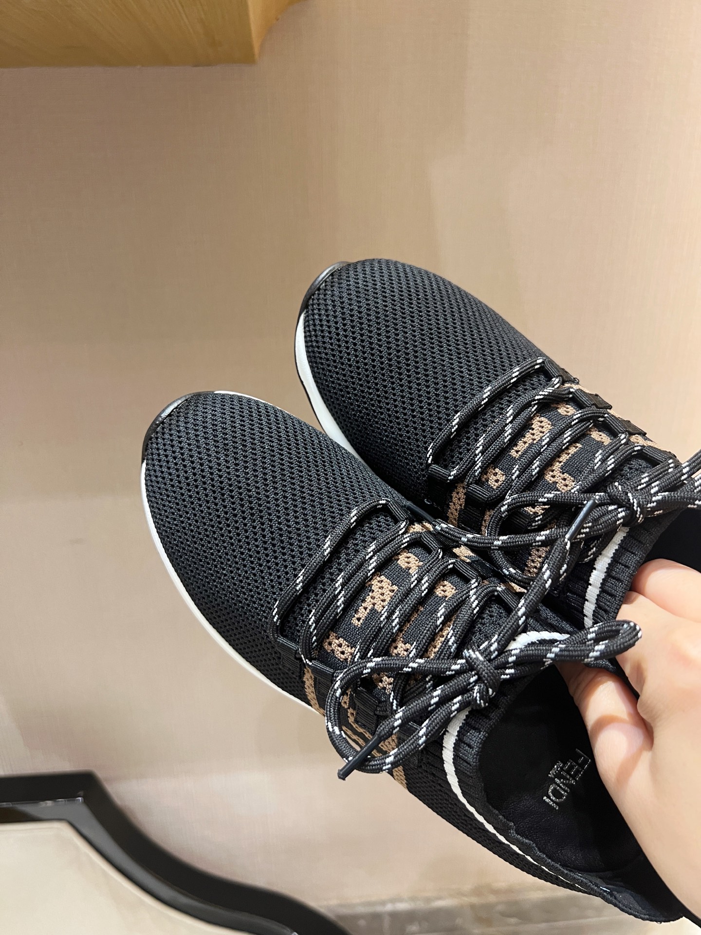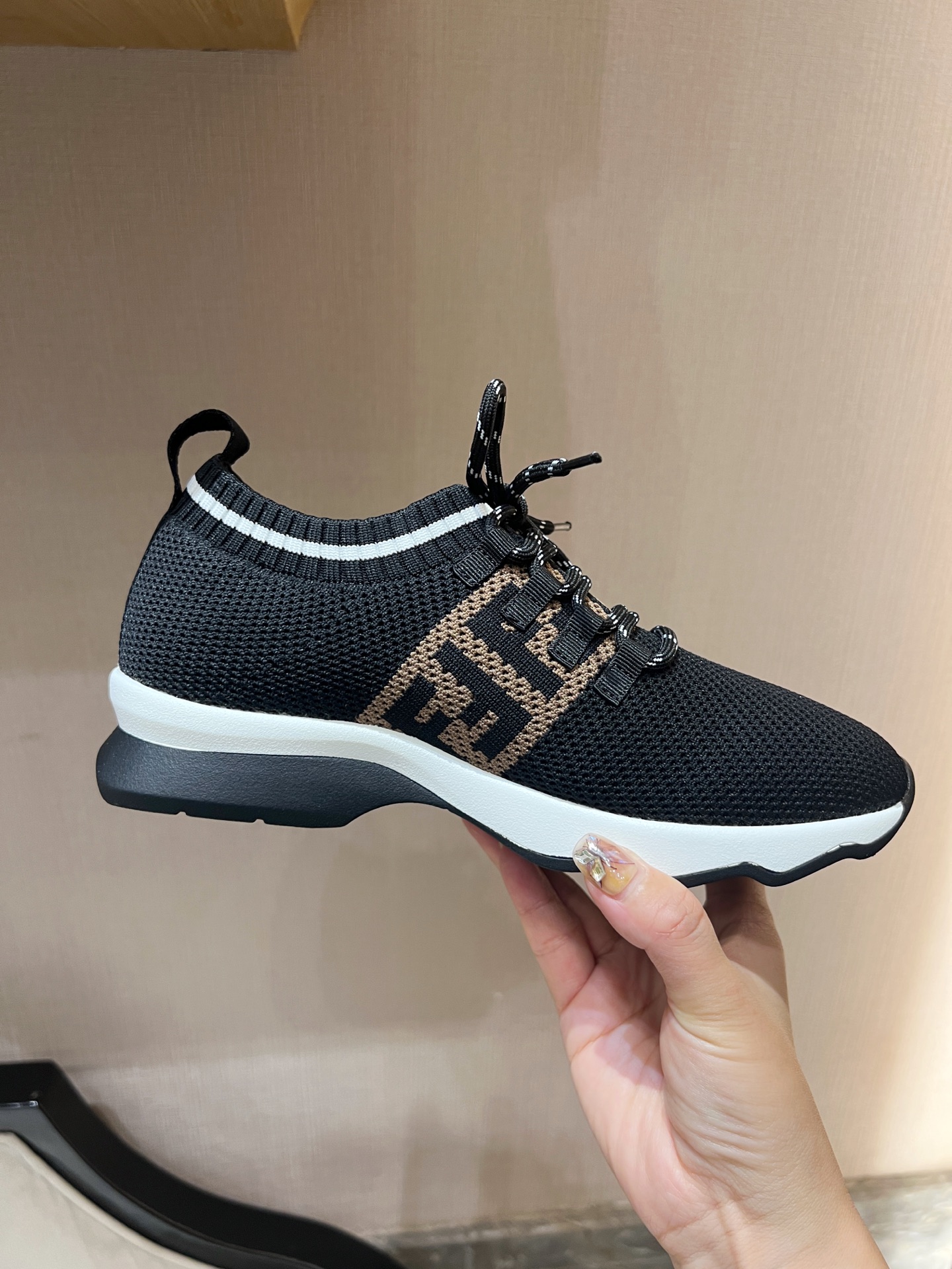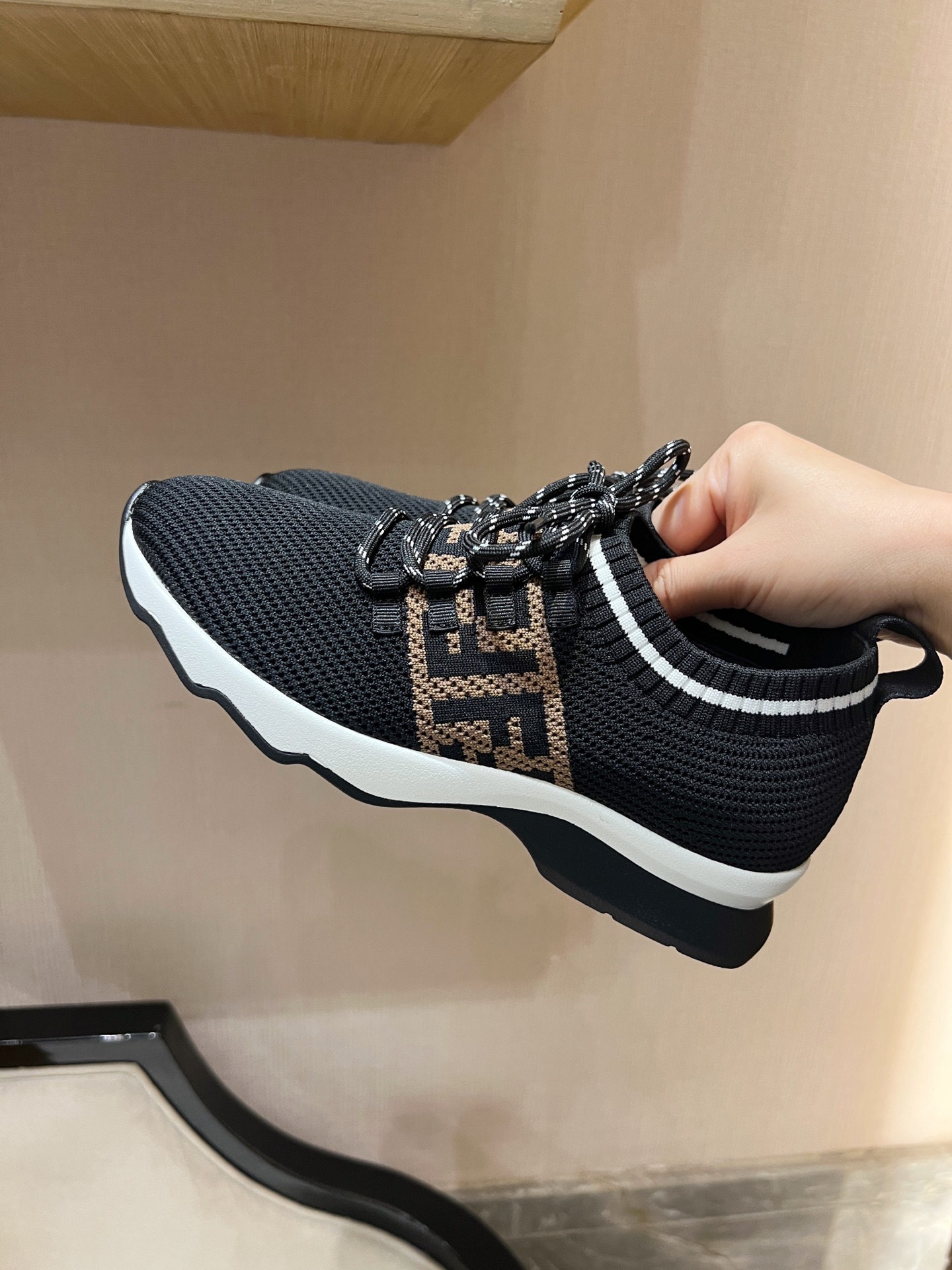 这款鞋子是AAAAA 1:1 质量 (非常棒). 使用了和原版一模一样的材料. 商标部分也保持了和芬迪/Fendi一样. 图片拍摄是实物鞋子拍摄, 您所收到的实物保证和我们图片一模一样.