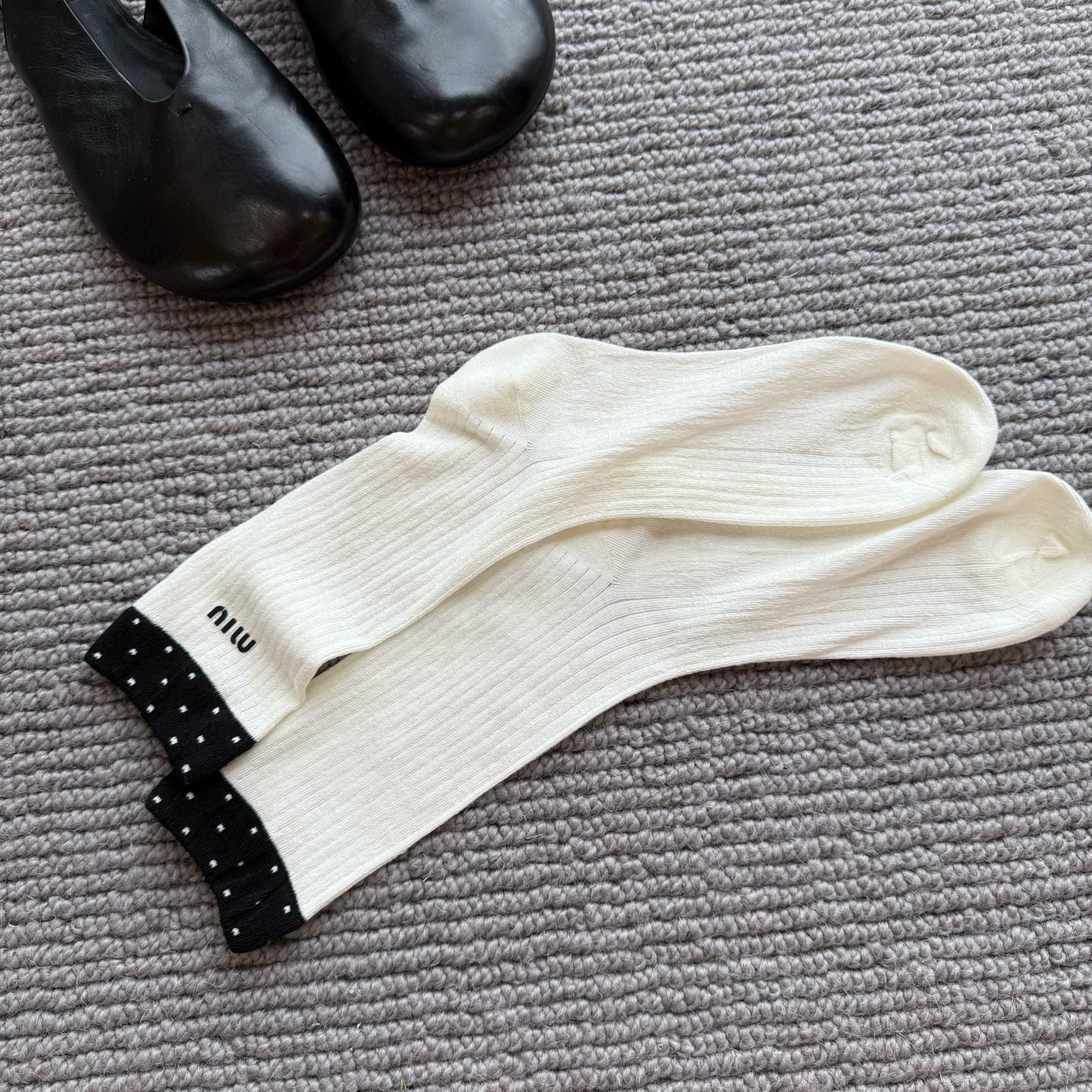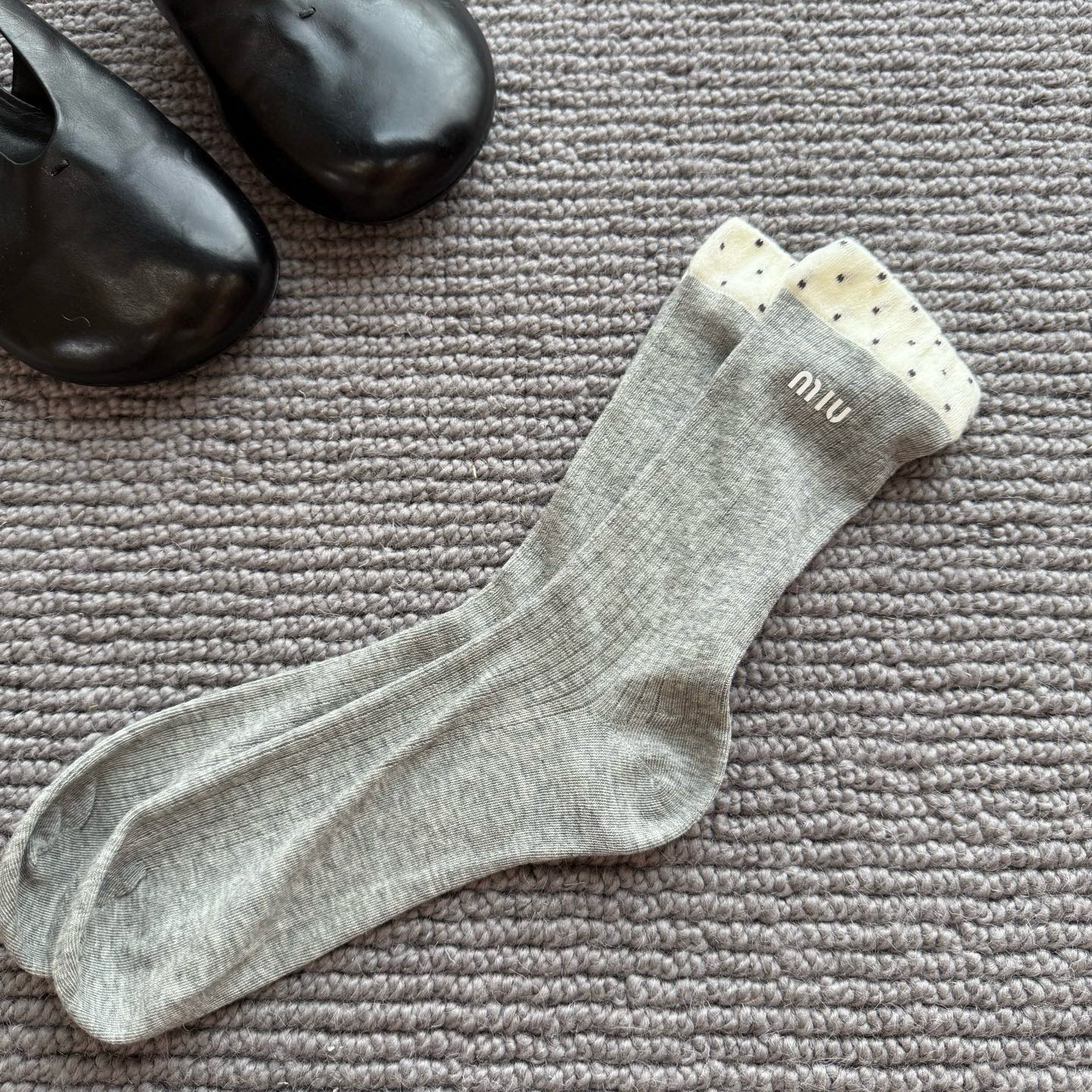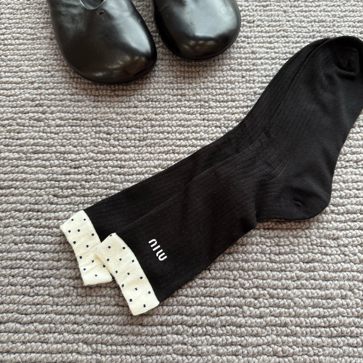 这款sock是AAAAA 1:1 质量 (非常棒). 使用了和原版一模一样的材料. 商标部分也保持了和缪缪/Miu Miu一样. 图片拍摄是实物sock拍摄, 您所收到的实物保证和我们图片一模一样.