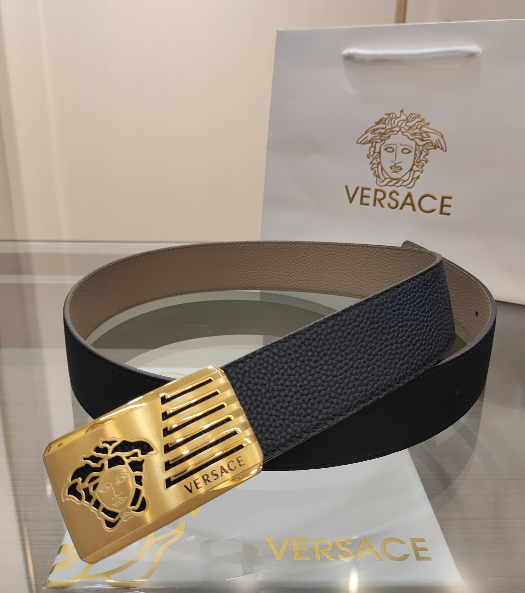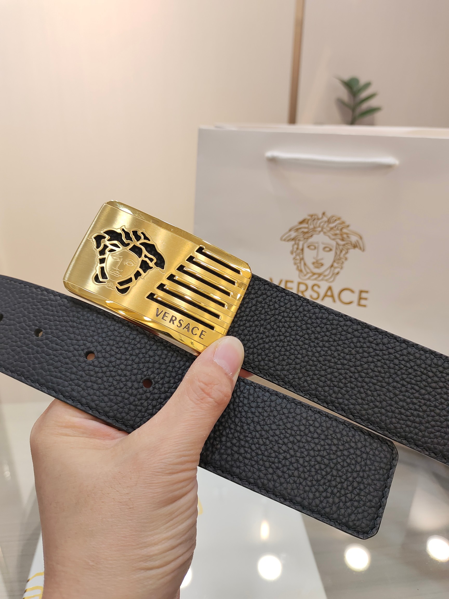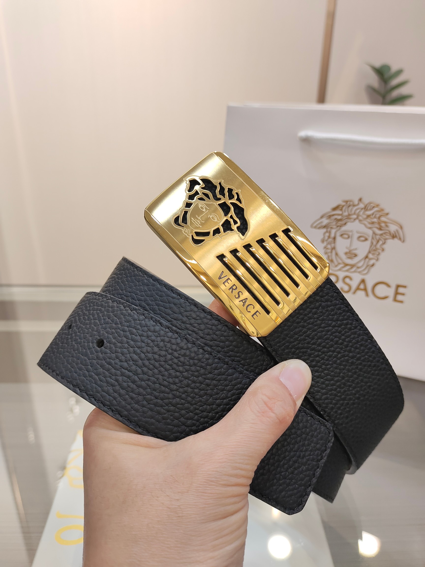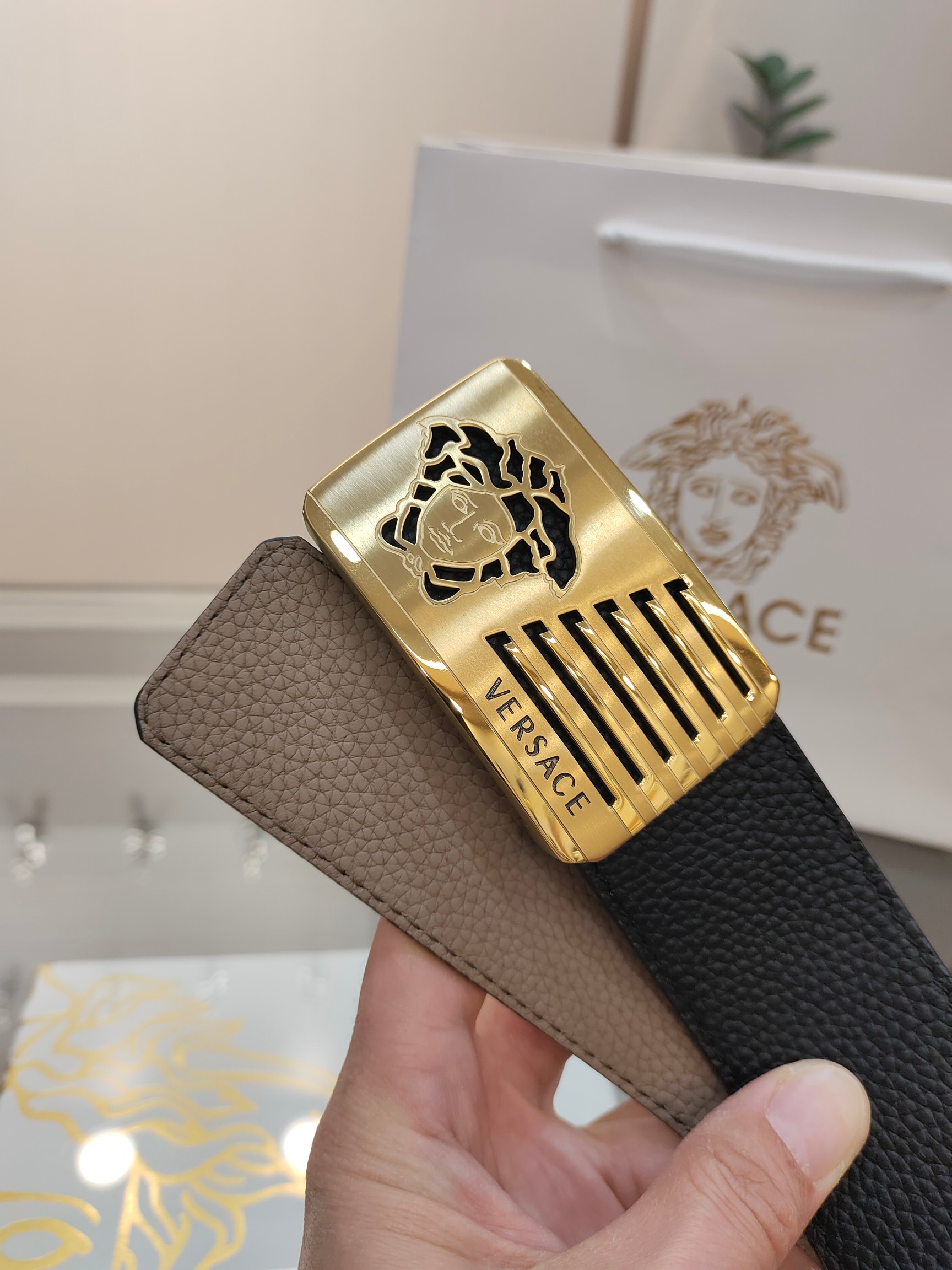 这款皮带是AAAAA 1:1 质量 (非常棒). 使用了和原版一模一样的材料. 商标部分也保持了和范思哲/Versace一样. 图片拍摄是实物皮带拍摄, 您所收到的实物保证和我们图片一模一样.