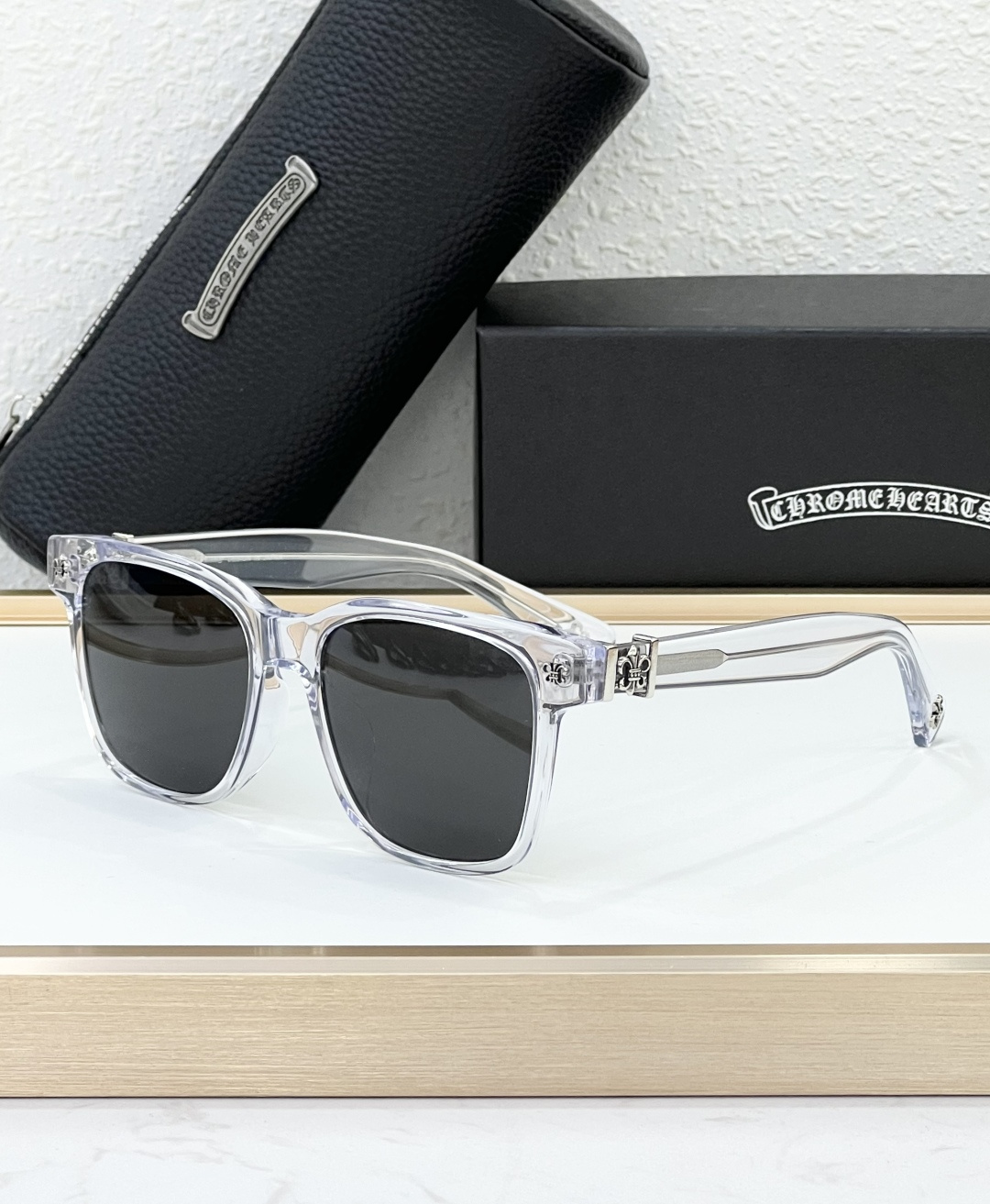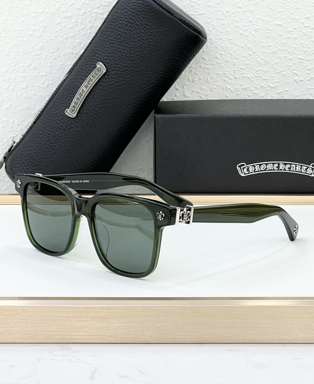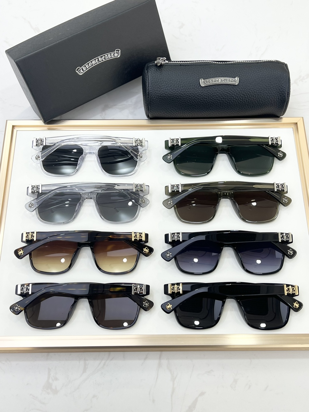这款太阳眼镜是AAAAA 1:1 质量 (非常棒). 使用了和原版一模一样的材料. 商标部分也保持了和克罗心/Chrome Hearts一样. 图片拍摄是实物太阳眼镜拍摄, 您所收到的实物保证和我们图片一模一样.