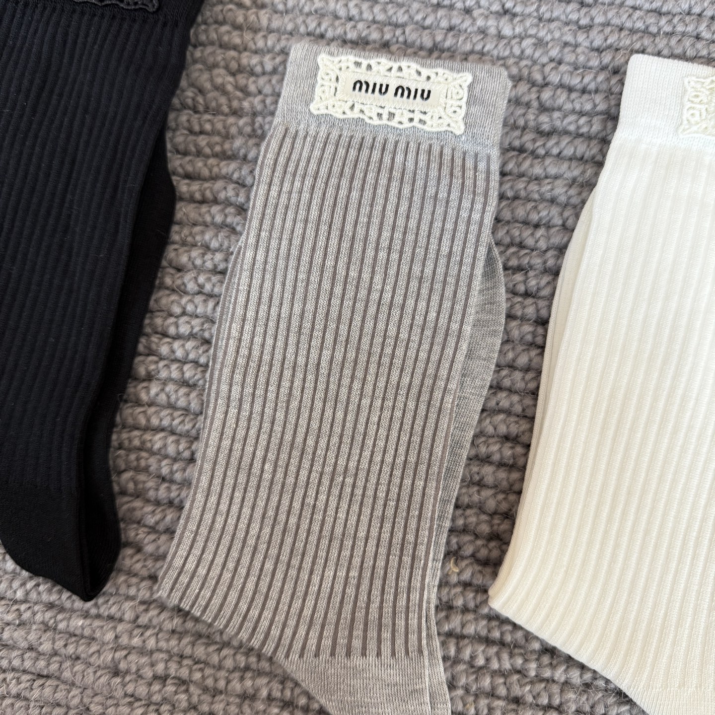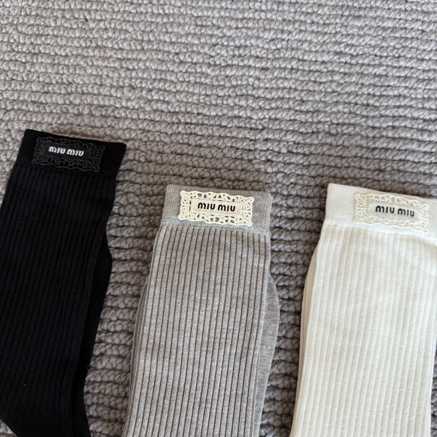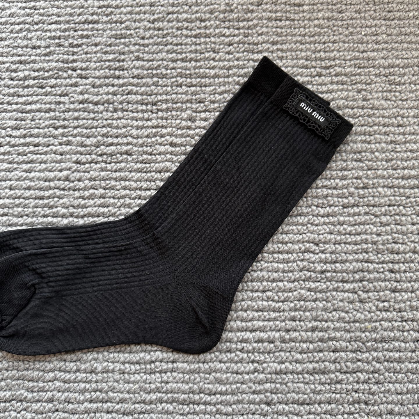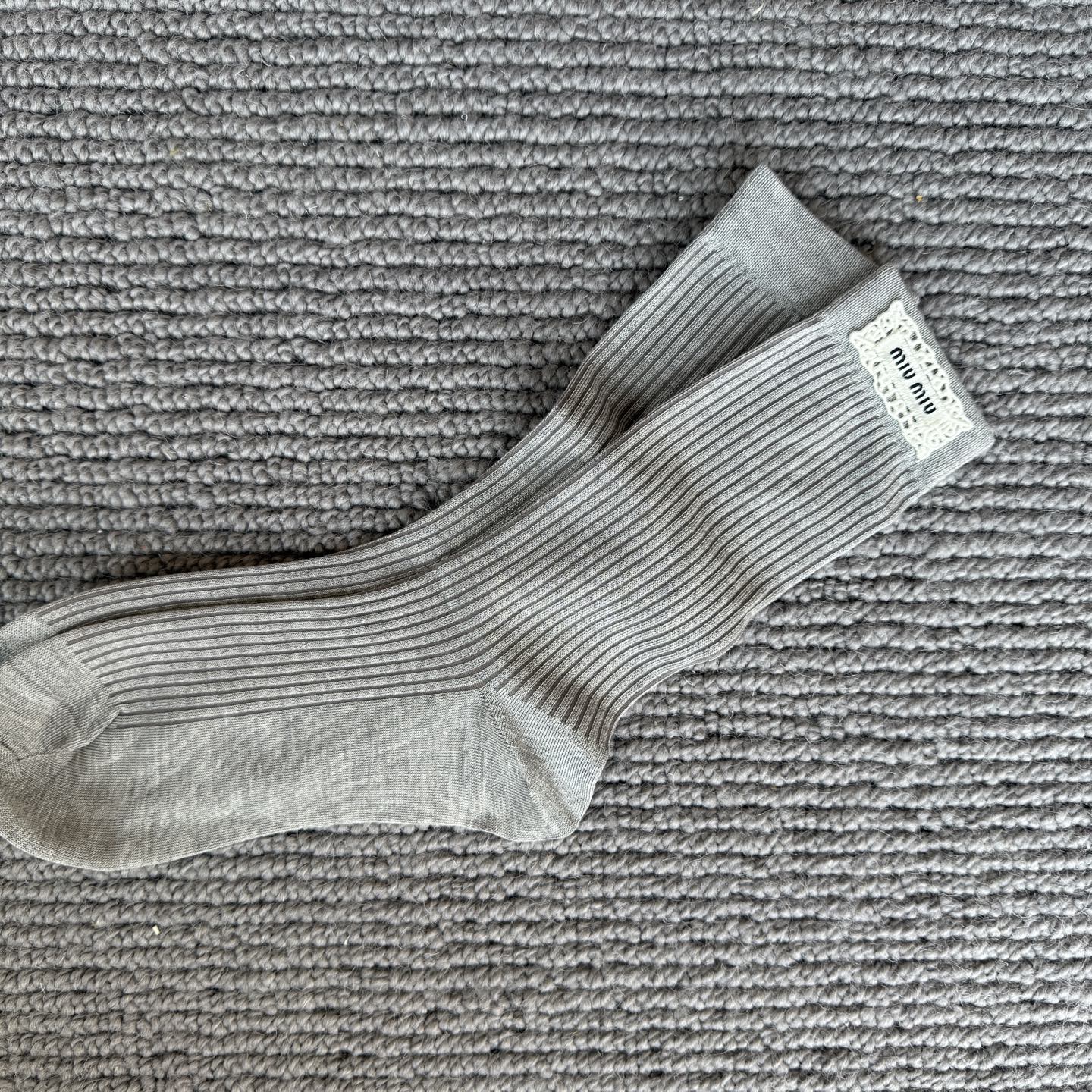 这款sock是AAAAA 1:1 质量 (非常棒). 使用了和原版一模一样的材料. 商标部分也保持了和缪缪/Miu Miu一样. 图片拍摄是实物sock拍摄, 您所收到的实物保证和我们图片一模一样.