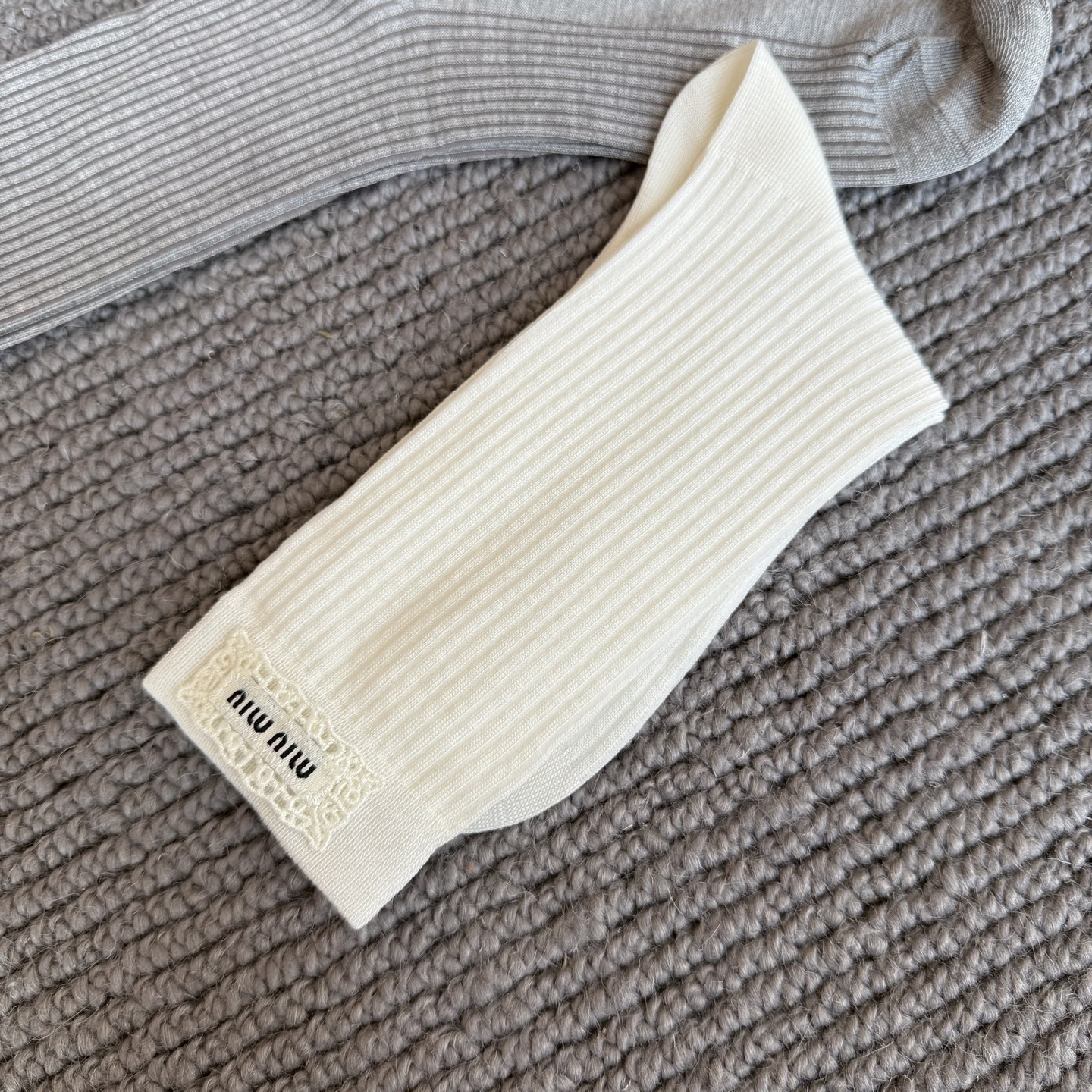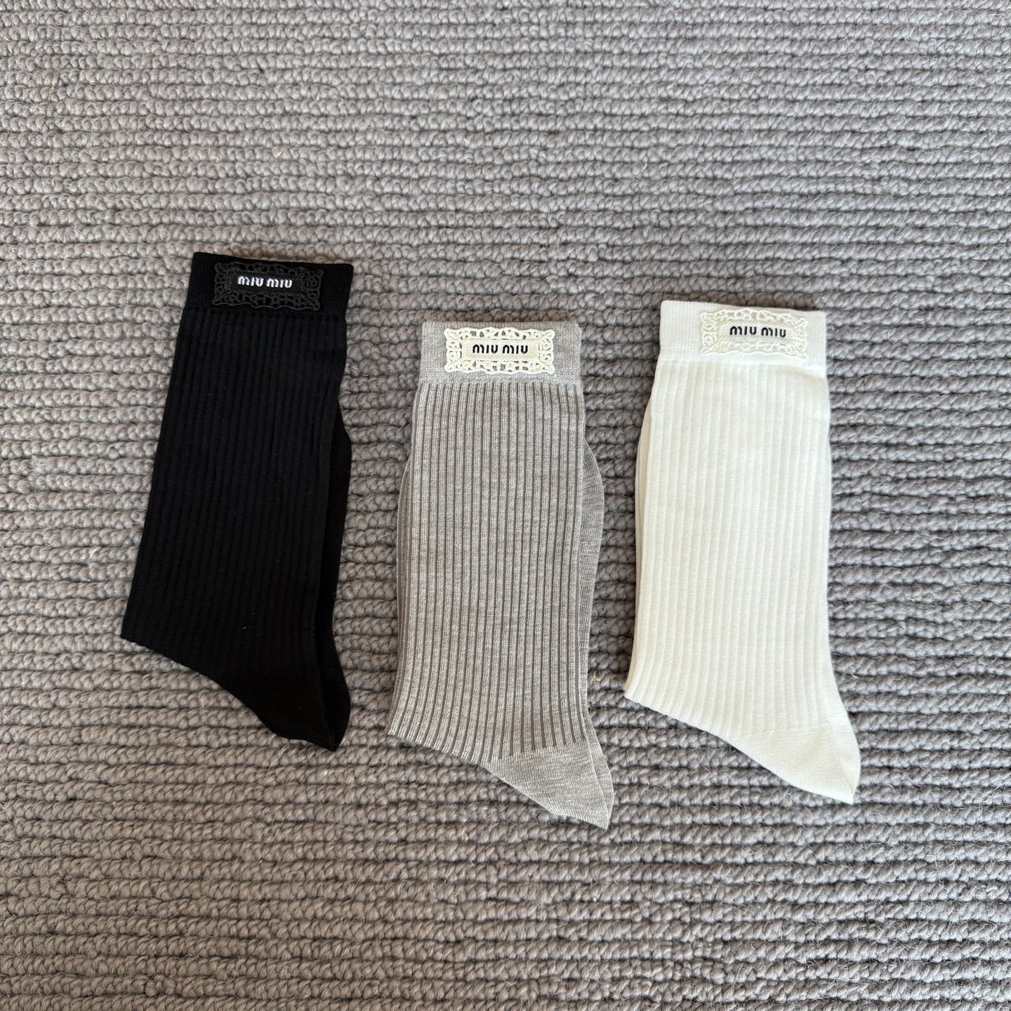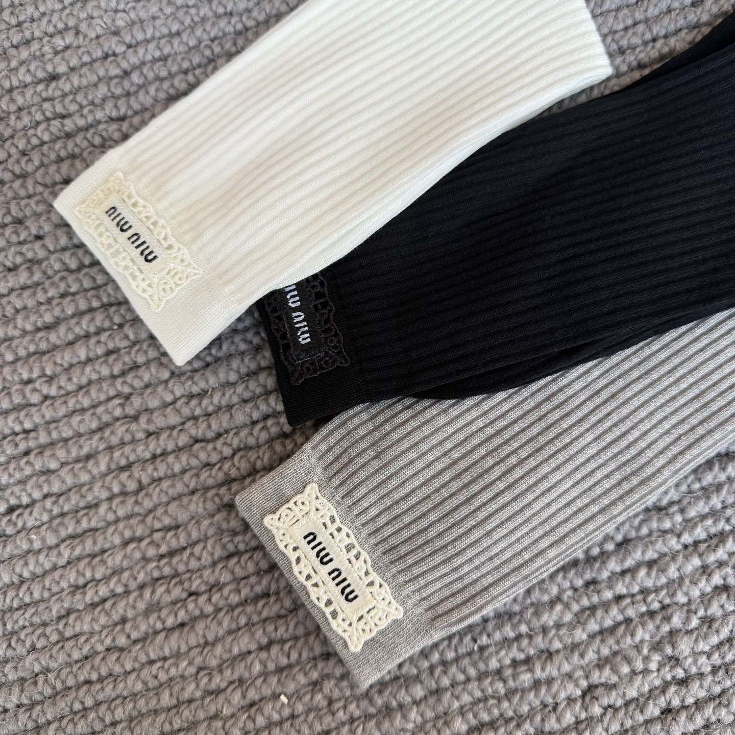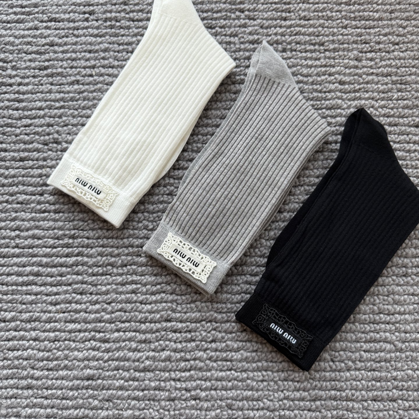 这款sock是AAAAA 1:1 质量 (非常棒). 使用了和原版一模一样的材料. 商标部分也保持了和缪缪/Miu Miu一样. 图片拍摄是实物sock拍摄, 您所收到的实物保证和我们图片一模一样.