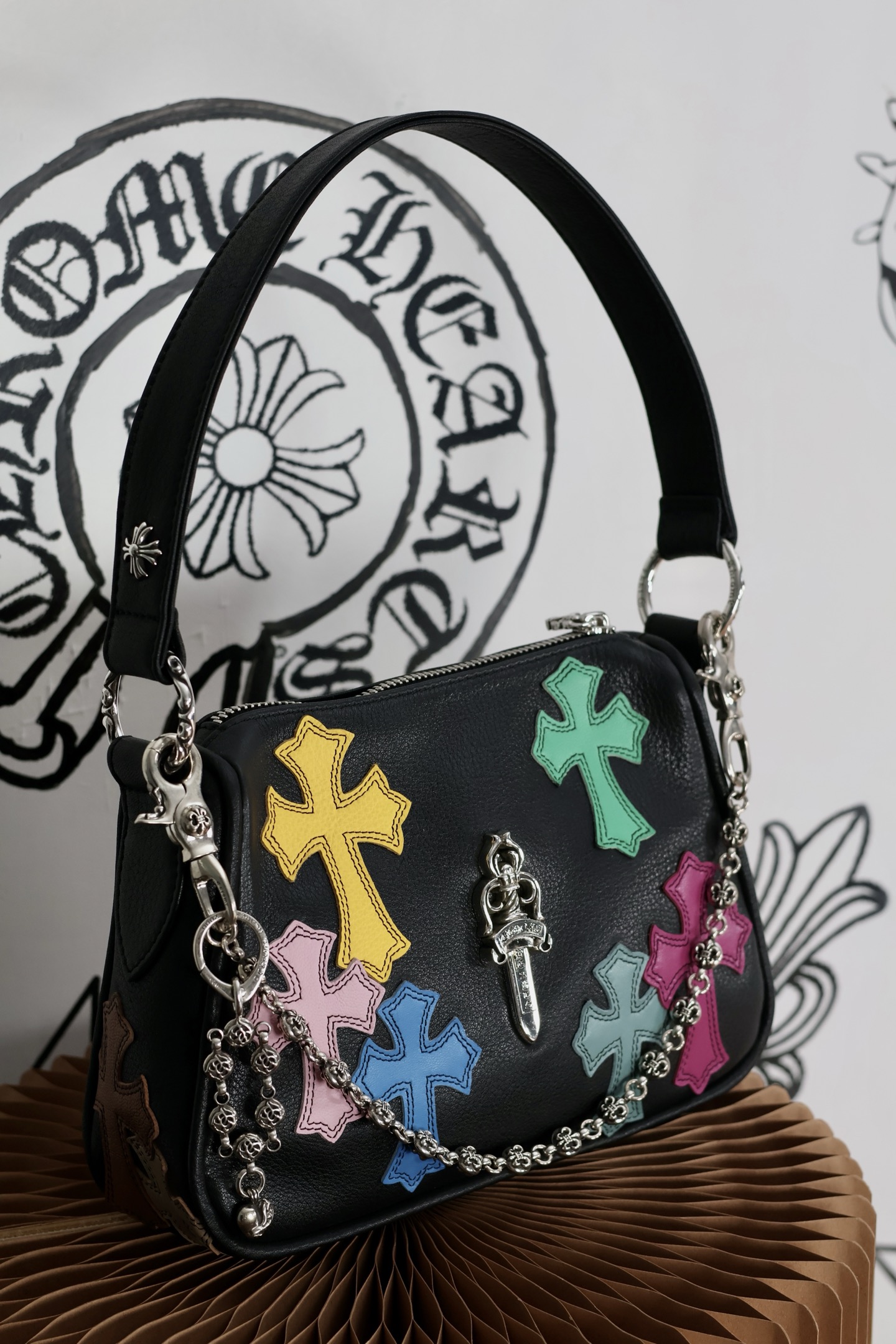 这款包包是AAAAA 1:1 质量 (非常棒). 使用了和原版一模一样的材料. 商标部分也保持了和克罗心/Chrome Hearts一样. 图片拍摄是实物包包拍摄, 您所收到的实物保证和我们图片一模一样.