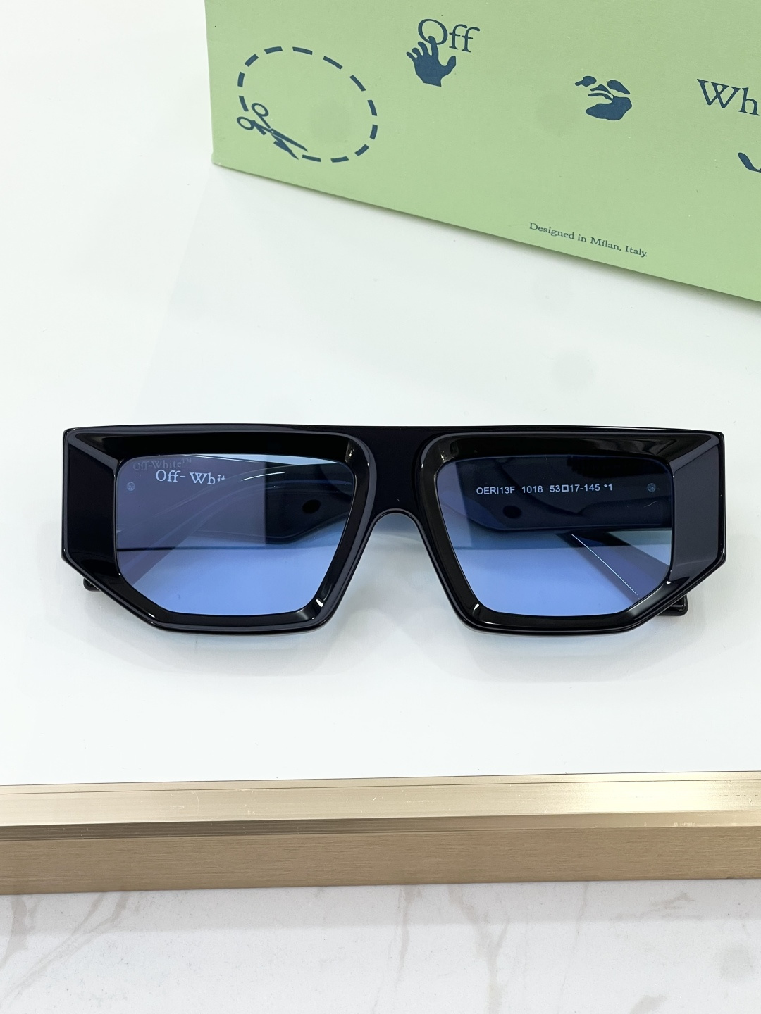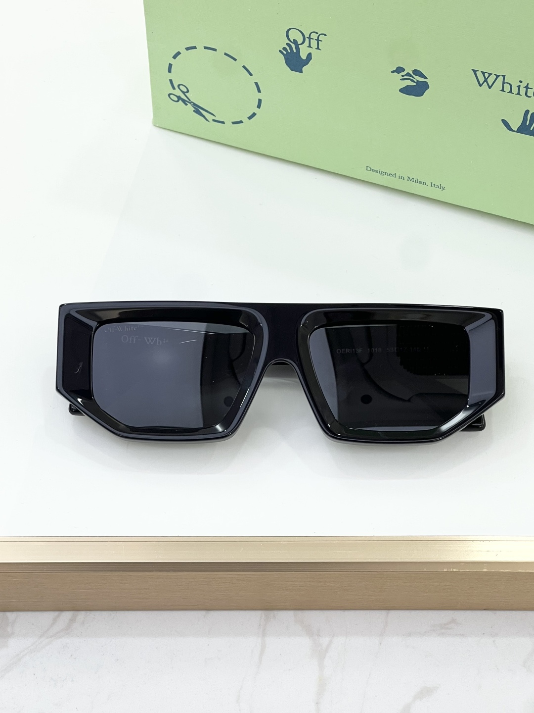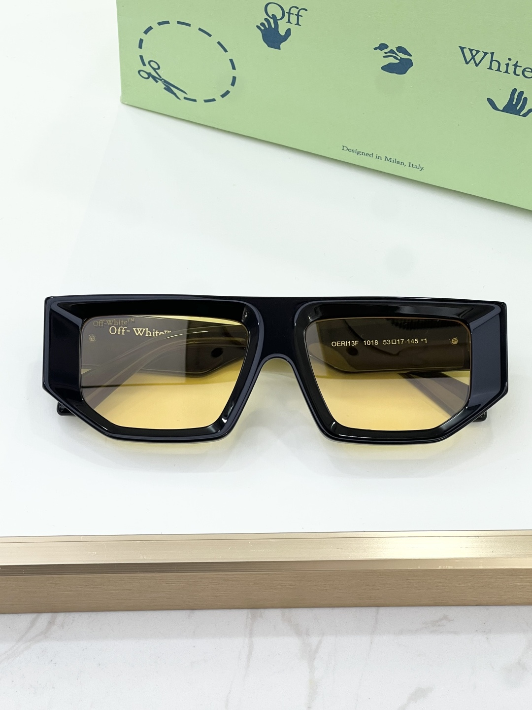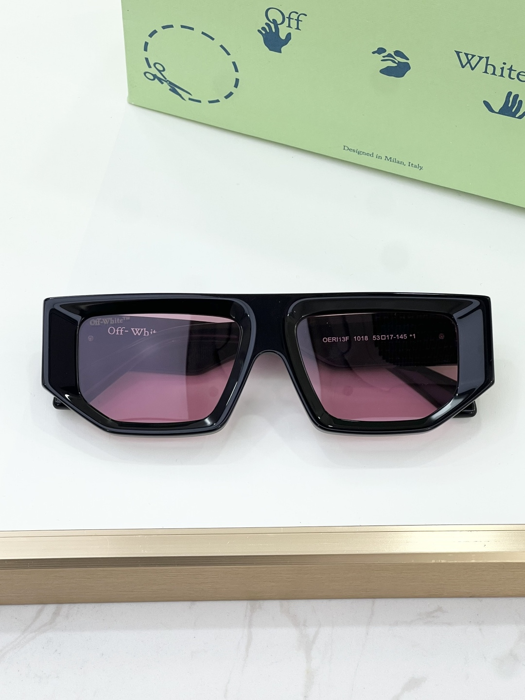 这款太阳眼镜是AAAAA 1:1 质量 (非常棒). 使用了和原版一模一样的材料. 商标部分也保持了和OFF WHITE一样. 图片拍摄是实物太阳眼镜拍摄, 您所收到的实物保证和我们图片一模一样.