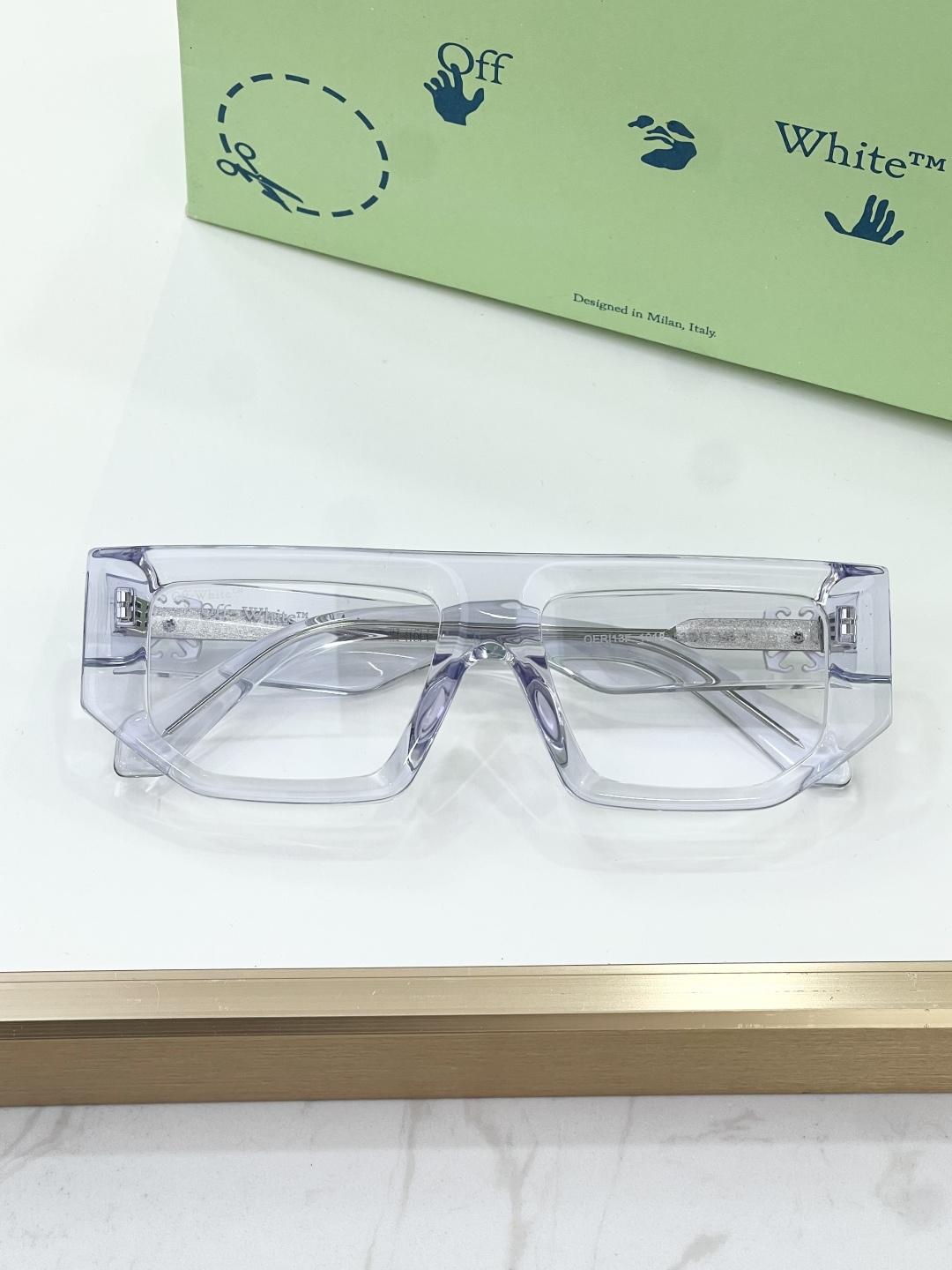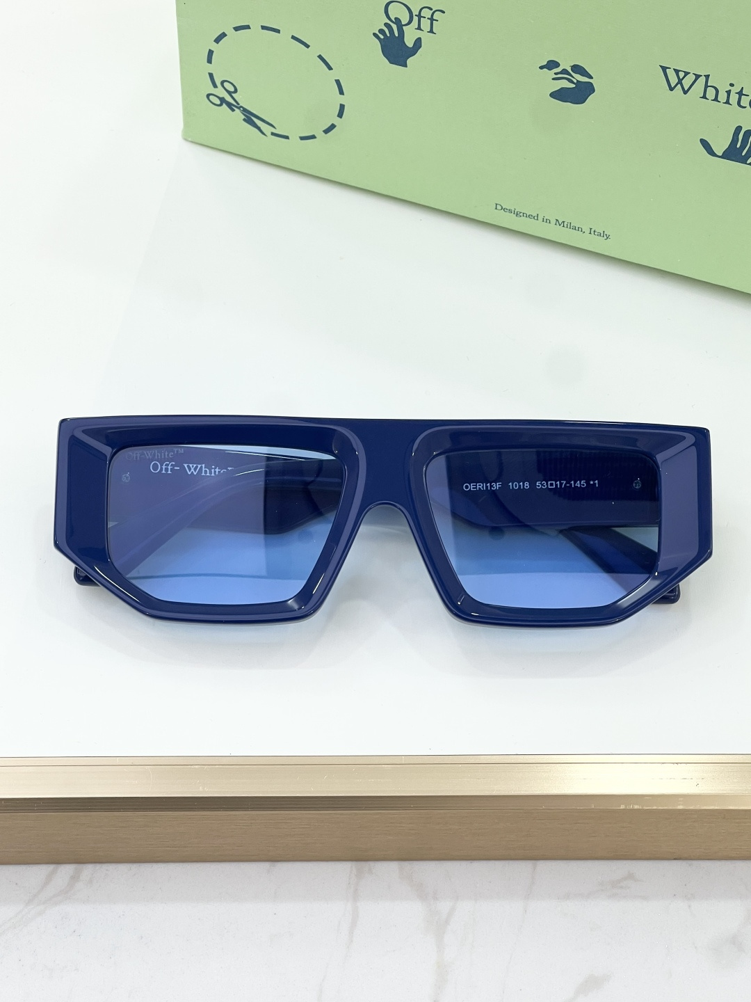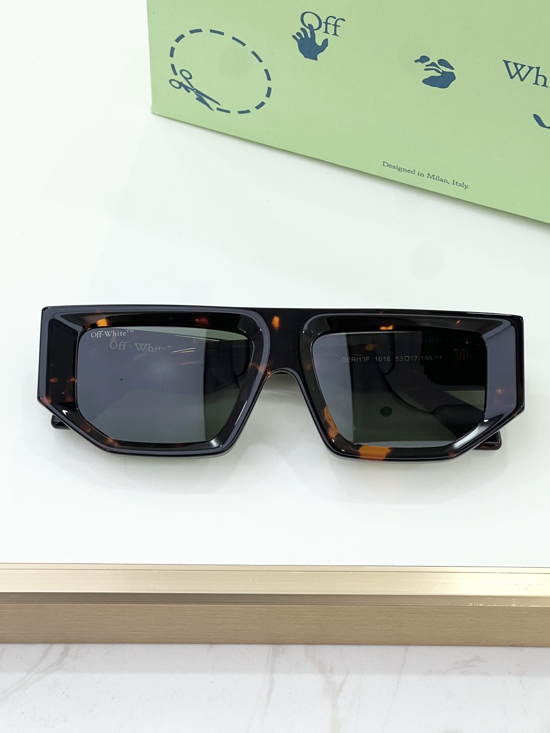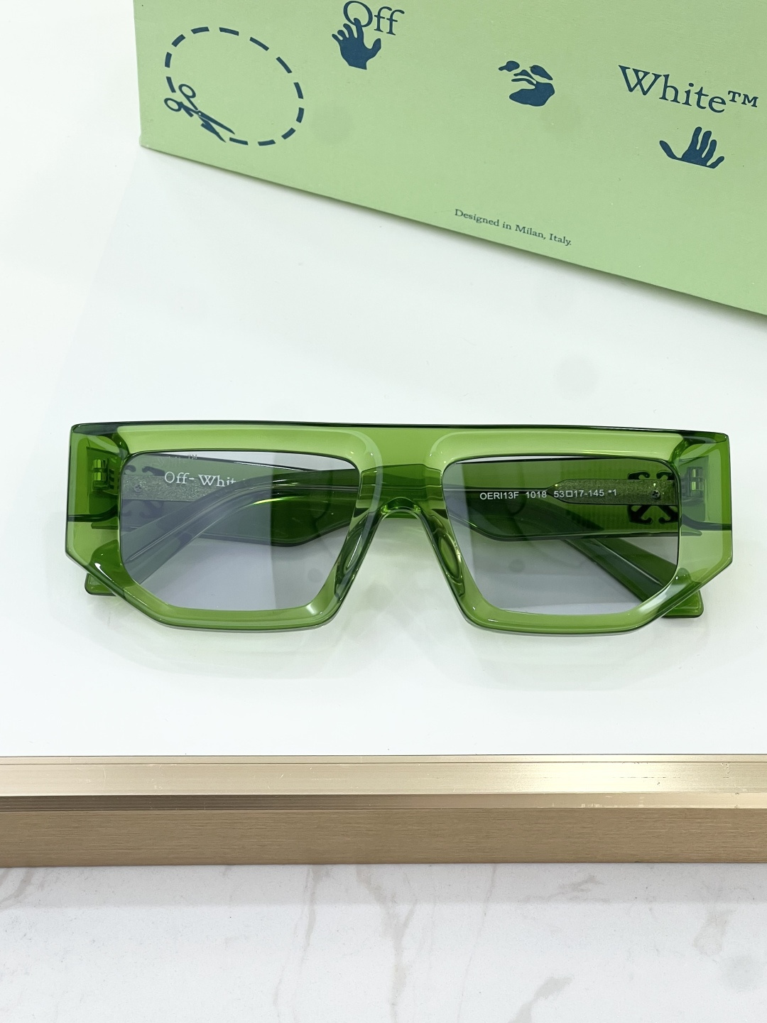这款太阳眼镜是AAAAA 1:1 质量 (非常棒). 使用了和原版一模一样的材料. 商标部分也保持了和OFF WHITE一样. 图片拍摄是实物太阳眼镜拍摄, 您所收到的实物保证和我们图片一模一样.