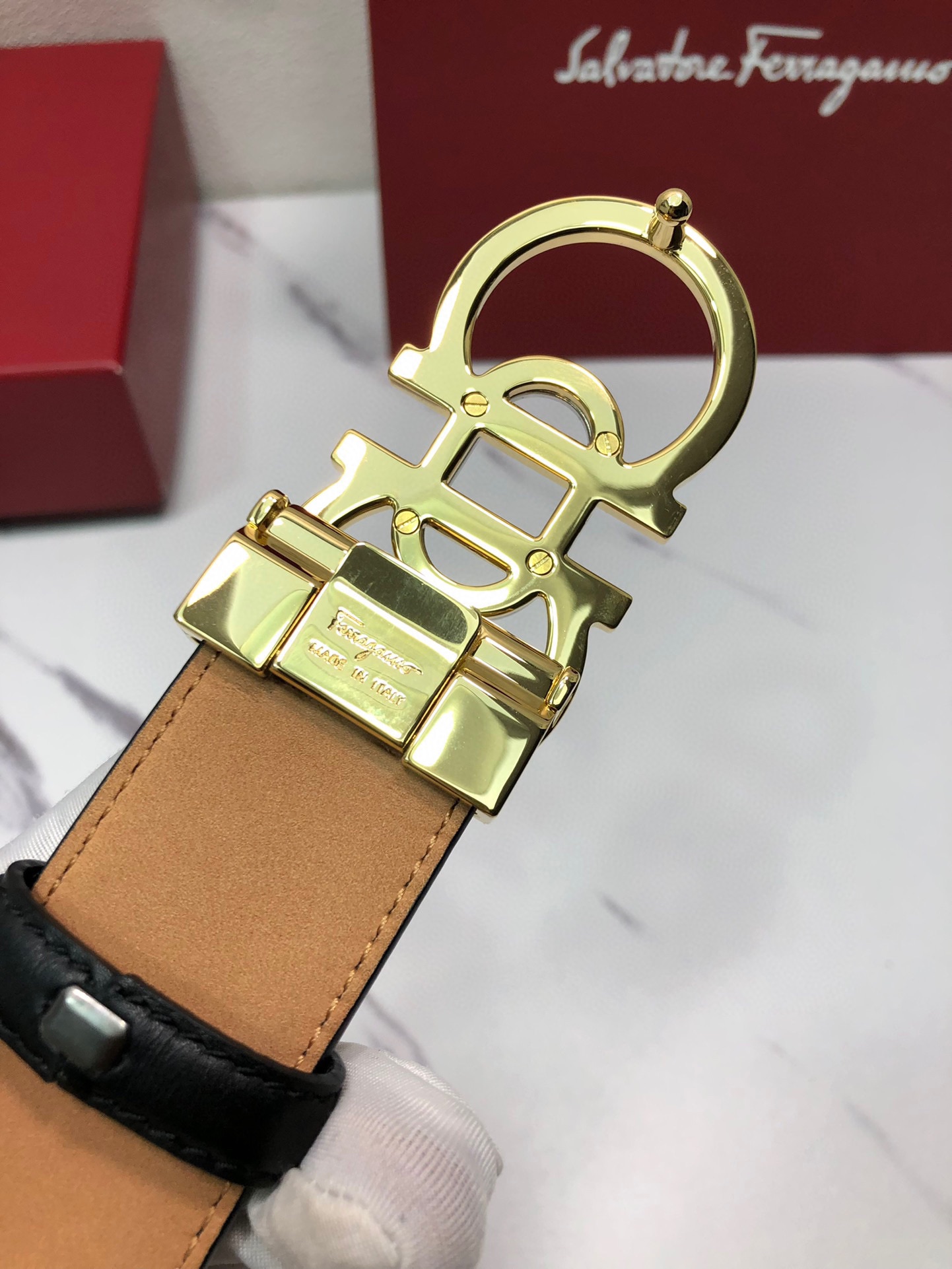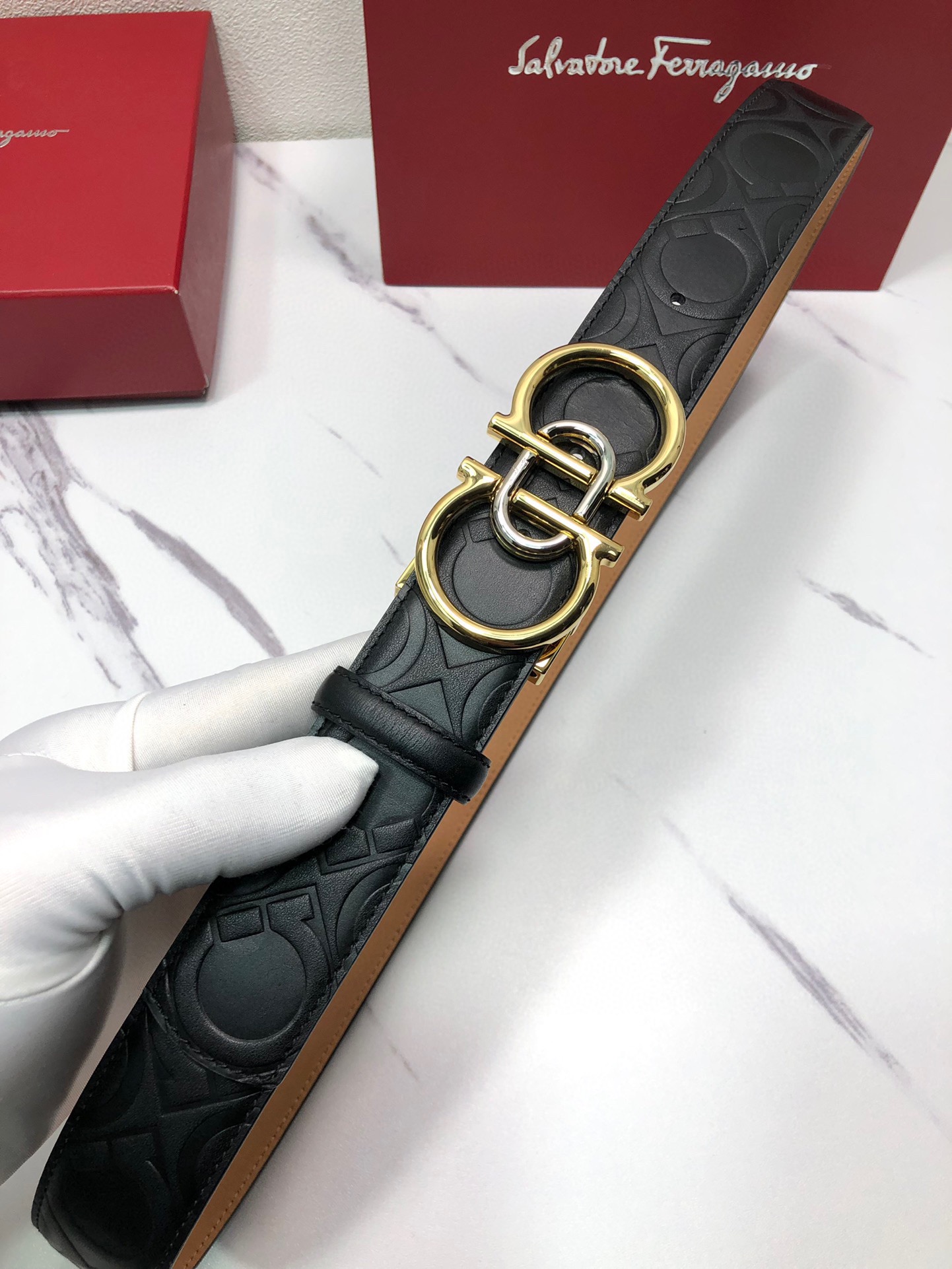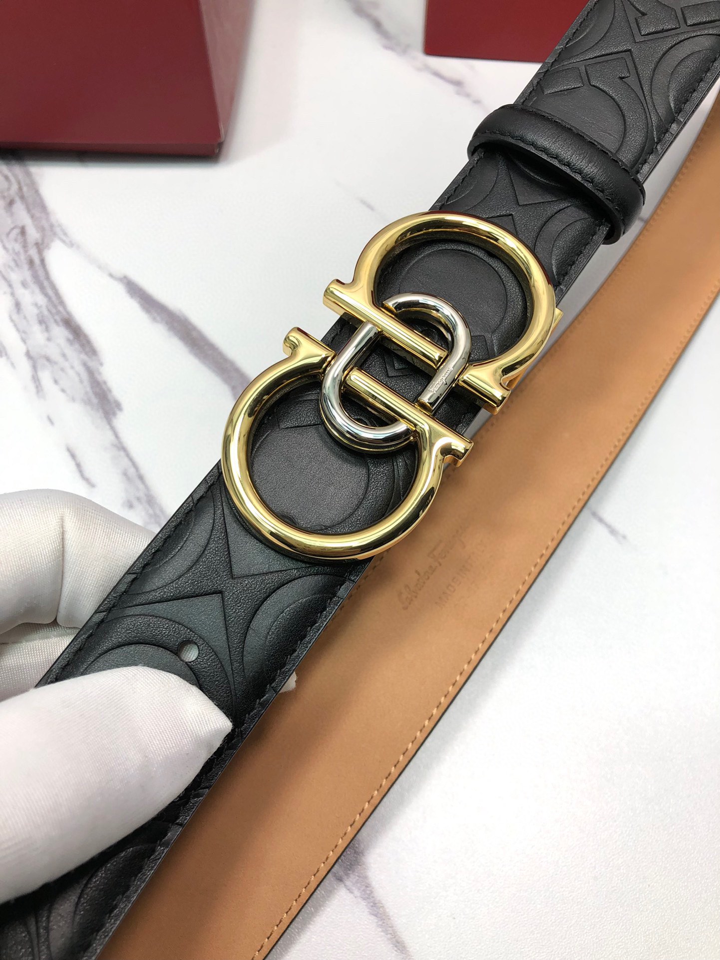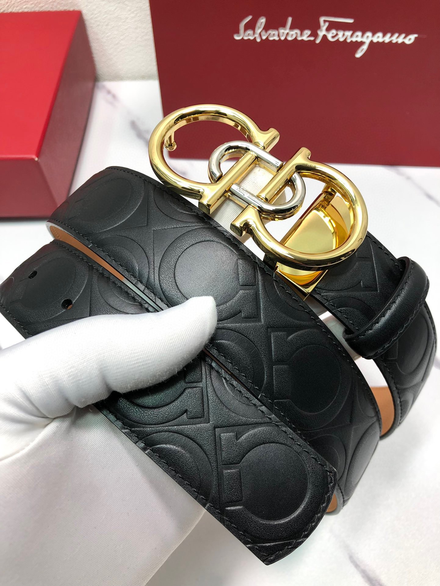 这款皮带是AAAAA 1:1 质量 (非常棒). 使用了和原版一模一样的材料. 商标部分也保持了和菲拉格慕/Salvatore Ferragamo一样. 图片拍摄是实物皮带拍摄, 您所收到的实物保证和我们图片一模一样.