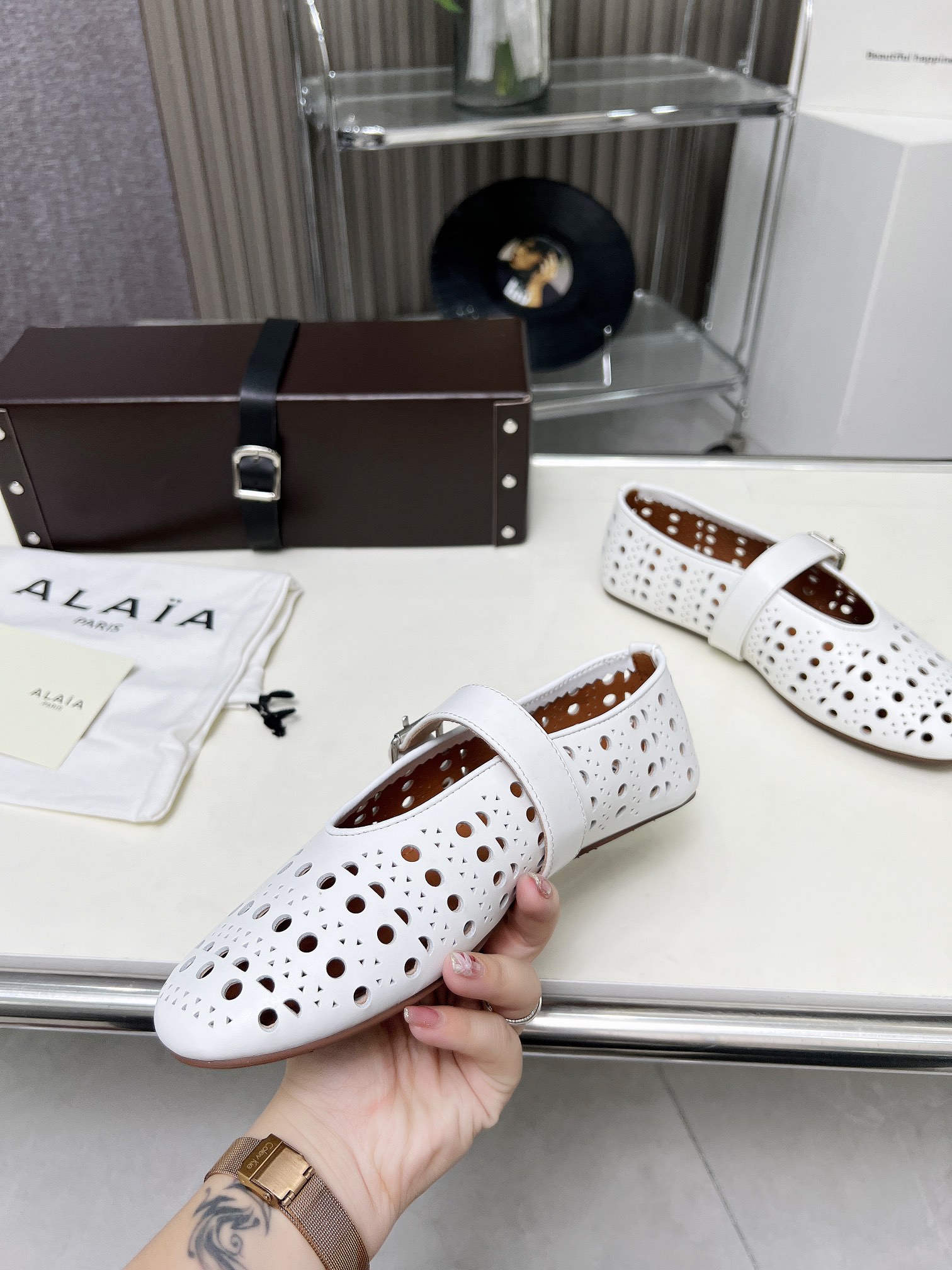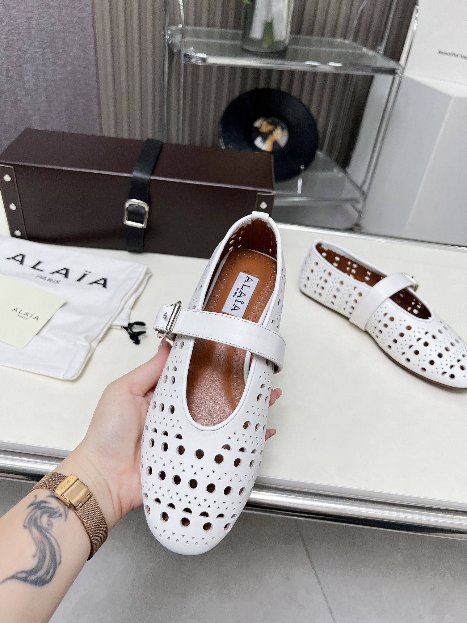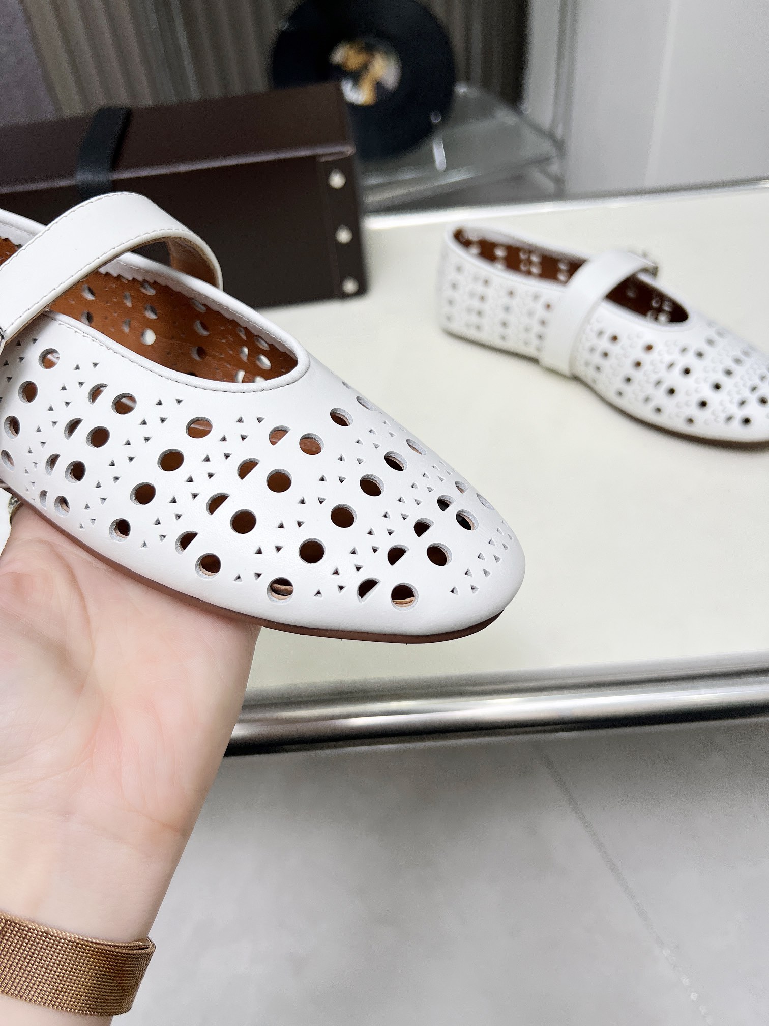这款鞋子是AAAAA 1:1 质量 (非常棒). 使用了和原版一模一样的材料. 商标部分也保持了和Alaia一样. 图片拍摄是实物鞋子拍摄, 您所收到的实物保证和我们图片一模一样.