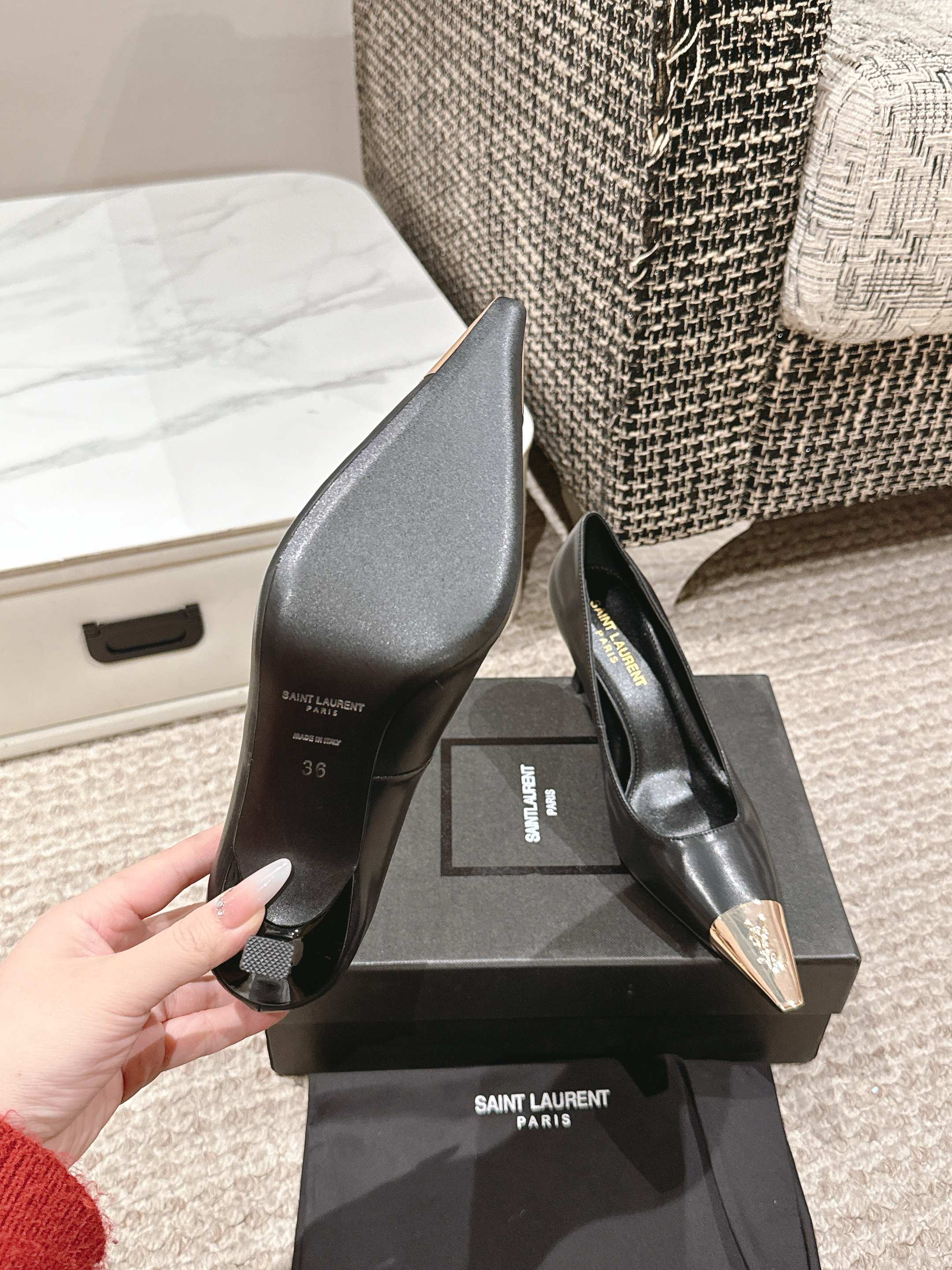 这款鞋子是AAAAA 1:1 质量 (非常棒). 使用了和原版一模一样的材料. 商标部分也保持了和圣罗兰/Saint Laurent一样. 图片拍摄是实物鞋子拍摄, 您所收到的实物保证和我们图片一模一样.