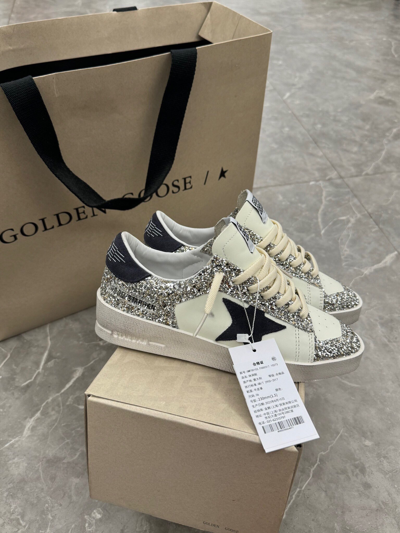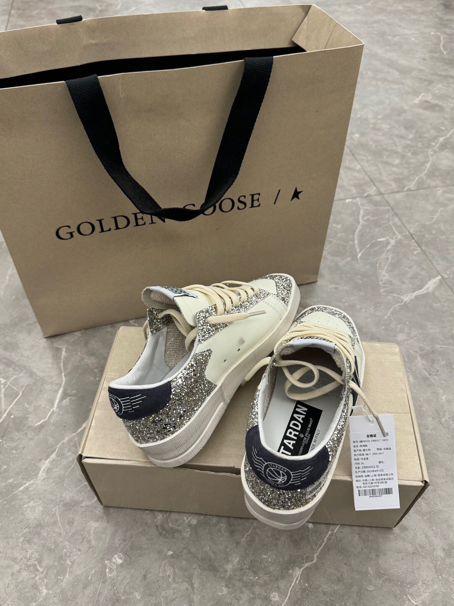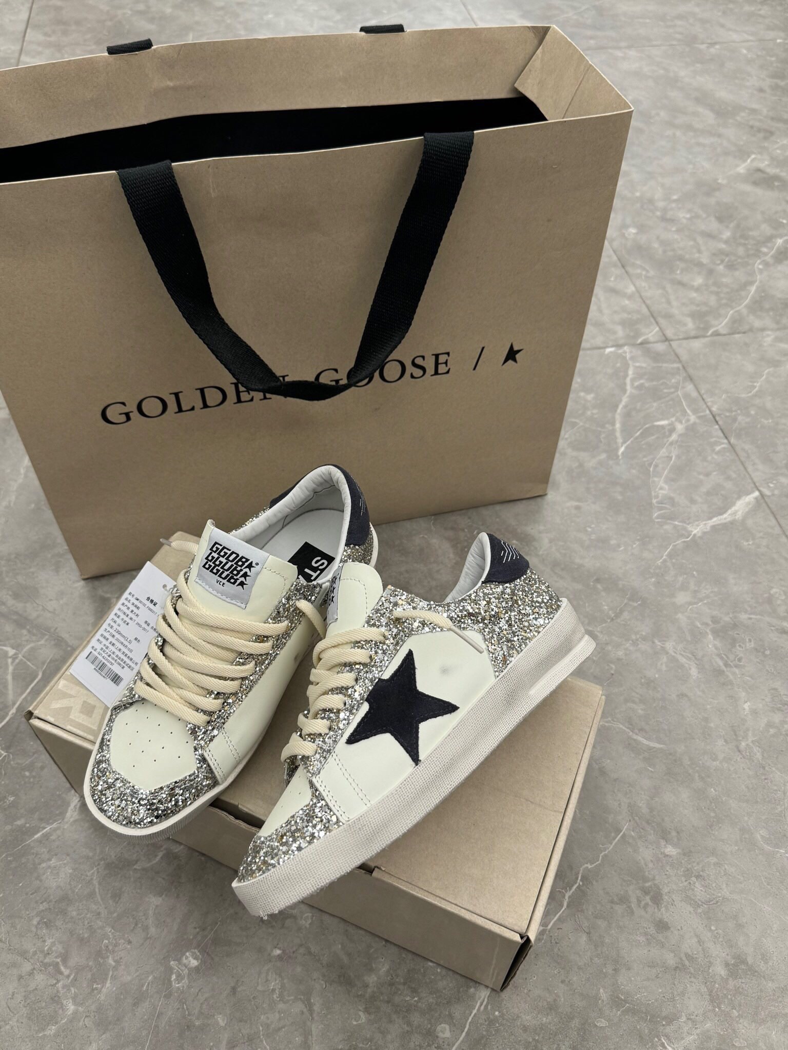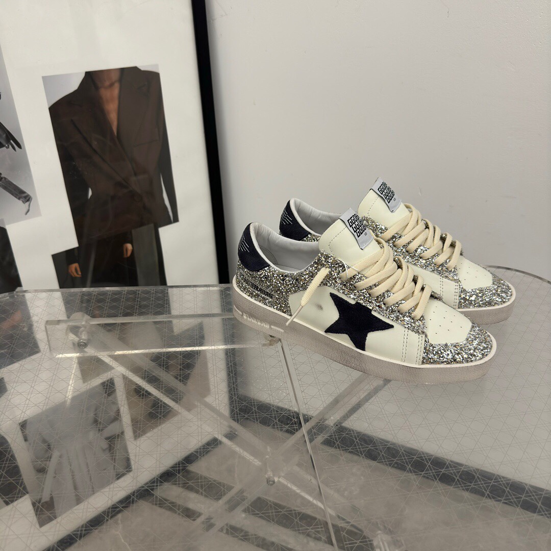 这款鞋子是AAAAA 1:1 质量 (非常棒). 使用了和原版一模一样的材料. 商标部分也保持了和Golden Goose一样. 图片拍摄是实物鞋子拍摄, 您所收到的实物保证和我们图片一模一样.
