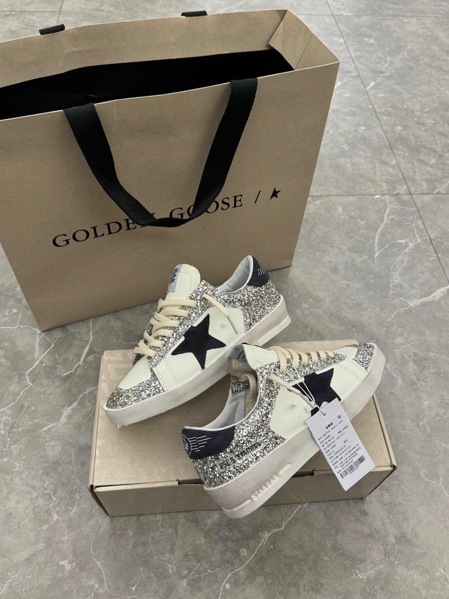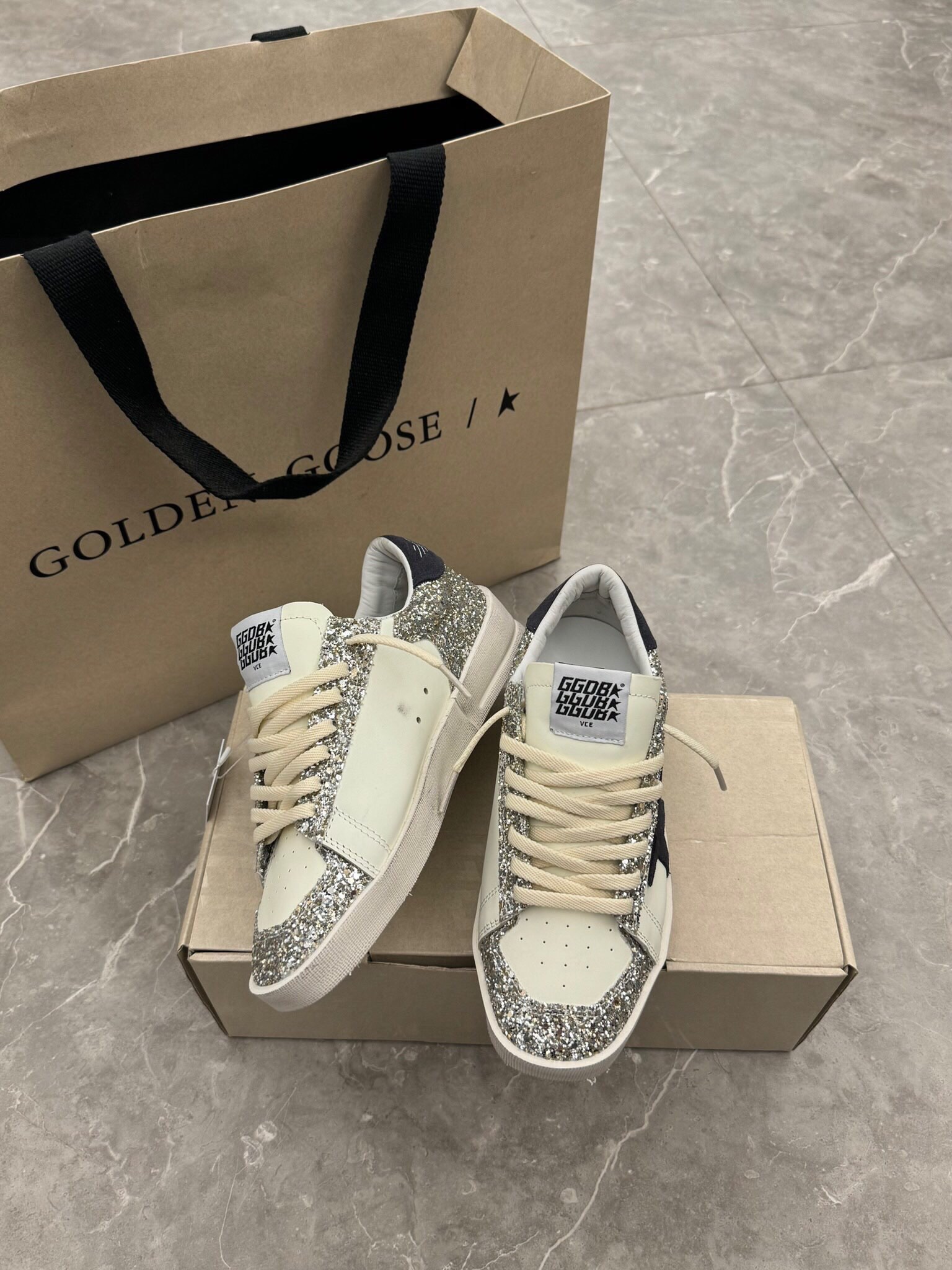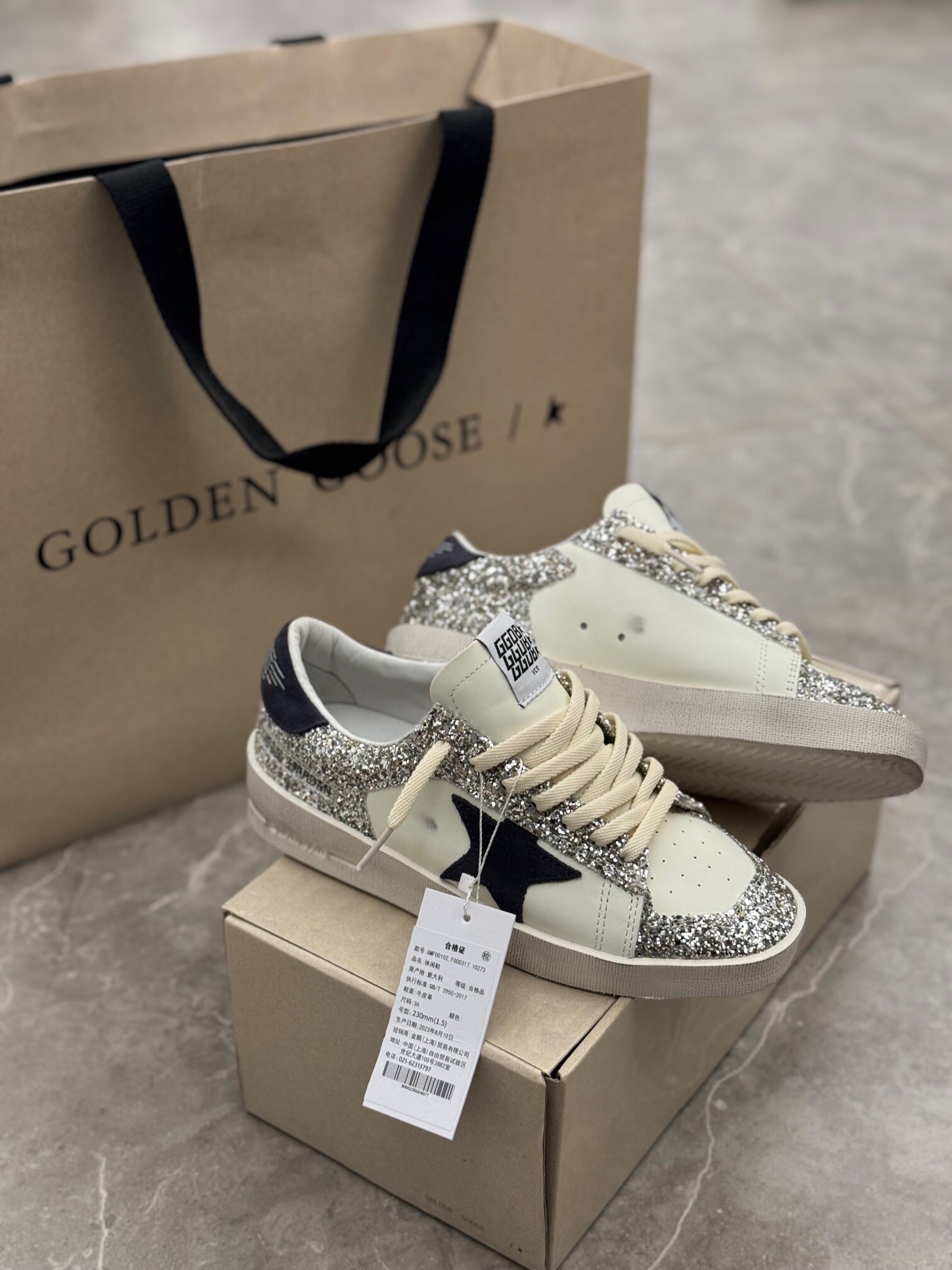 这款鞋子是AAAAA 1:1 质量 (非常棒). 使用了和原版一模一样的材料. 商标部分也保持了和Golden Goose一样. 图片拍摄是实物鞋子拍摄, 您所收到的实物保证和我们图片一模一样.