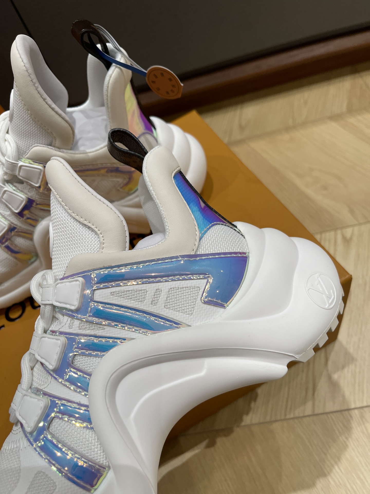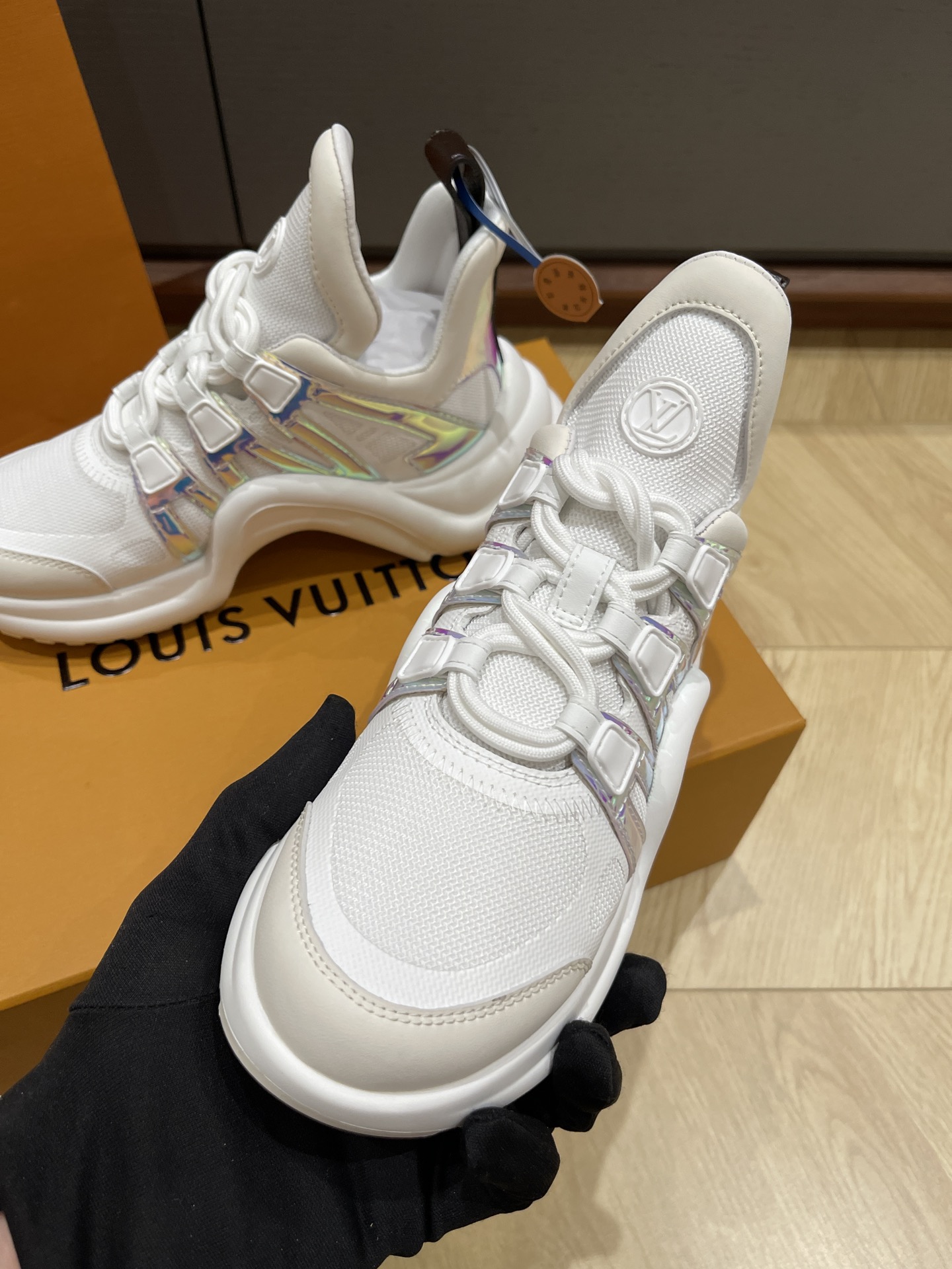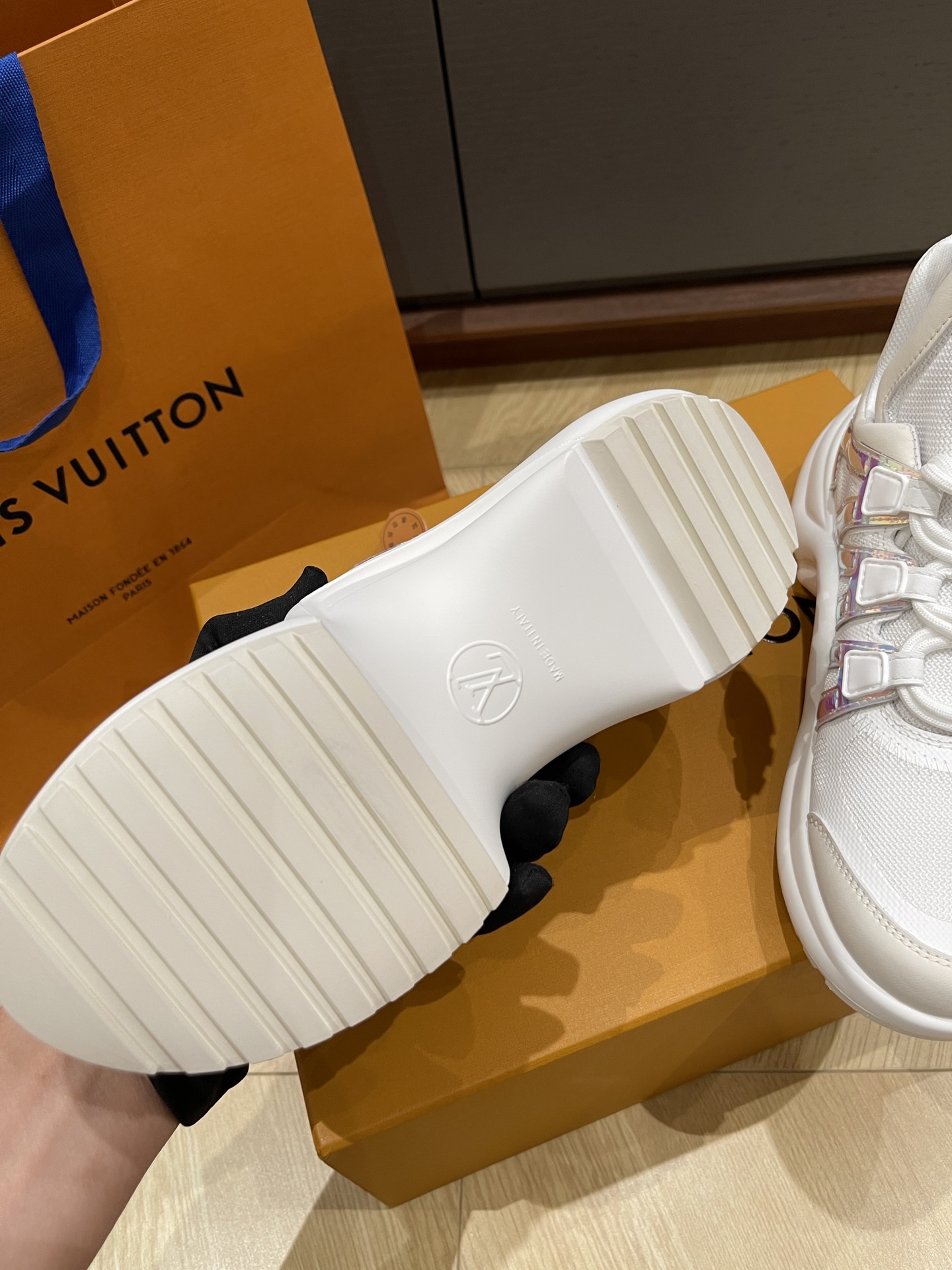 这款鞋子是AAAAA 1:1 质量 (非常棒). 使用了和原版一模一样的材料. 商标部分也保持了和路易威登/Louis Vuitton一样. 图片拍摄是实物鞋子拍摄, 您所收到的实物保证和我们图片一模一样.