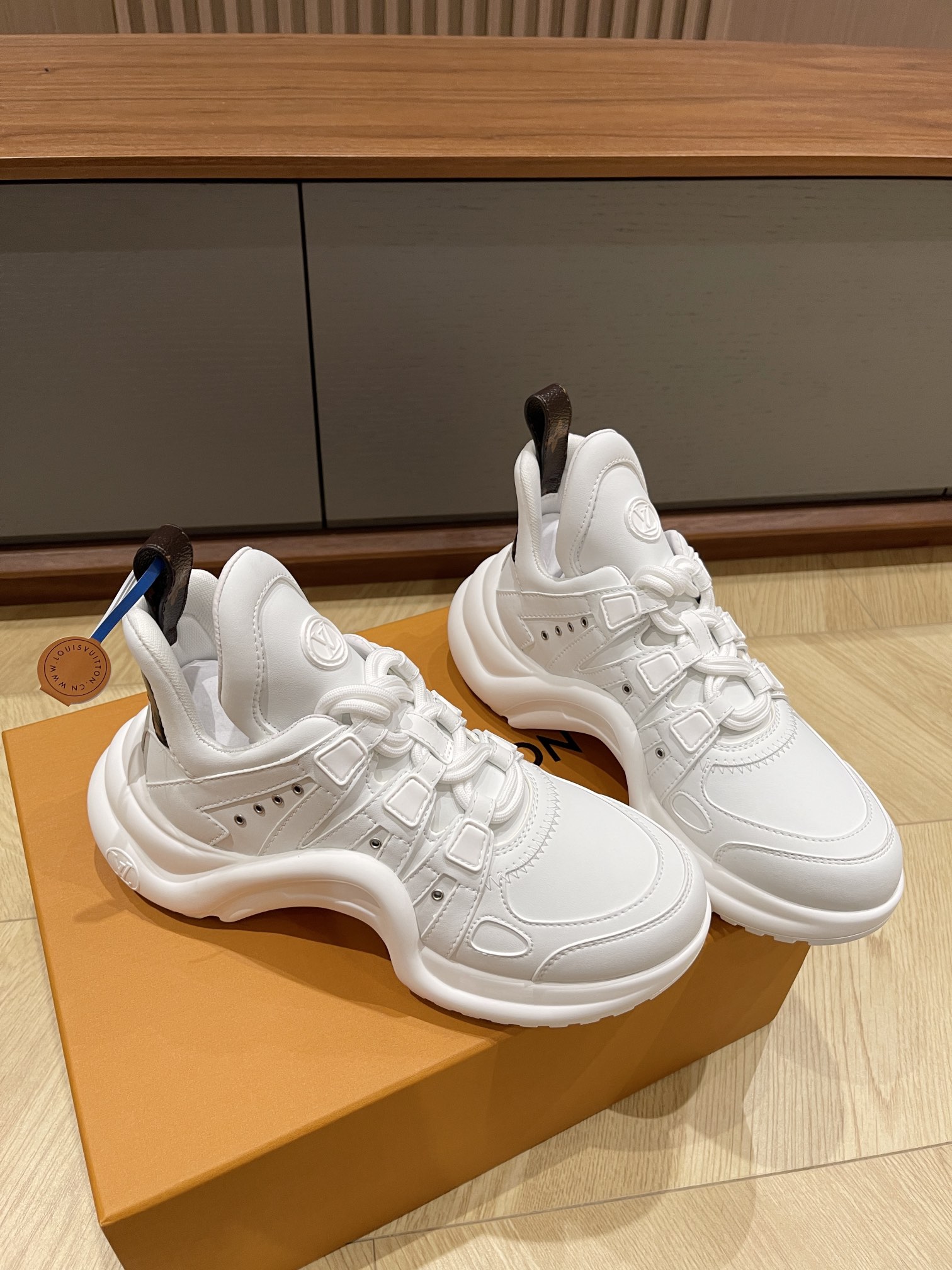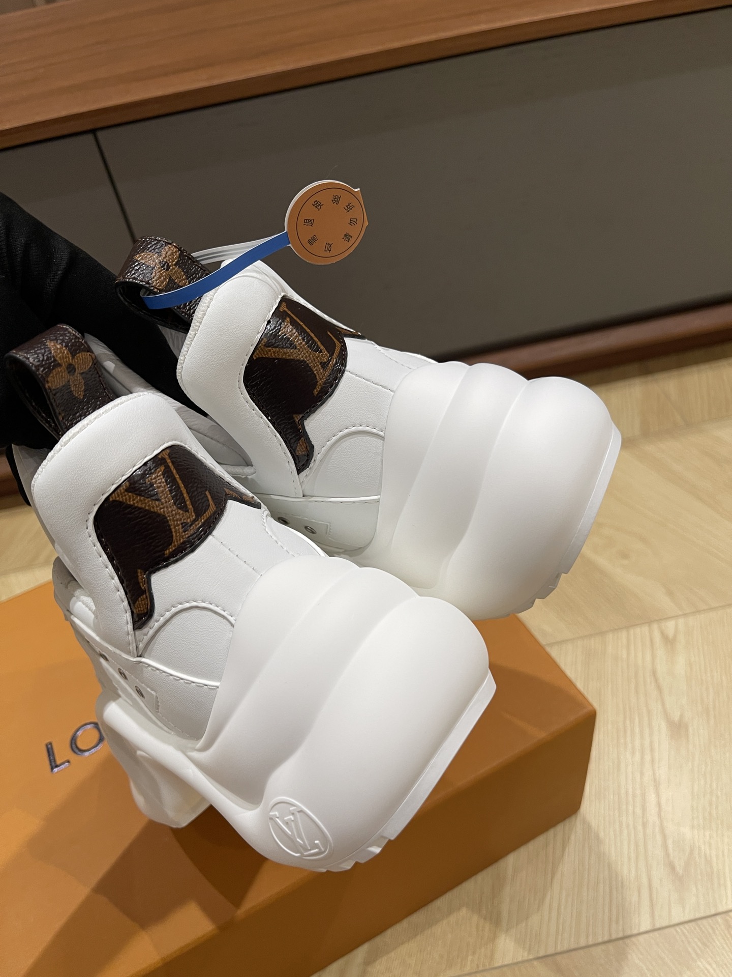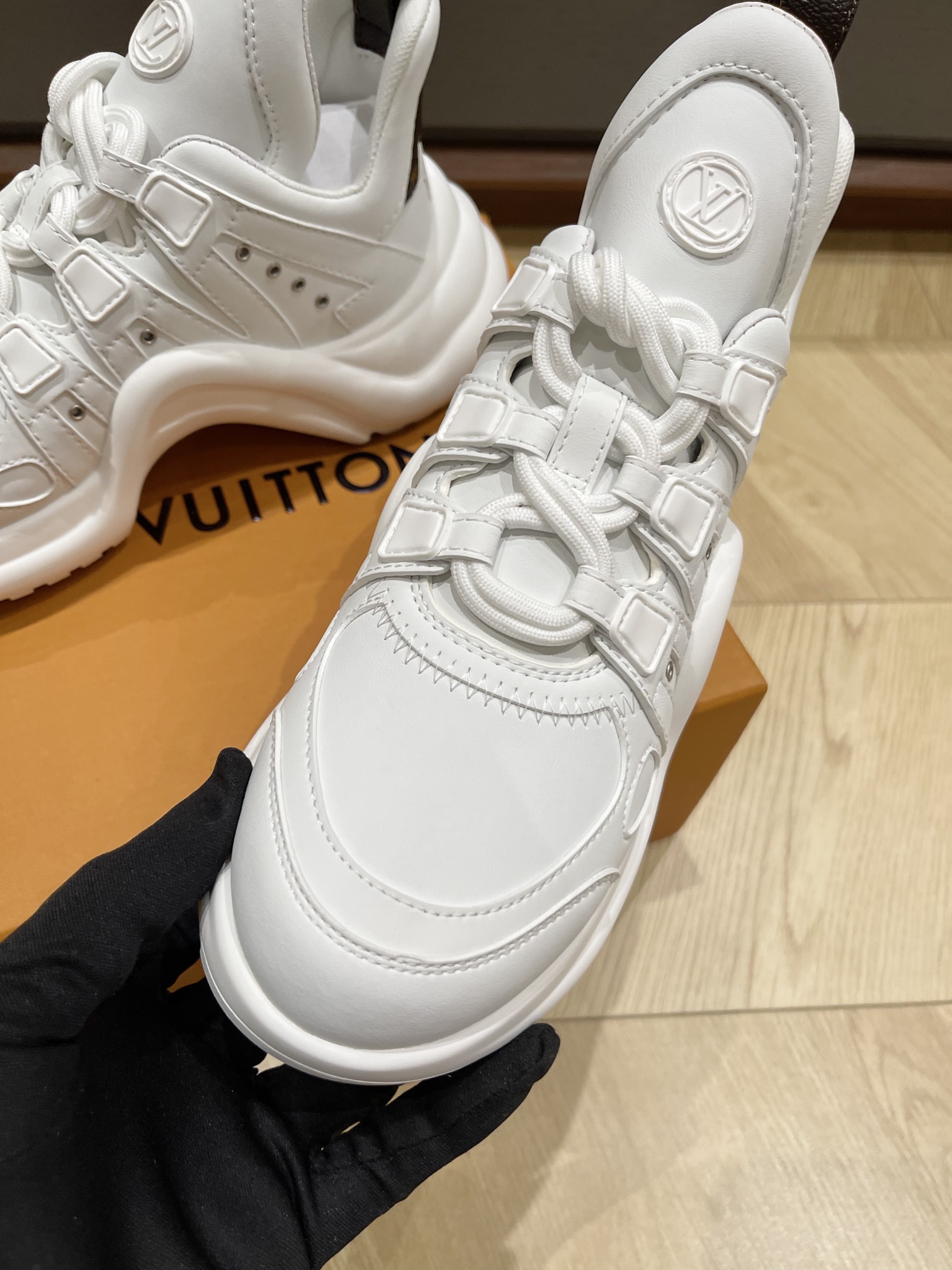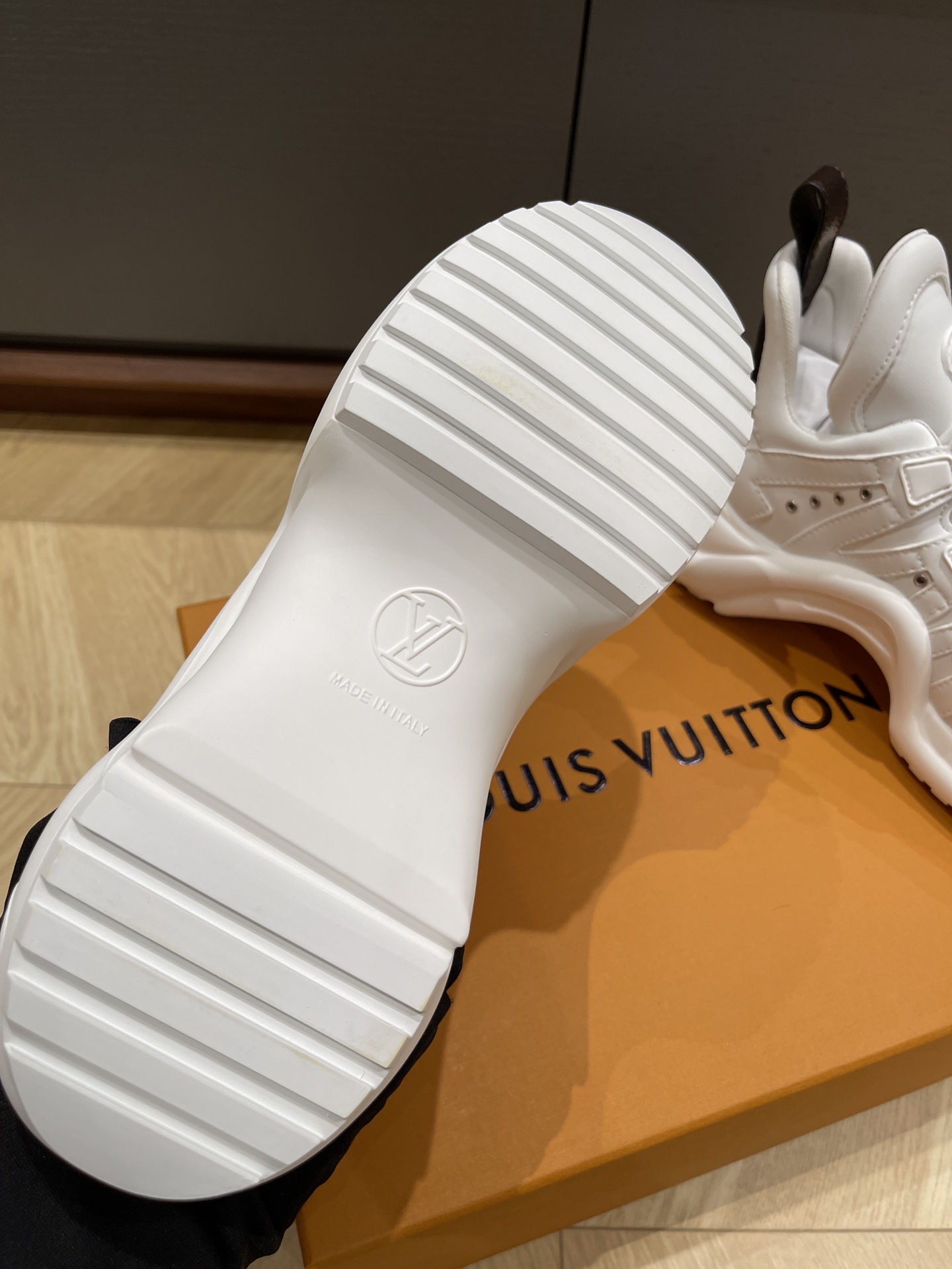 这款鞋子是AAAAA 1:1 质量 (非常棒). 使用了和原版一模一样的材料. 商标部分也保持了和路易威登/Louis Vuitton一样. 图片拍摄是实物鞋子拍摄, 您所收到的实物保证和我们图片一模一样.