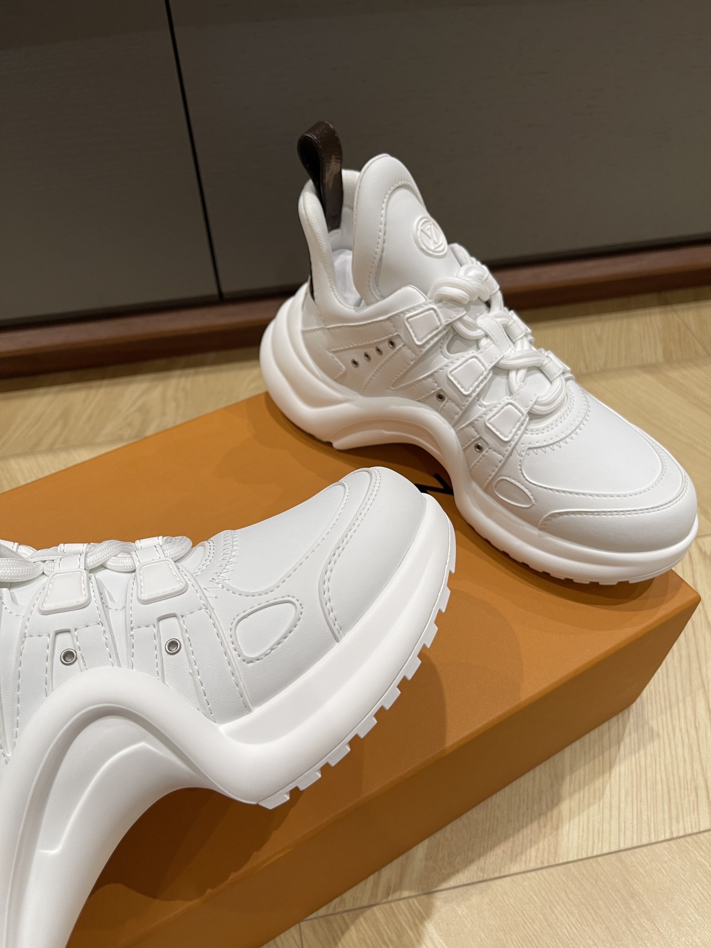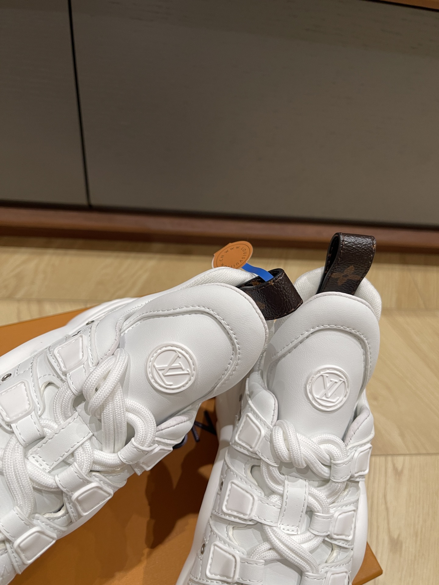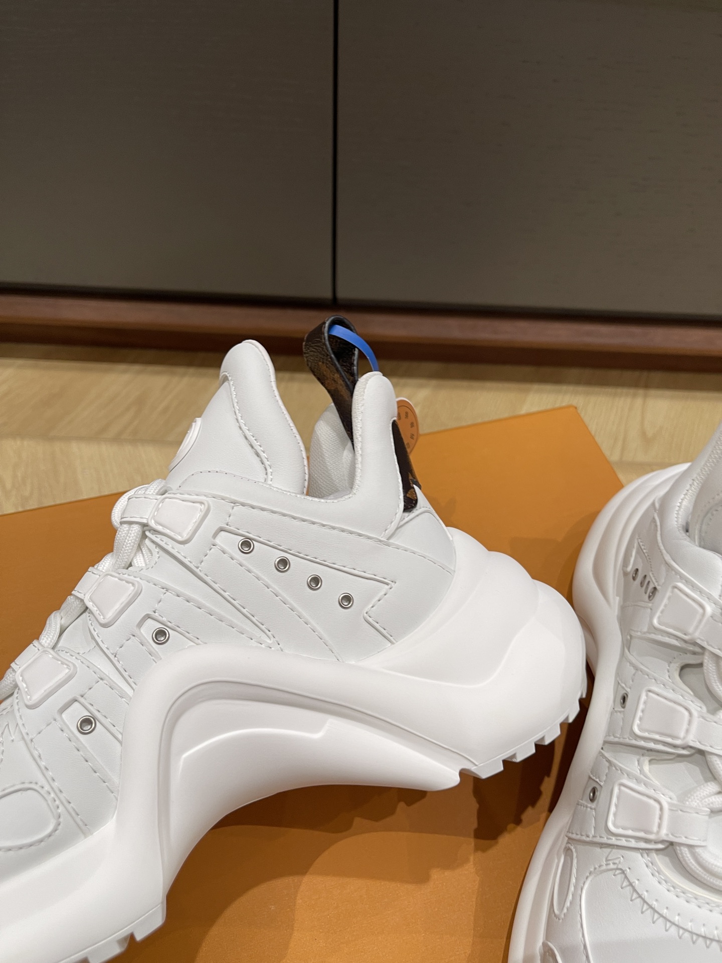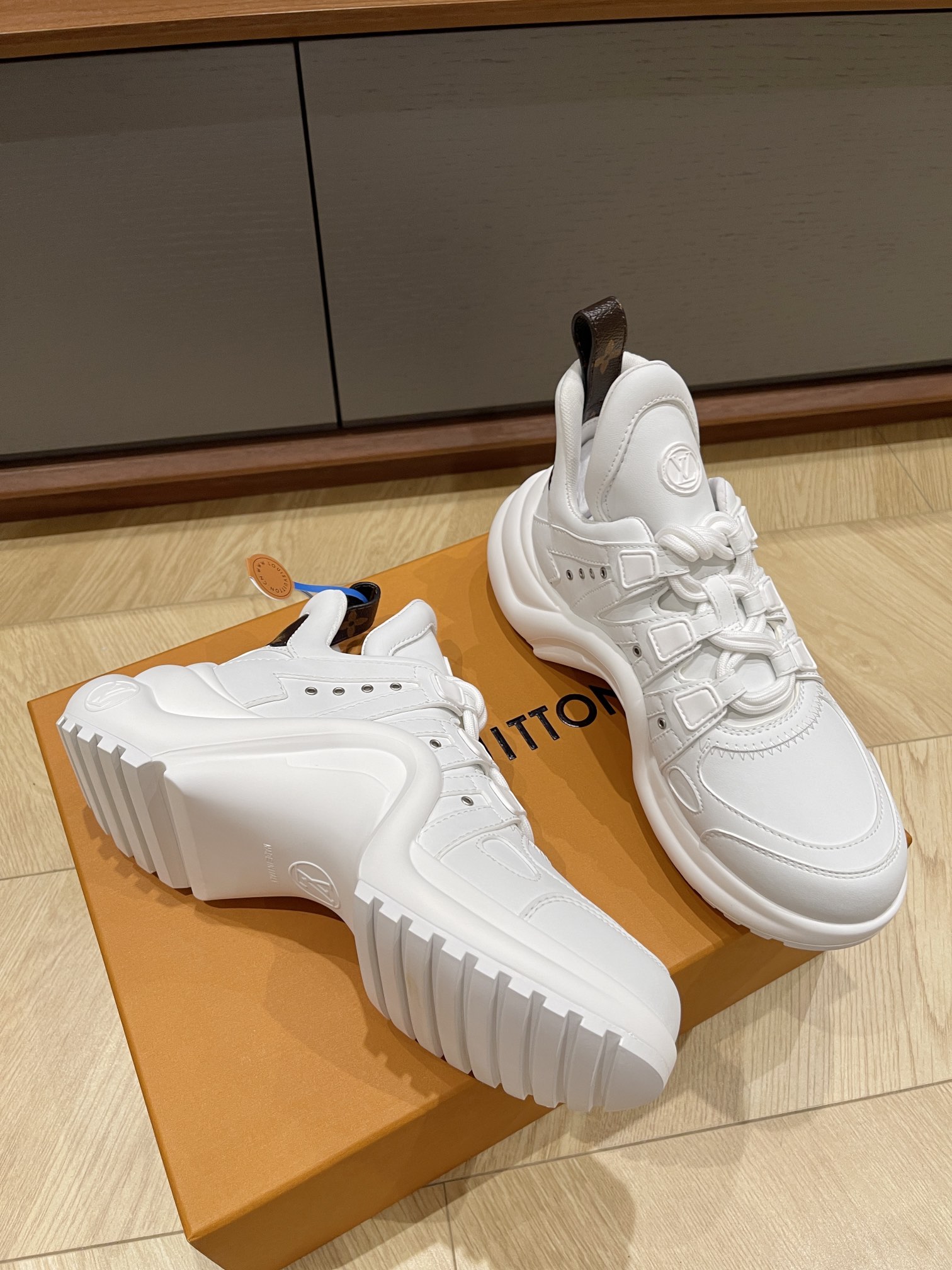 这款鞋子是AAAAA 1:1 质量 (非常棒). 使用了和原版一模一样的材料. 商标部分也保持了和路易威登/Louis Vuitton一样. 图片拍摄是实物鞋子拍摄, 您所收到的实物保证和我们图片一模一样.