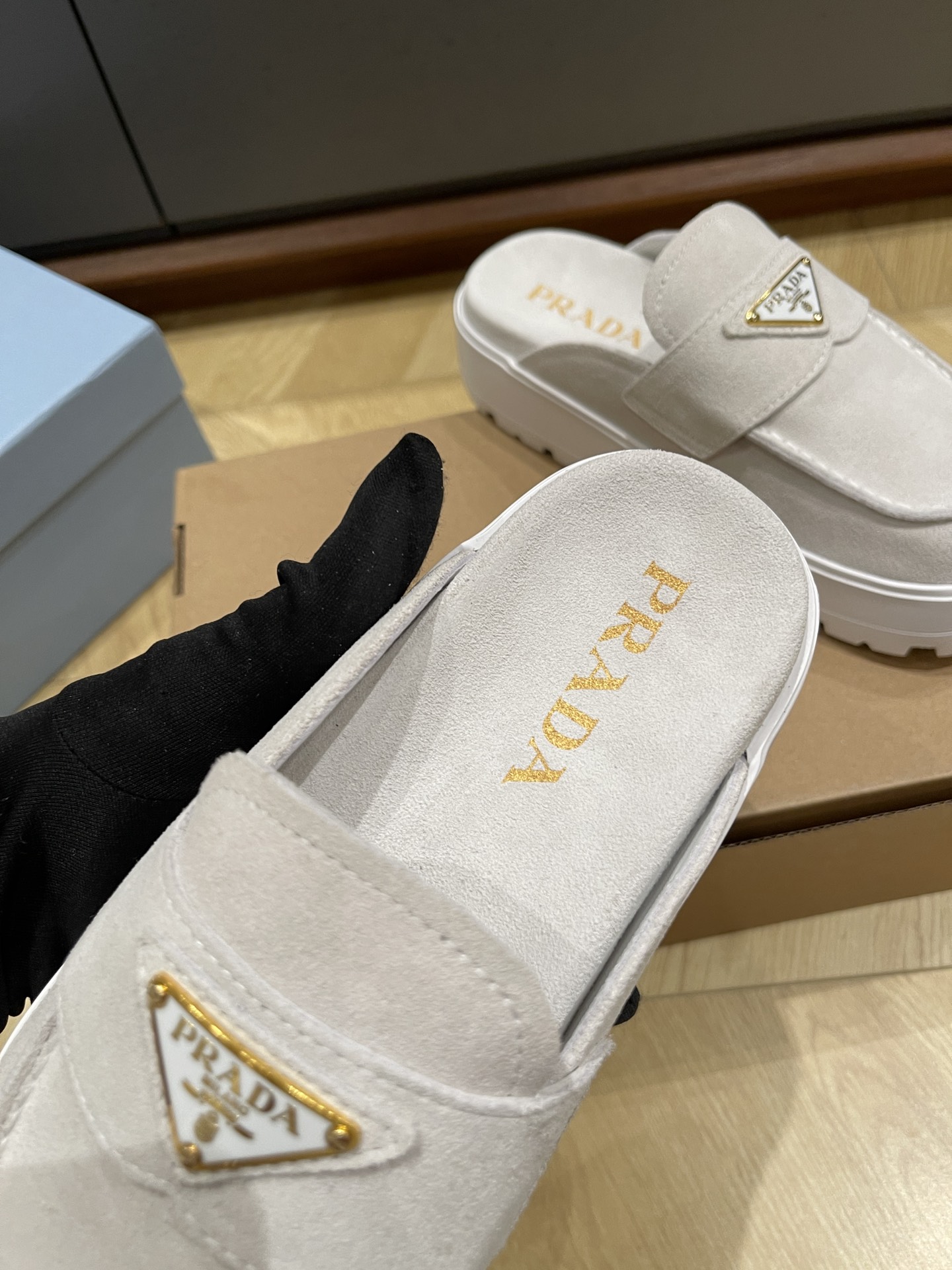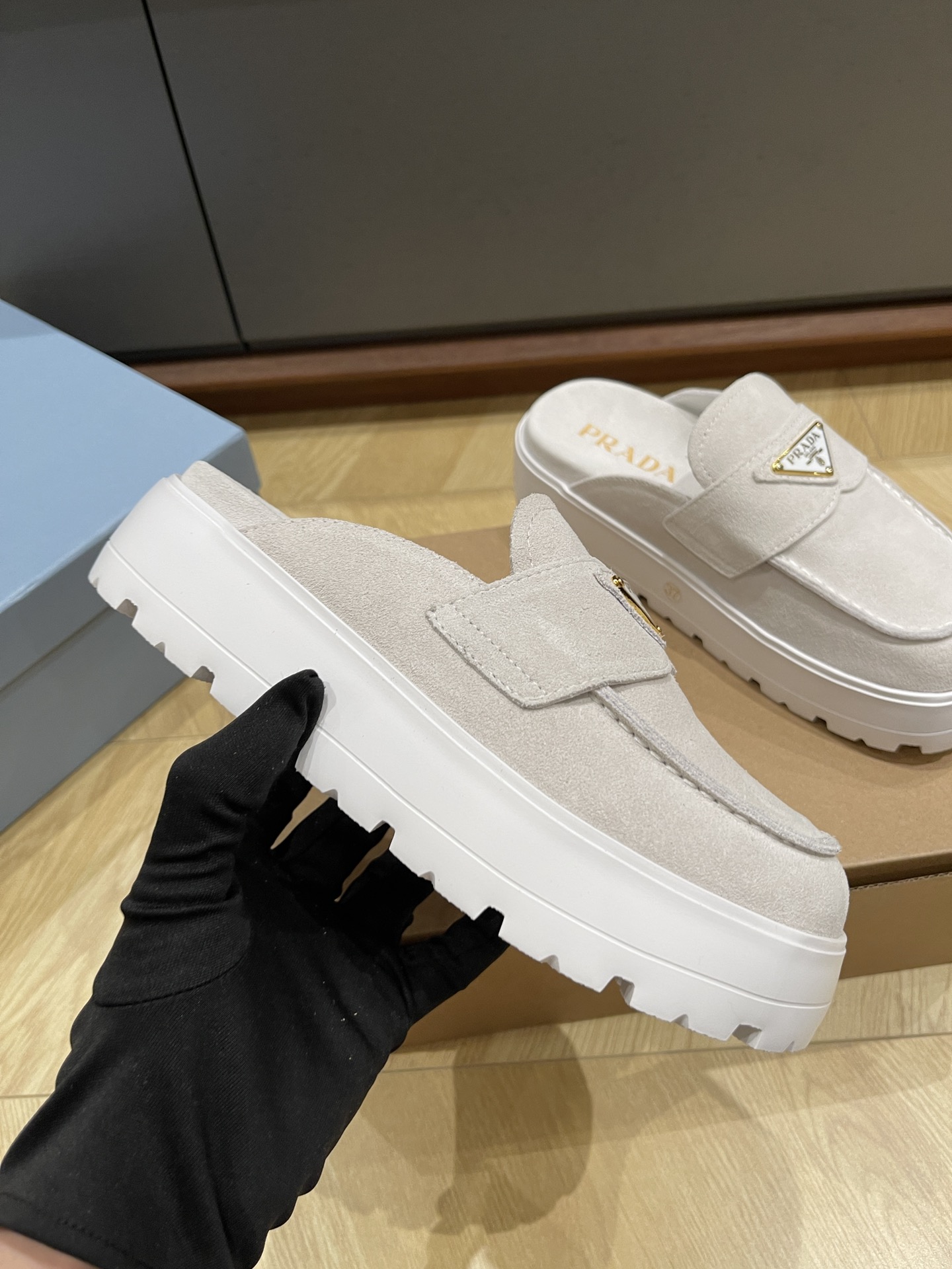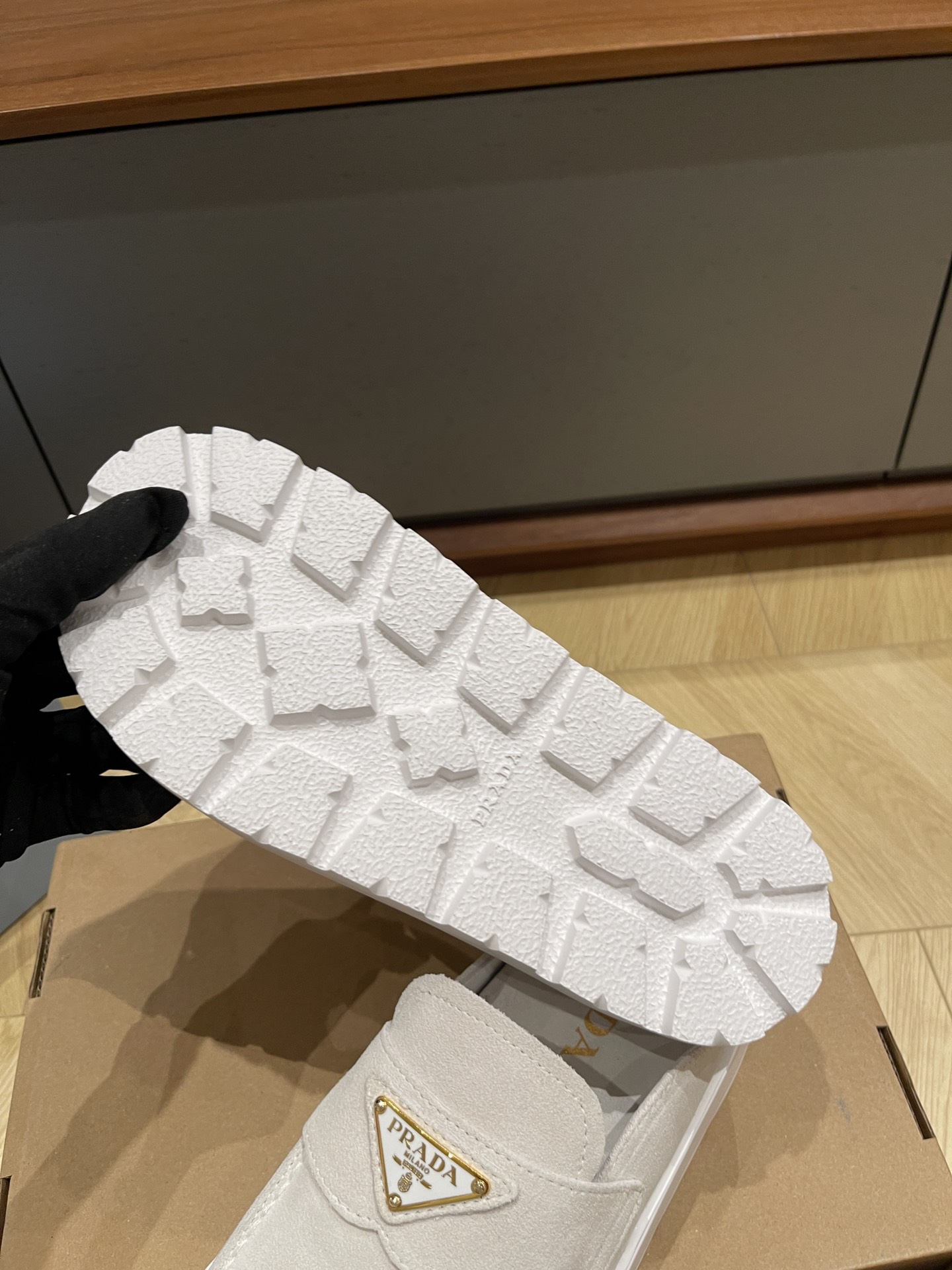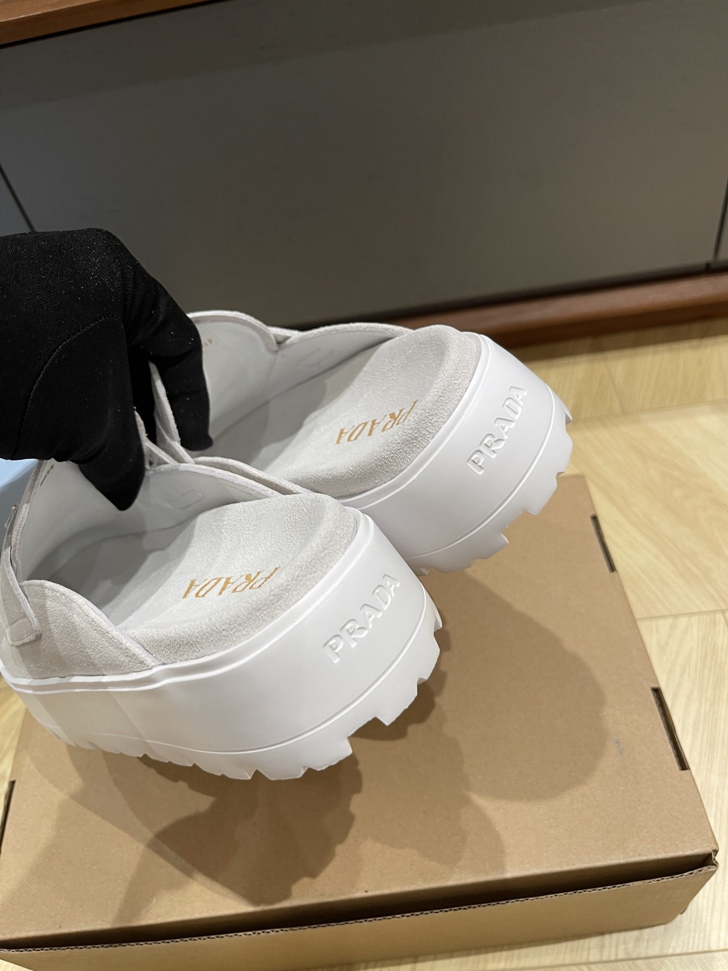 这款鞋子是AAAAA 1:1 质量 (非常棒). 使用了和原版一模一样的材料. 商标部分也保持了和普拉达/Prada一样. 图片拍摄是实物鞋子拍摄, 您所收到的实物保证和我们图片一模一样.