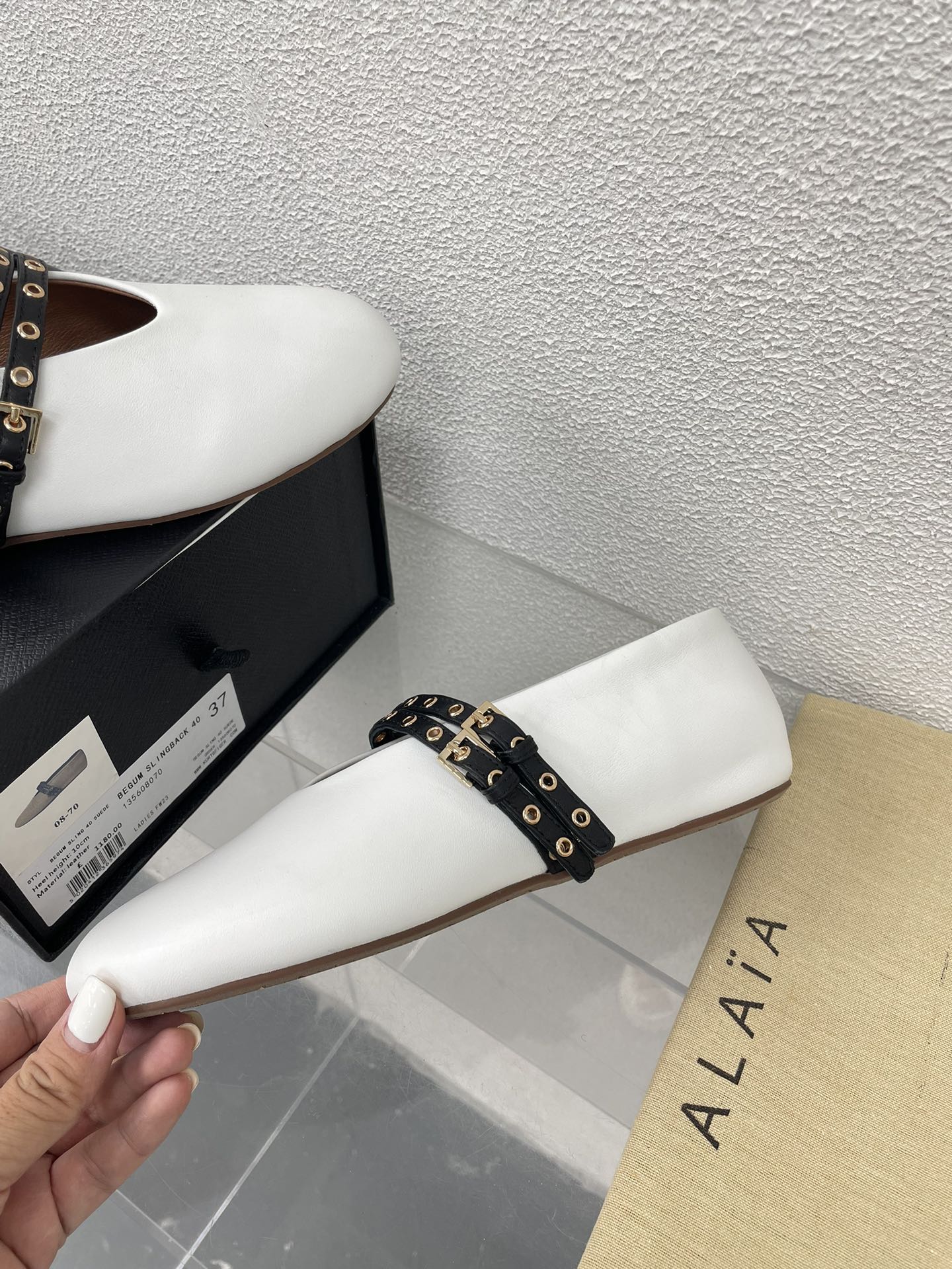 这款鞋子是AAAAA 1:1 质量 (非常棒). 使用了和原版一模一样的材料. 商标部分也保持了和Alaia一样. 图片拍摄是实物鞋子拍摄, 您所收到的实物保证和我们图片一模一样.