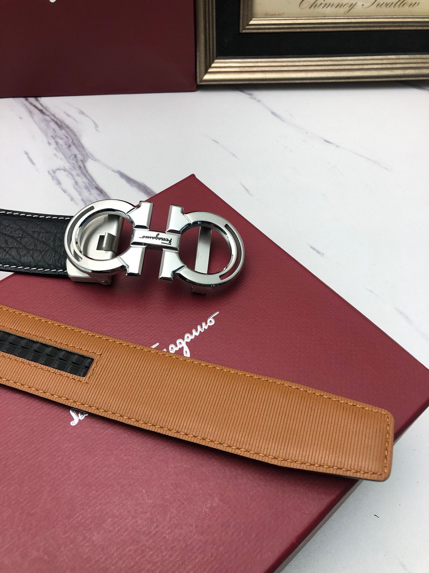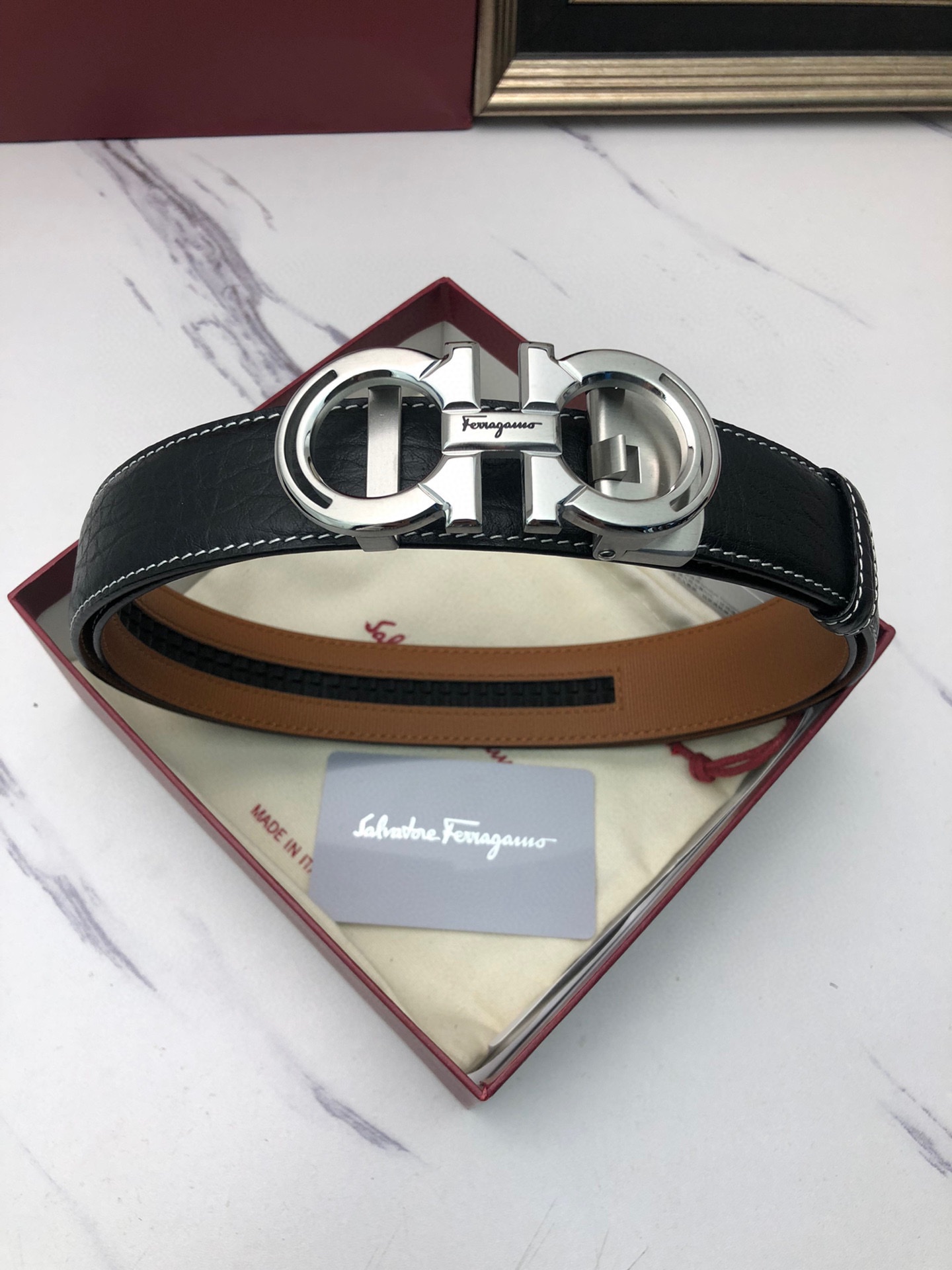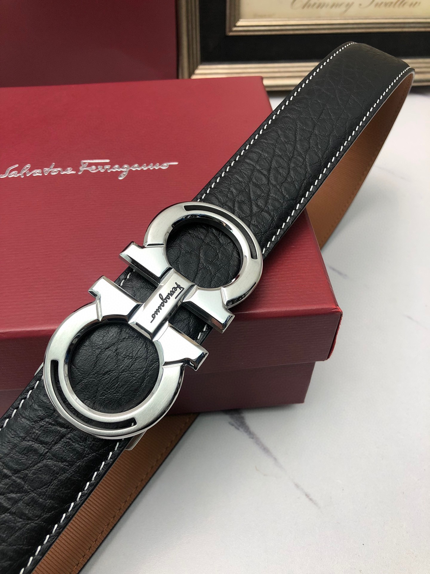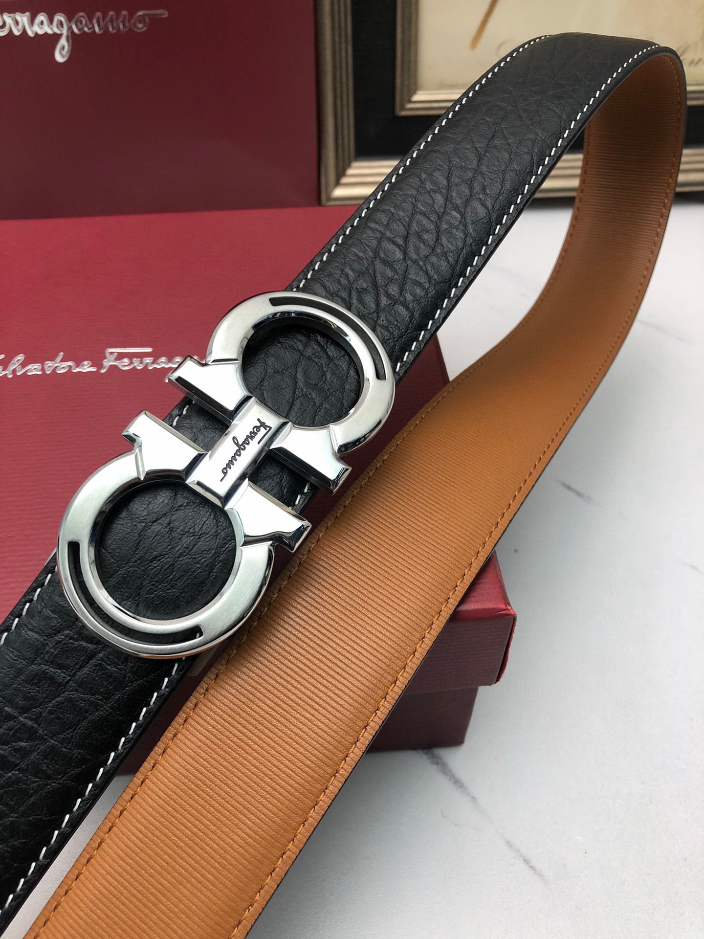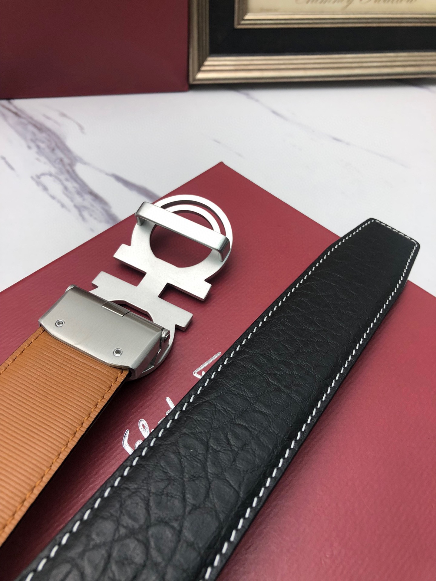 这款皮带是AAAAA 1:1 质量 (非常棒). 使用了和原版一模一样的材料. 商标部分也保持了和菲拉格慕/Salvatore Ferragamo一样. 图片拍摄是实物皮带拍摄, 您所收到的实物保证和我们图片一模一样.