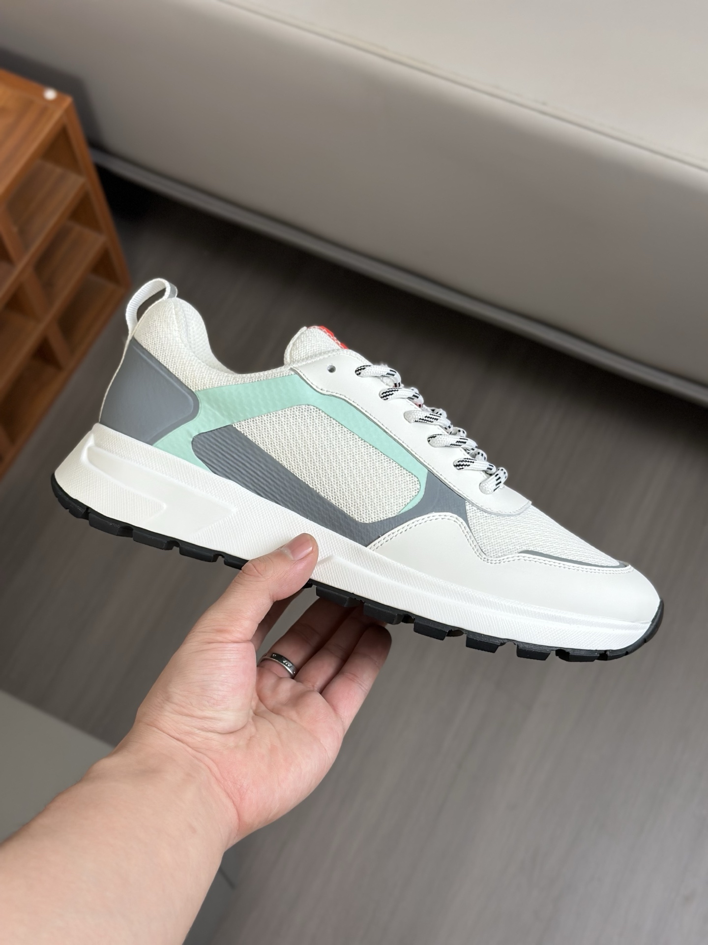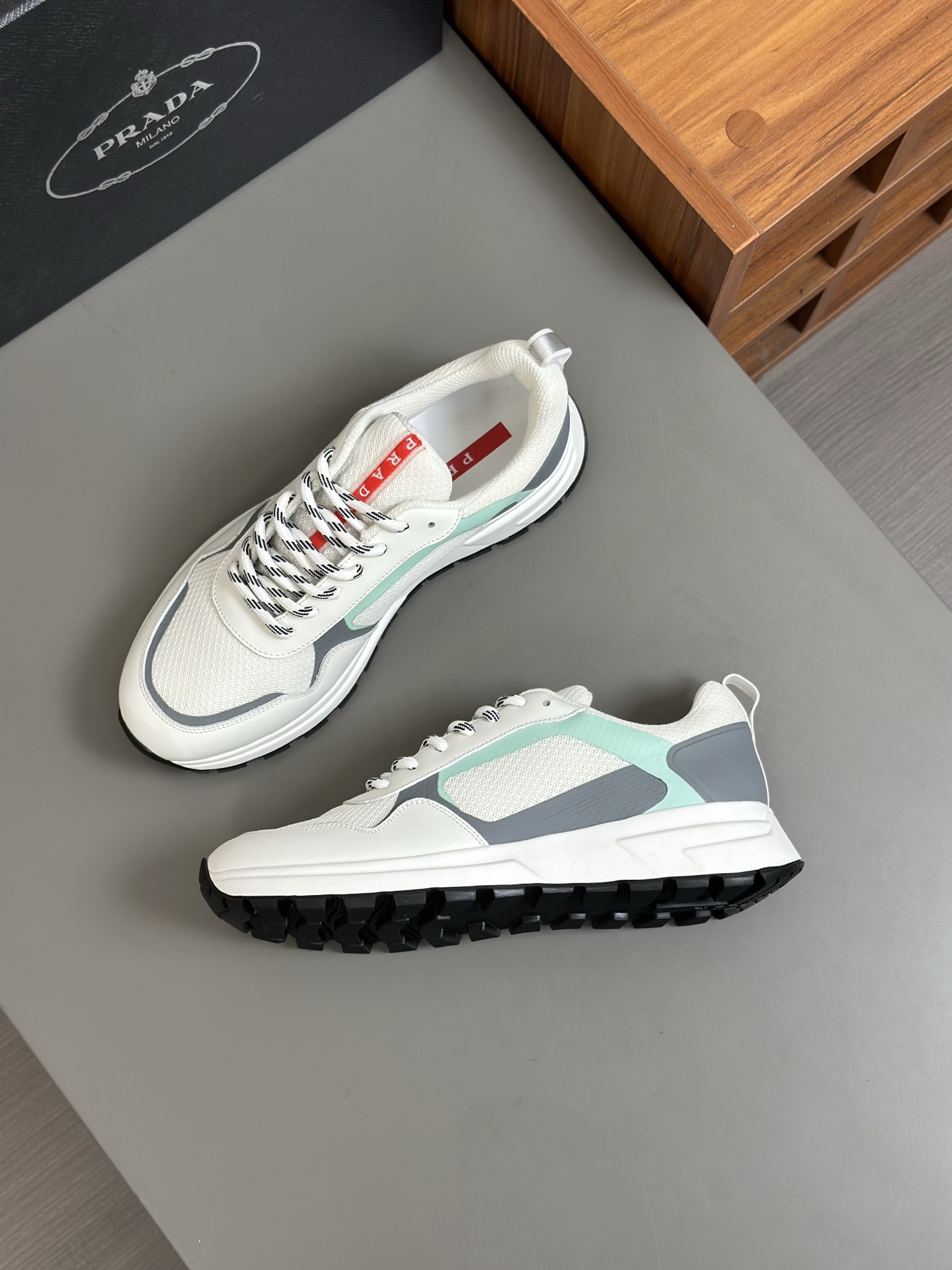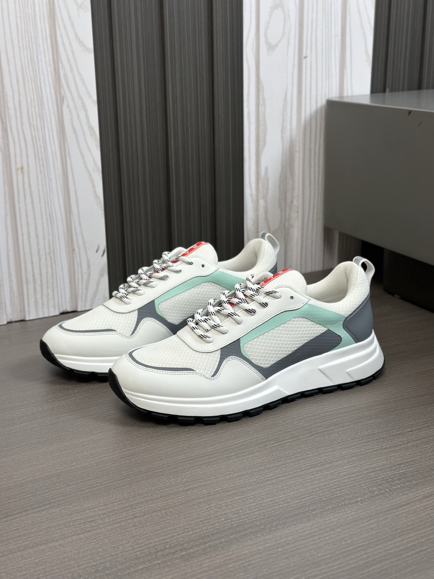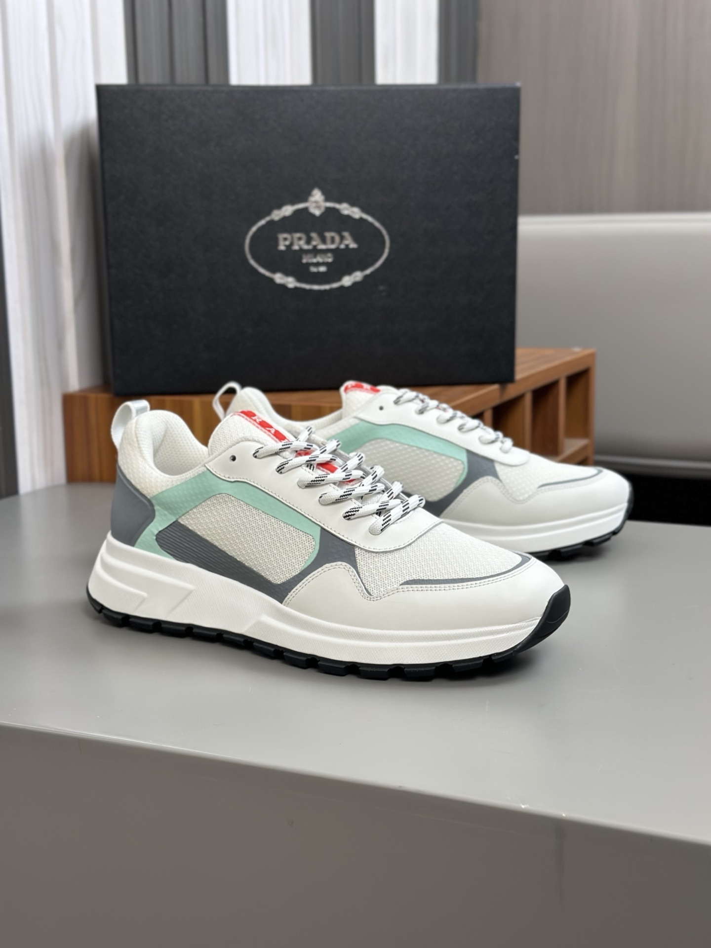 这款鞋子是AAAAA 1:1 质量 (非常棒). 使用了和原版一模一样的材料. 商标部分也保持了和普拉达/Prada一样. 图片拍摄是实物鞋子拍摄, 您所收到的实物保证和我们图片一模一样.