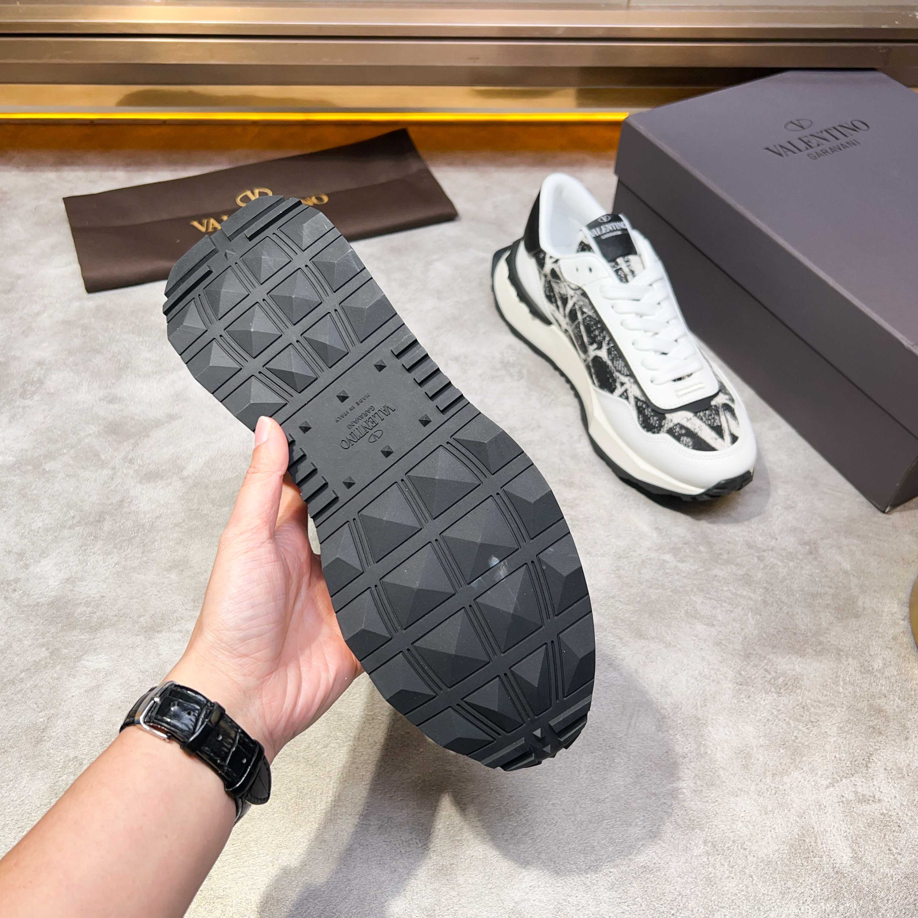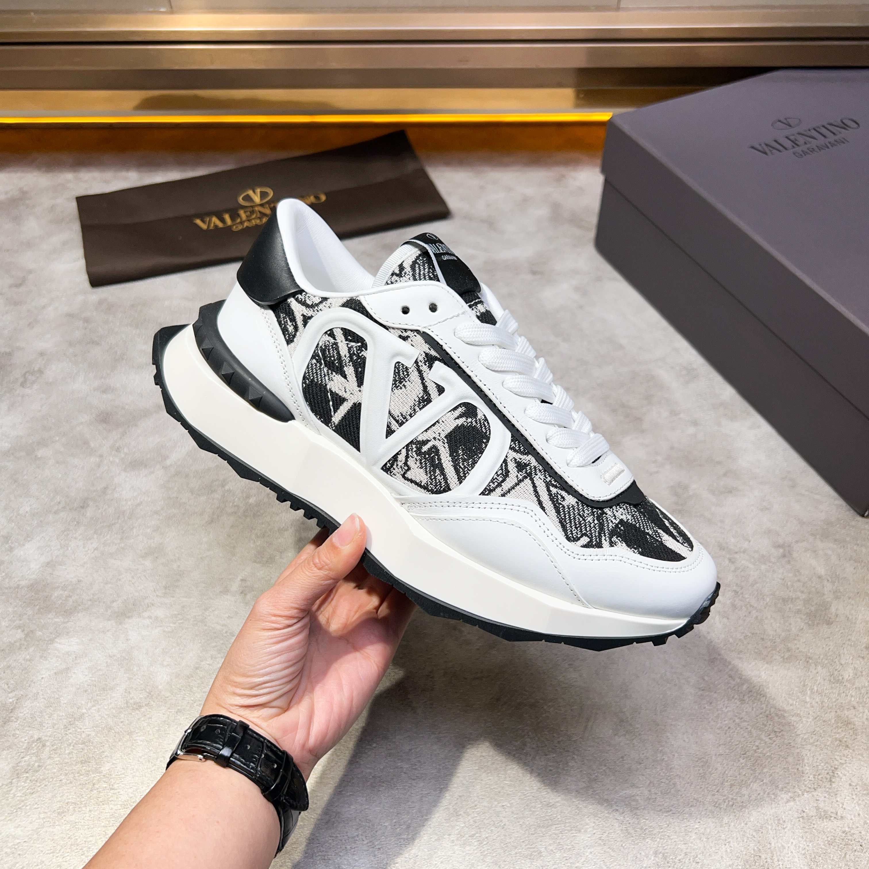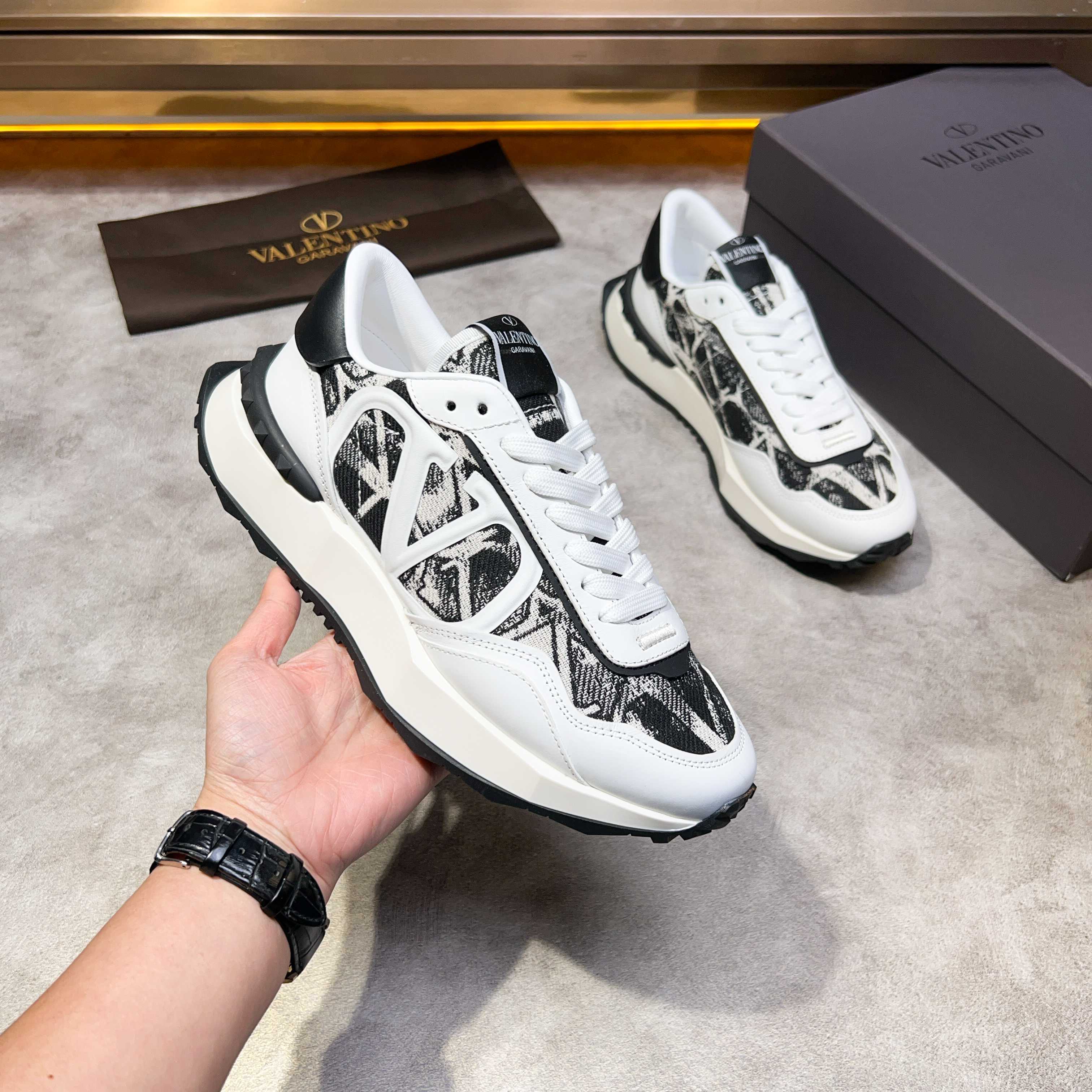 这款鞋子是AAAAA 1:1 质量 (非常棒). 使用了和原版一模一样的材料. 商标部分也保持了和华伦天奴/Valentino一样. 图片拍摄是实物鞋子拍摄, 您所收到的实物保证和我们图片一模一样.