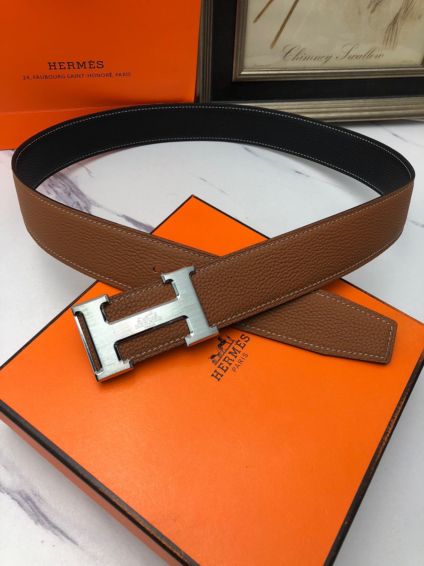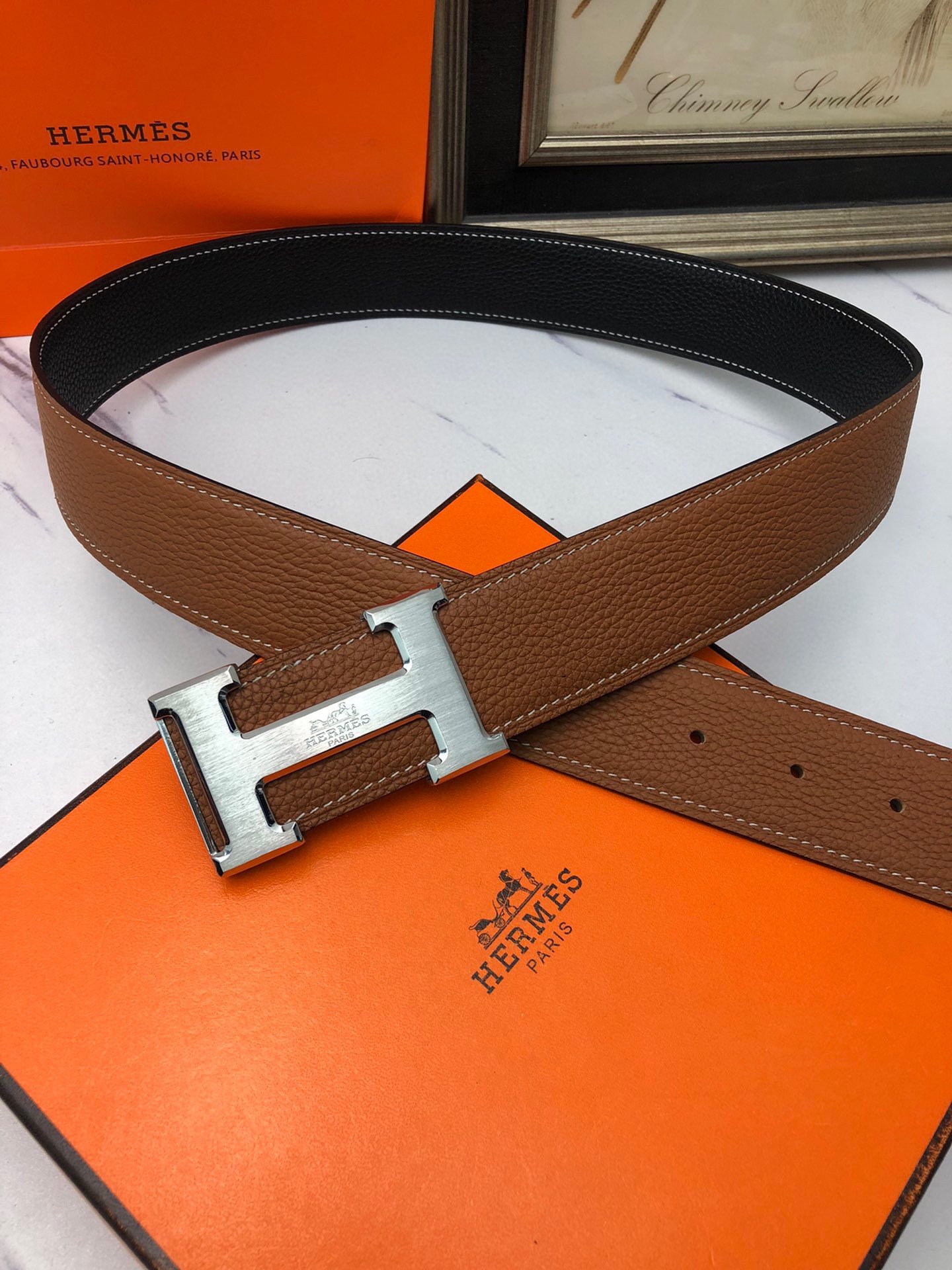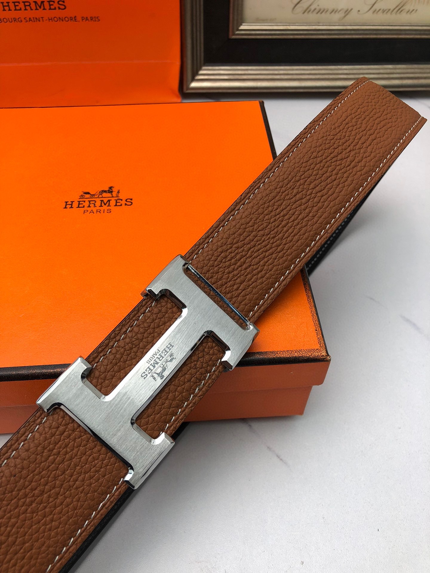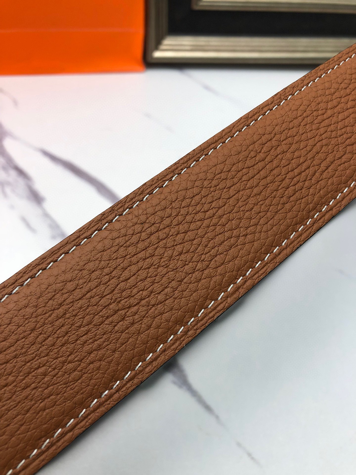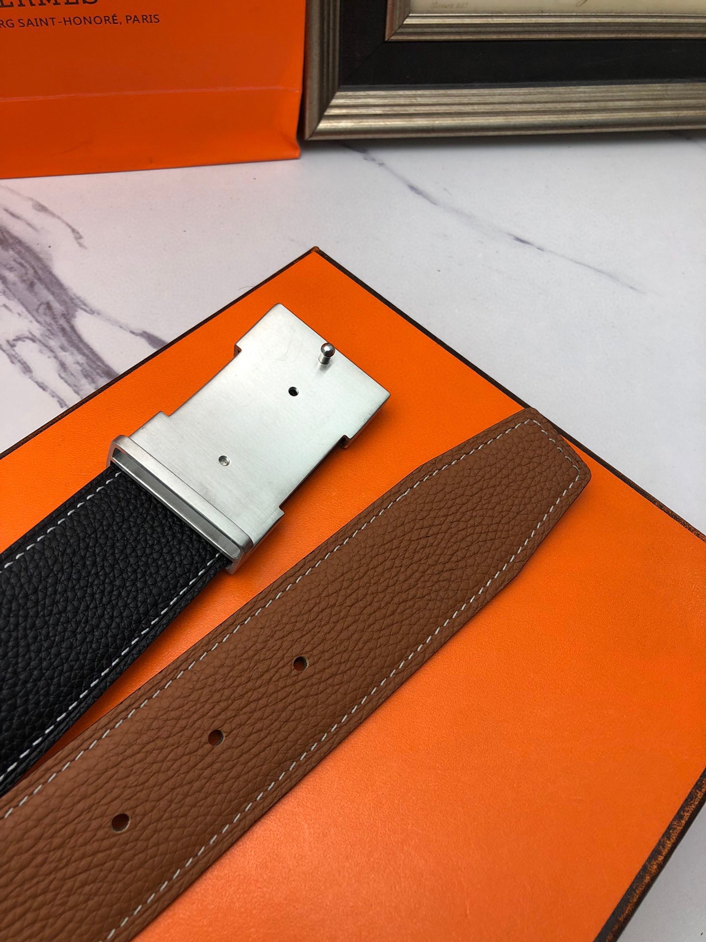 这款皮带是AAAAA 1:1 质量 (非常棒). 使用了和原版一模一样的材料. 商标部分也保持了和爱马仕/Hermes一样. 图片拍摄是实物皮带拍摄, 您所收到的实物保证和我们图片一模一样.