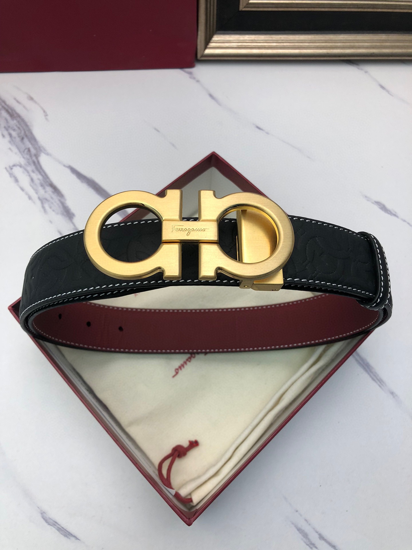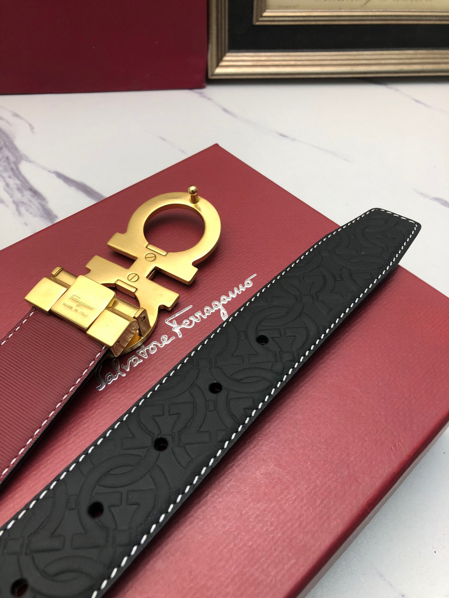 这款皮带是AAAAA 1:1 质量 (非常棒). 使用了和原版一模一样的材料. 商标部分也保持了和菲拉格慕/Salvatore Ferragamo一样. 图片拍摄是实物皮带拍摄, 您所收到的实物保证和我们图片一模一样.