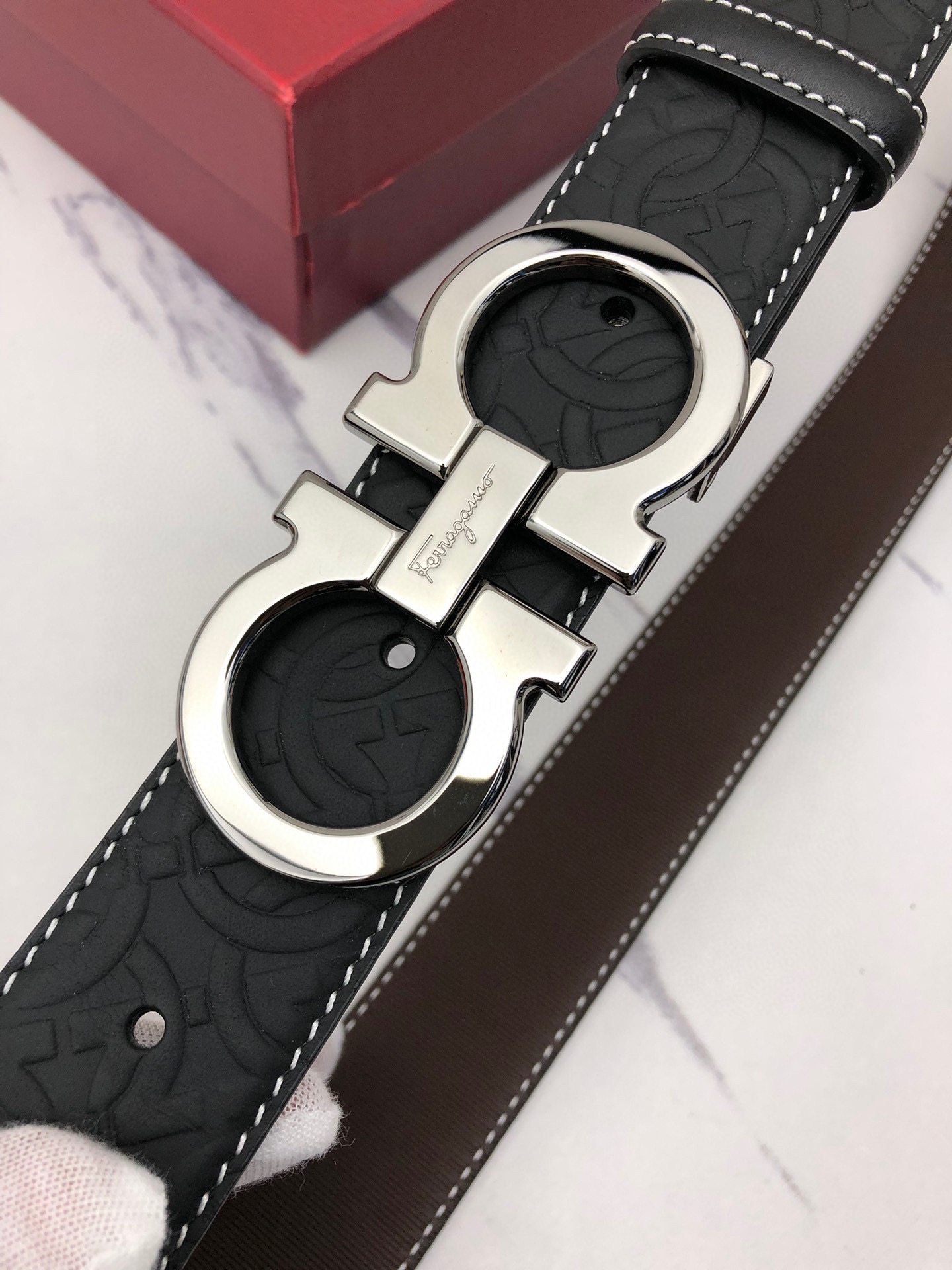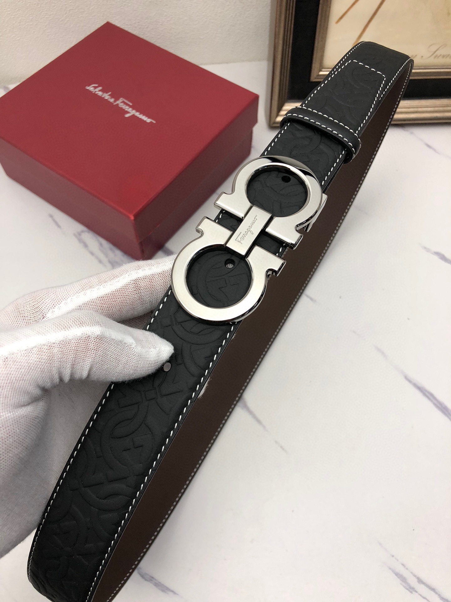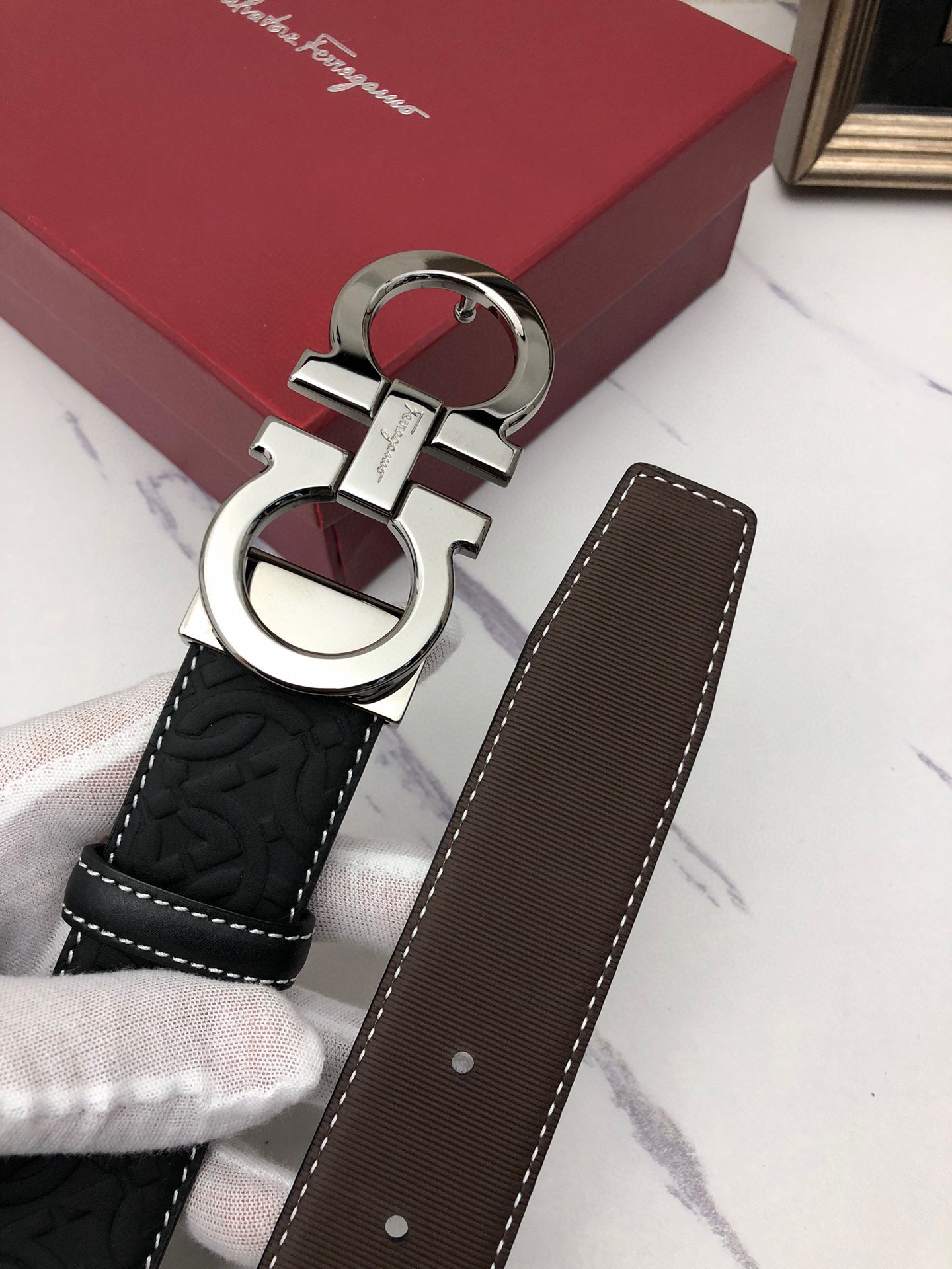 这款皮带是AAAAA 1:1 质量 (非常棒). 使用了和原版一模一样的材料. 商标部分也保持了和菲拉格慕/Salvatore Ferragamo一样. 图片拍摄是实物皮带拍摄, 您所收到的实物保证和我们图片一模一样.