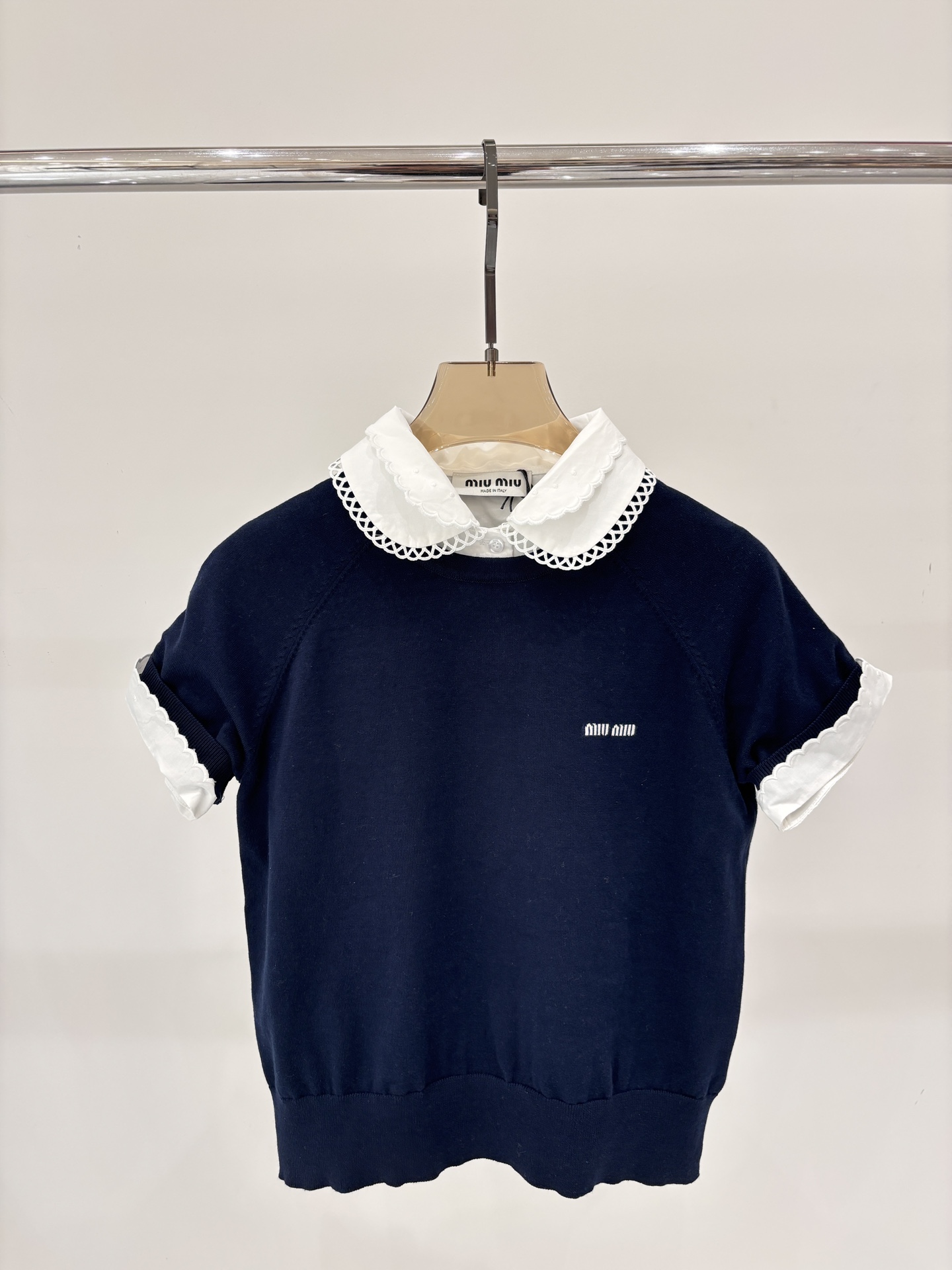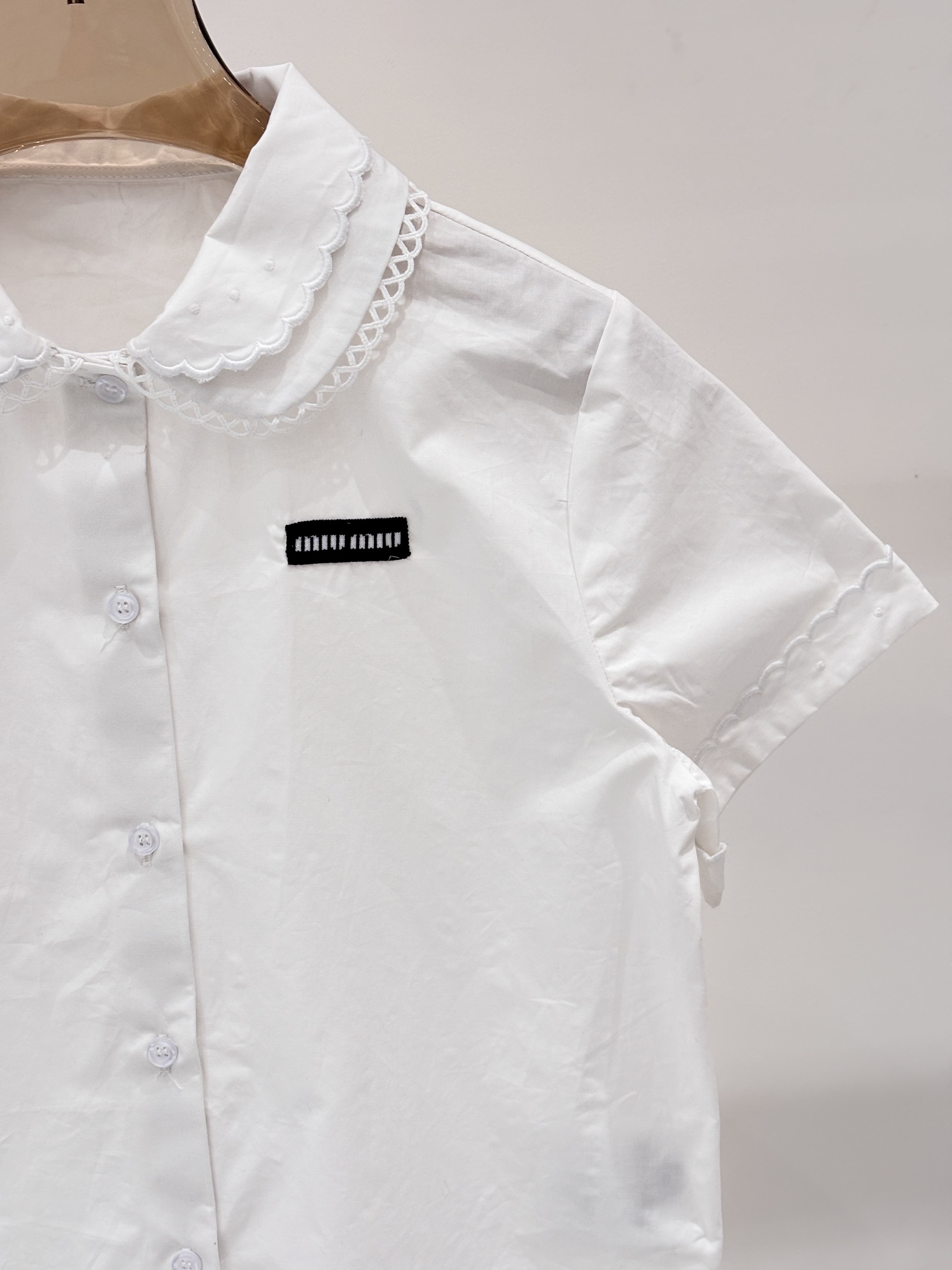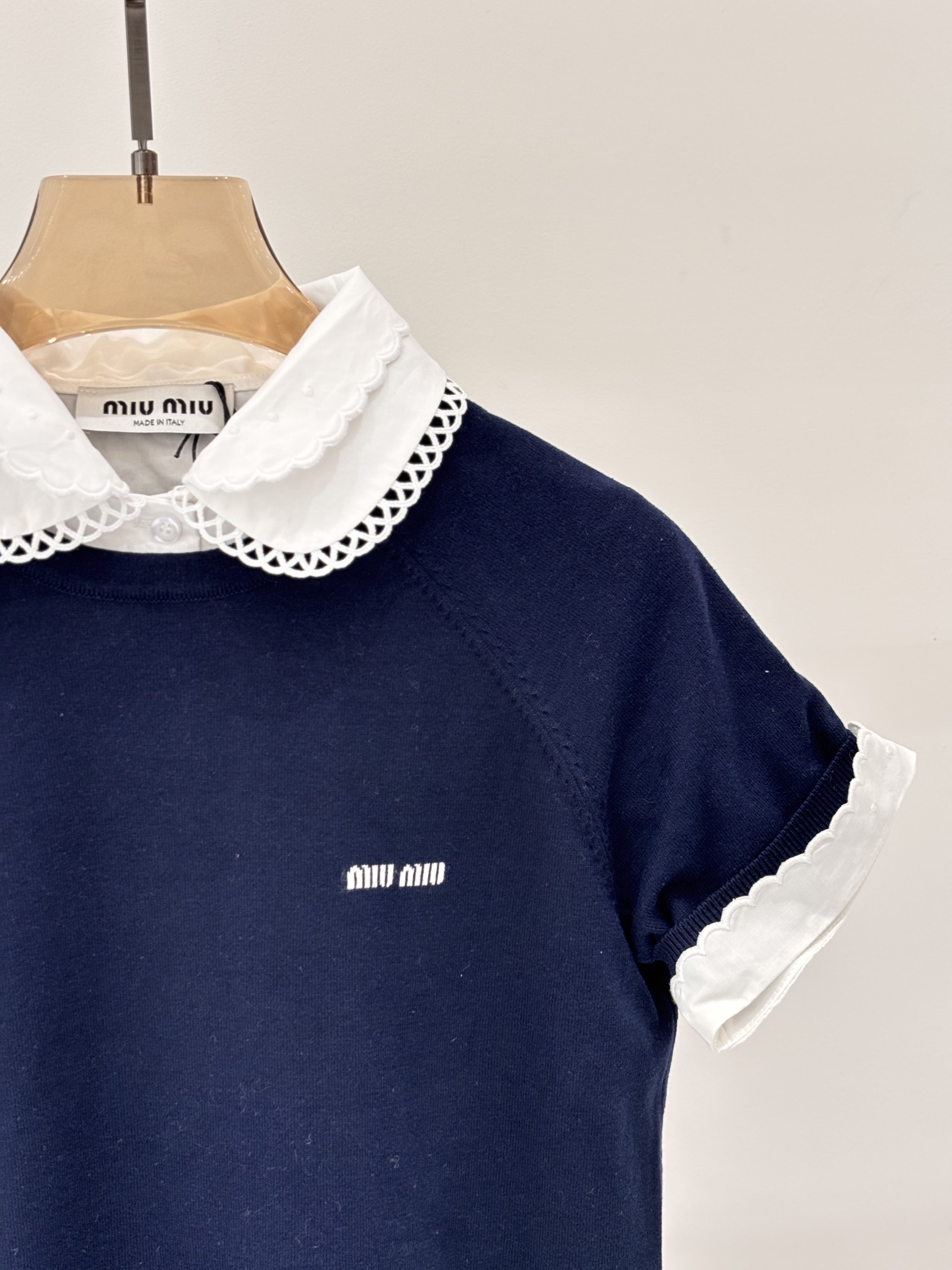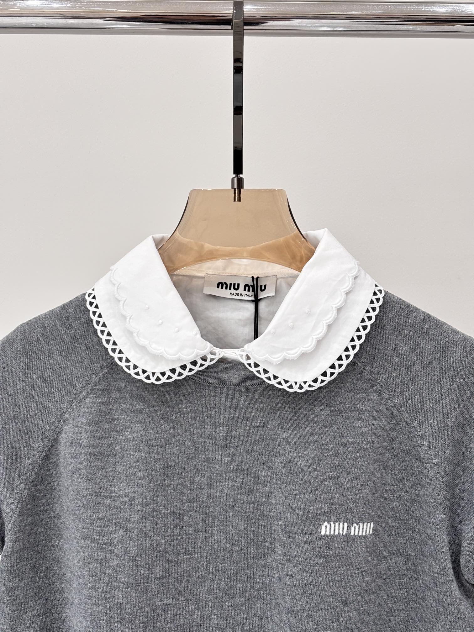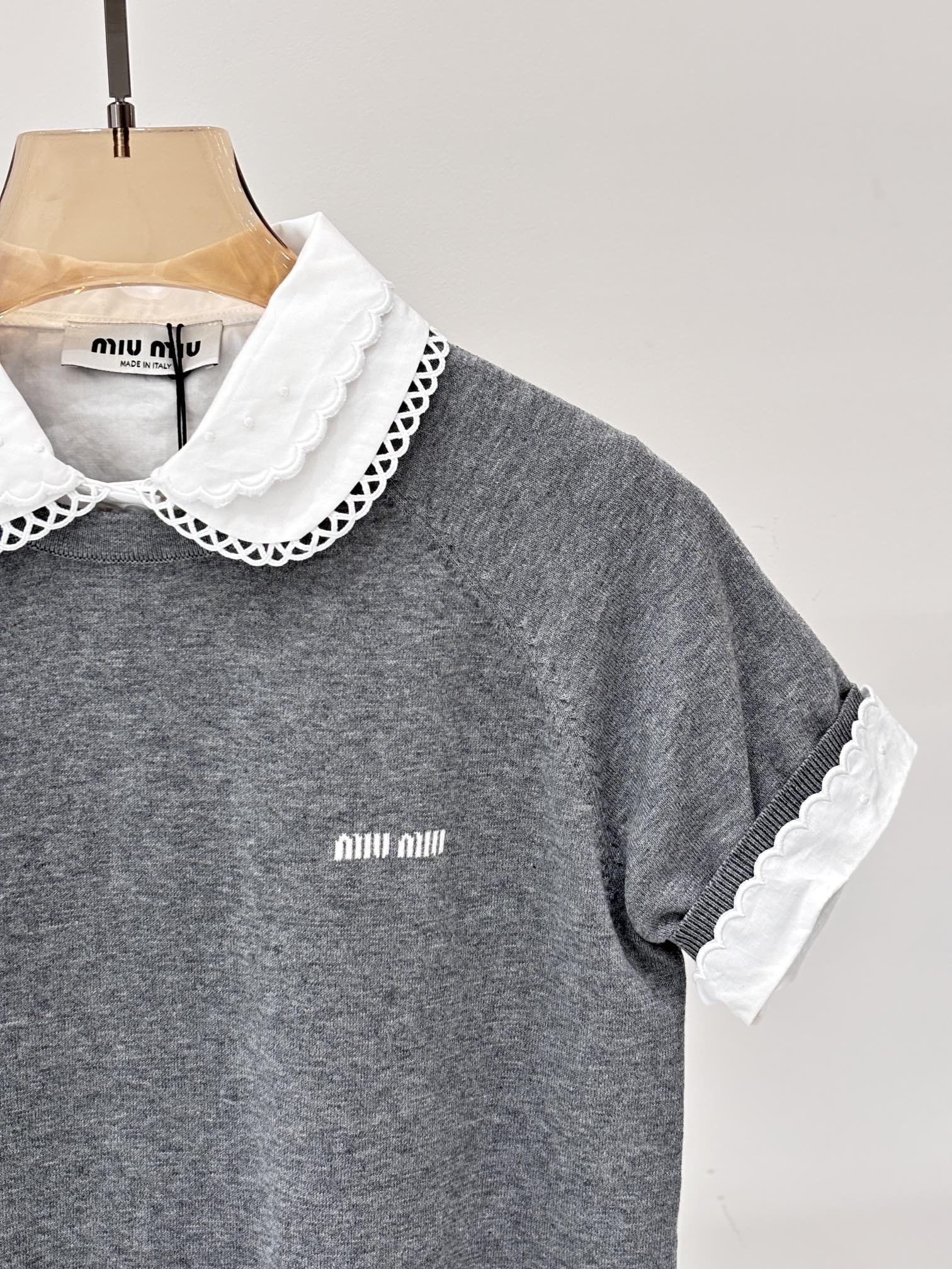 这款衣服是AAAAA 1:1 质量 (非常棒). 使用了和原版一模一样的材料. 商标部分也保持了和缪缪/Miu Miu一样. 图片拍摄是实物衣服拍摄, 您所收到的实物保证和我们图片一模一样.