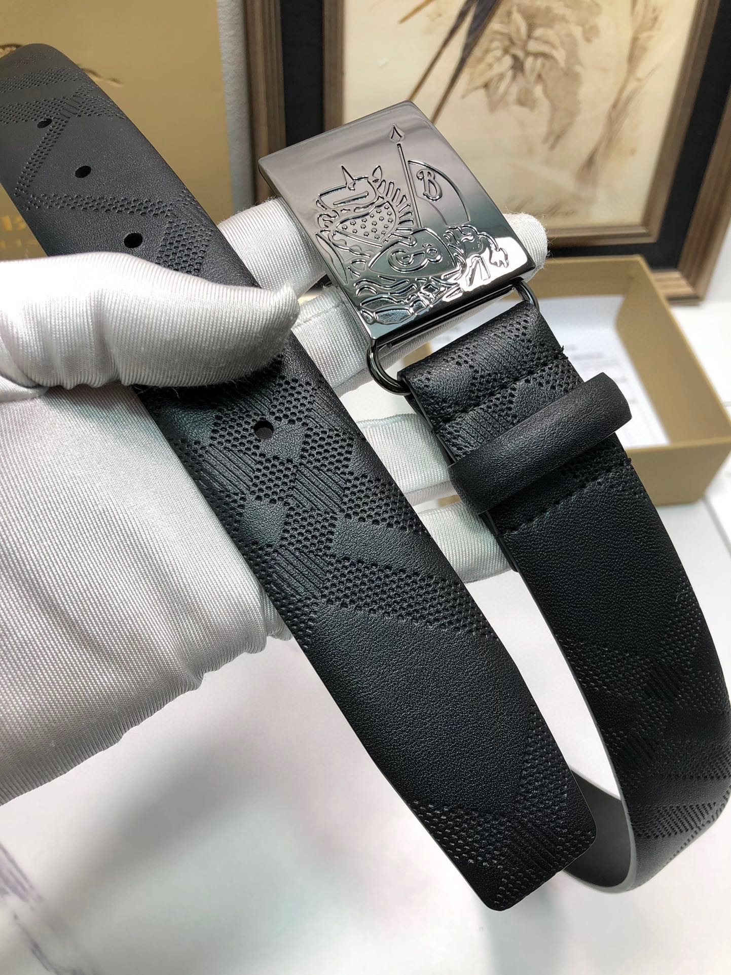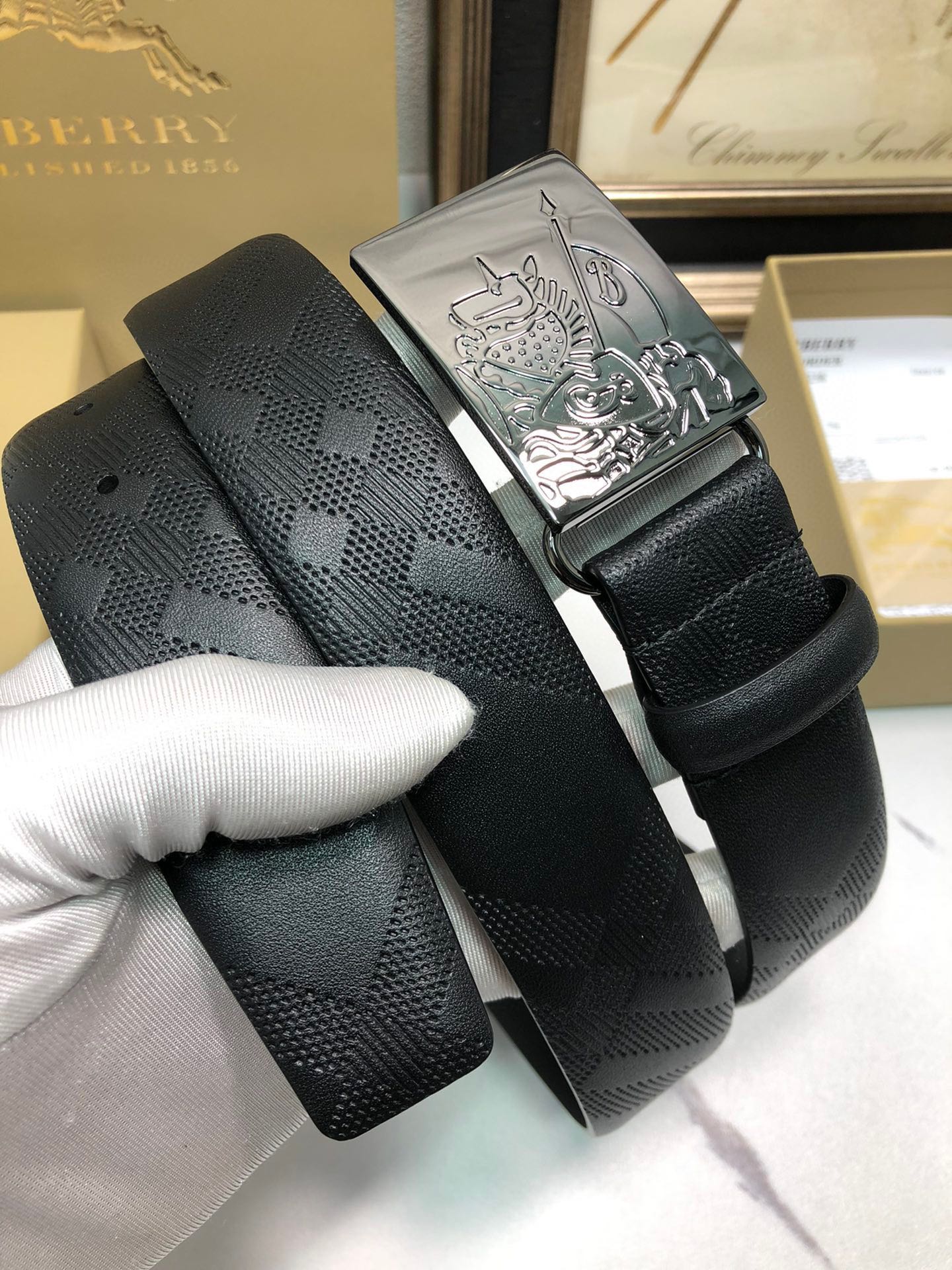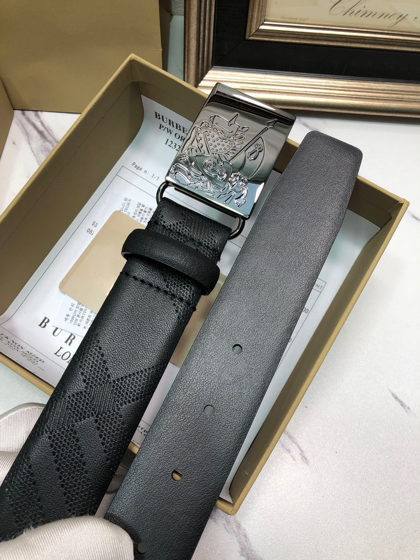 这款皮带是AAAAA 1:1 质量 (非常棒). 使用了和原版一模一样的材料. 商标部分也保持了和巴宝莉/Burberry一样. 图片拍摄是实物皮带拍摄, 您所收到的实物保证和我们图片一模一样.