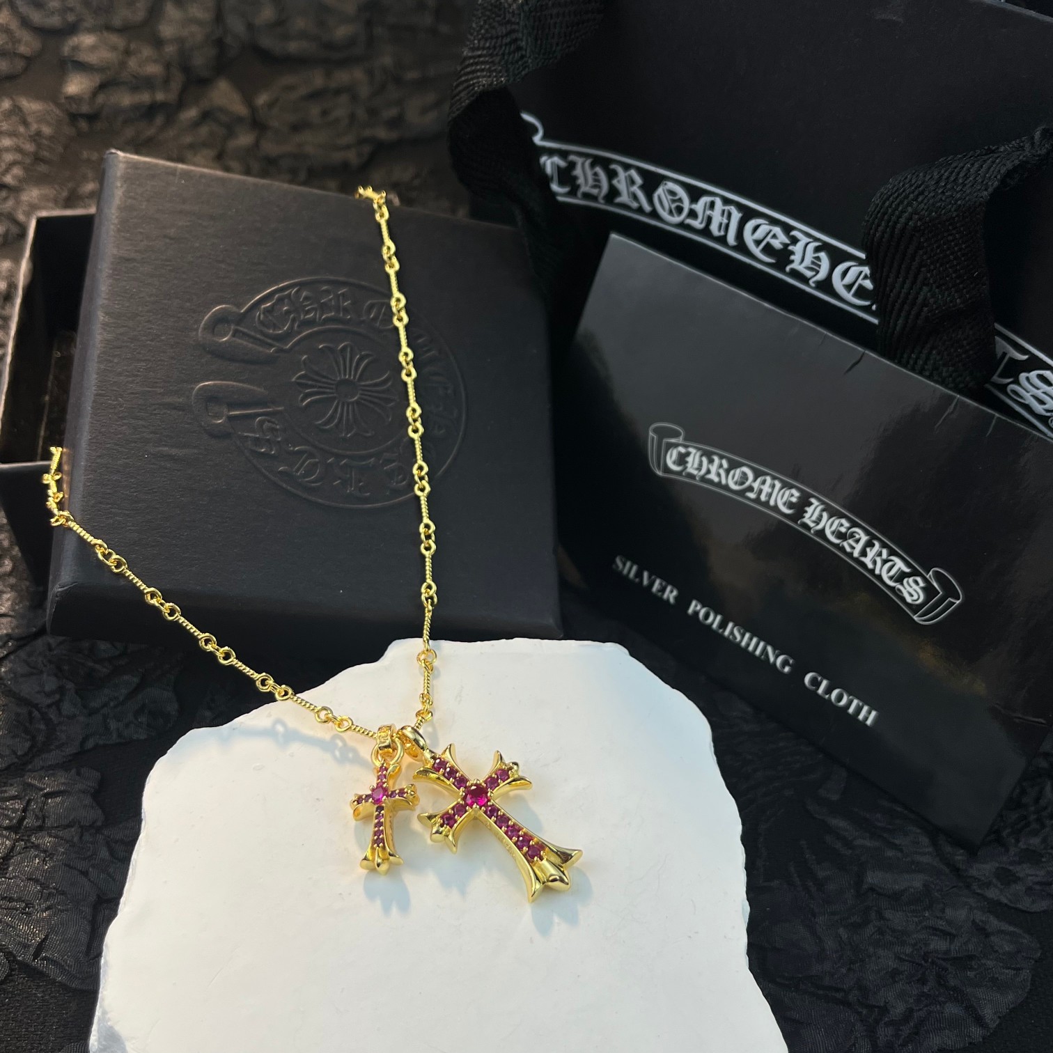 这款首饰是AAAAA 1:1 质量 (非常棒). 使用了和原版一模一样的材料. 商标部分也保持了和克罗心/Chrome Hearts一样. 图片拍摄是实物首饰拍摄, 您所收到的实物保证和我们图片一模一样.