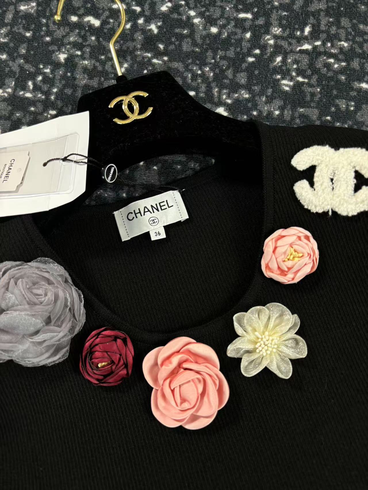 这款衣服是AAAAA 1:1 质量 (非常棒). 使用了和原版一模一样的材料. 商标部分也保持了和香奈儿/Chanel一样. 图片拍摄是实物衣服拍摄, 您所收到的实物保证和我们图片一模一样.