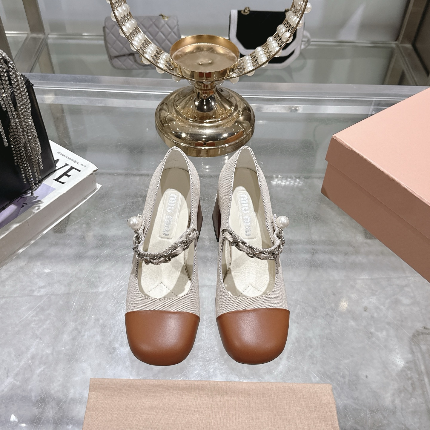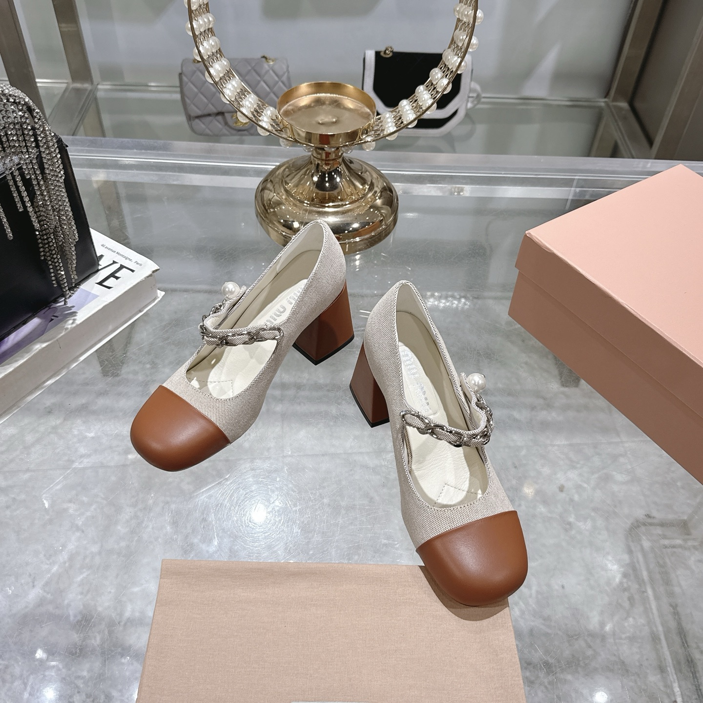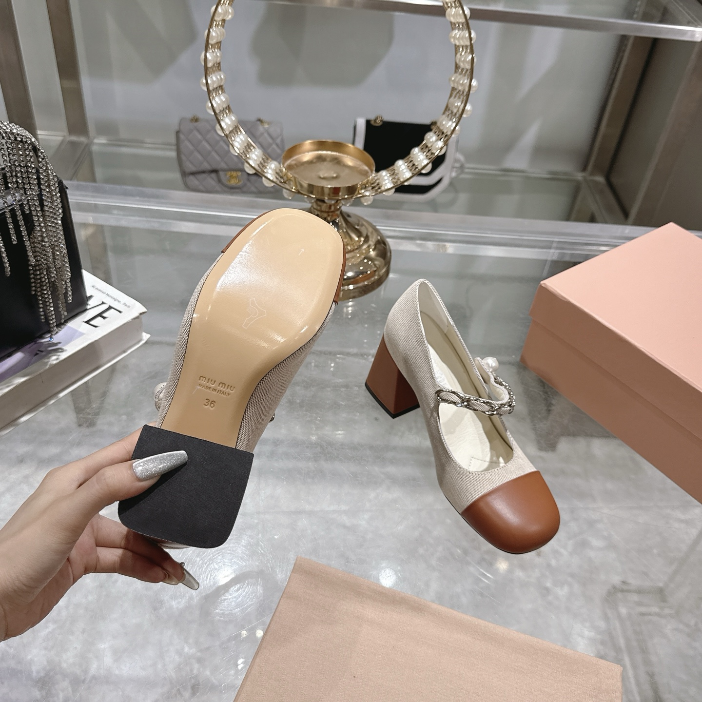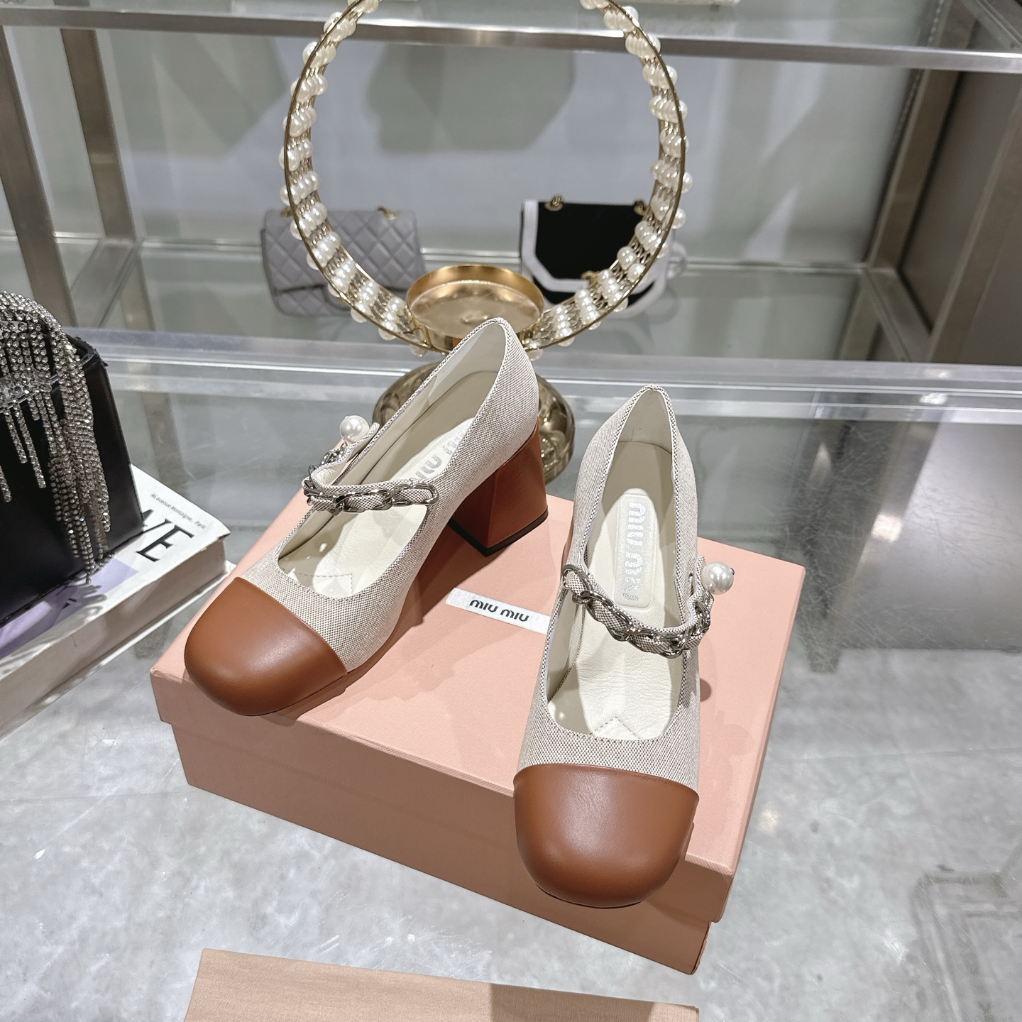 这款鞋子是AAAAA 1:1 质量 (非常棒). 使用了和原版一模一样的材料. 商标部分也保持了和缪缪/Miu Miu一样. 图片拍摄是实物鞋子拍摄, 您所收到的实物保证和我们图片一模一样.