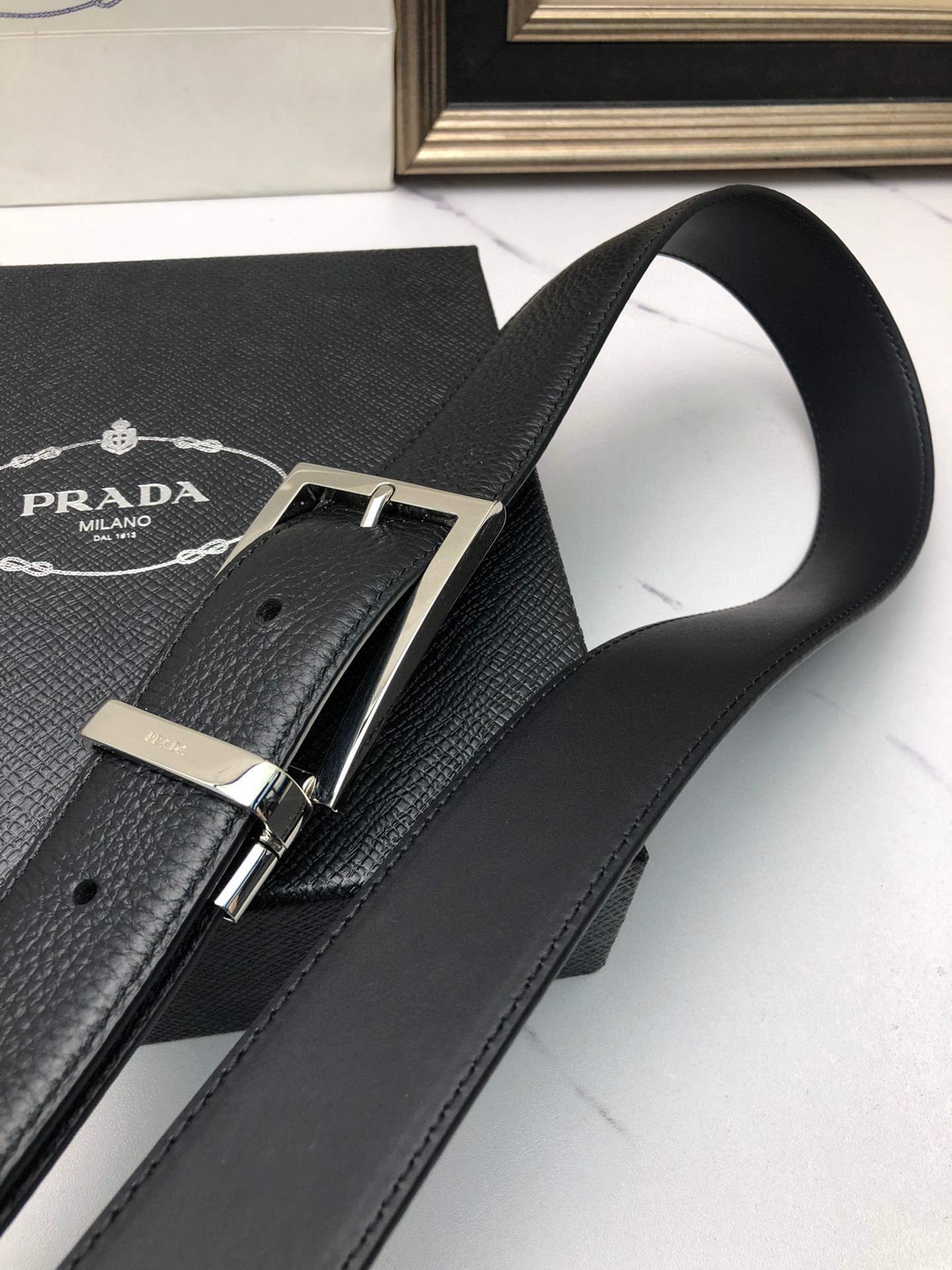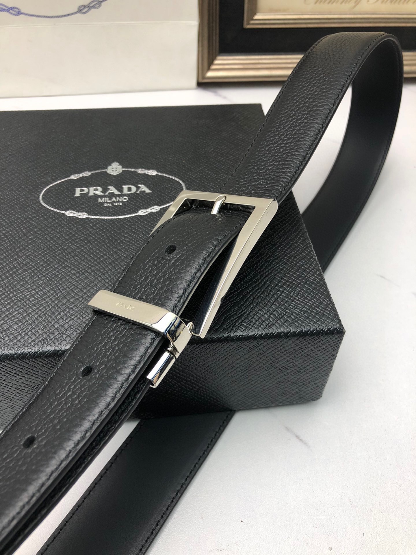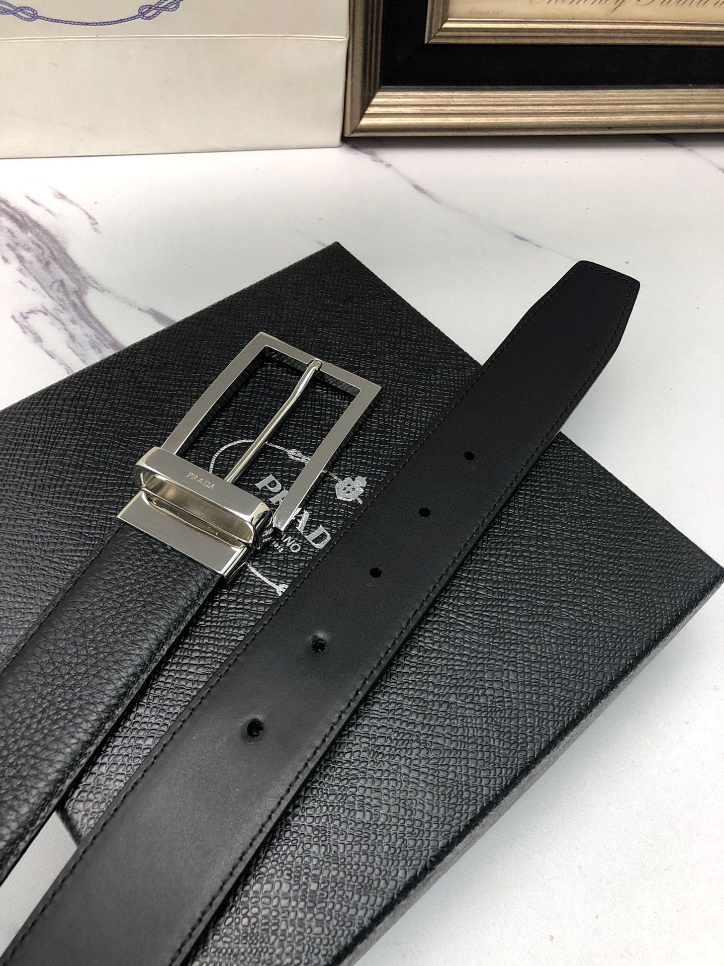 这款皮带是AAAAA 1:1 质量 (非常棒). 使用了和原版一模一样的材料. 商标部分也保持了和普拉达/Prada一样. 图片拍摄是实物皮带拍摄, 您所收到的实物保证和我们图片一模一样.