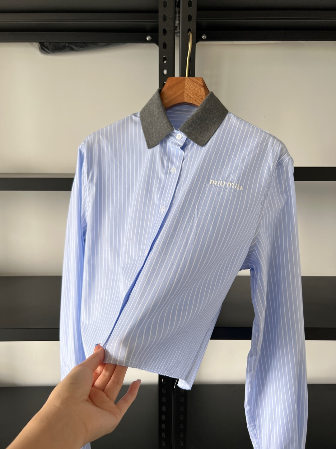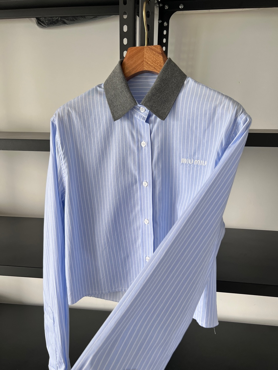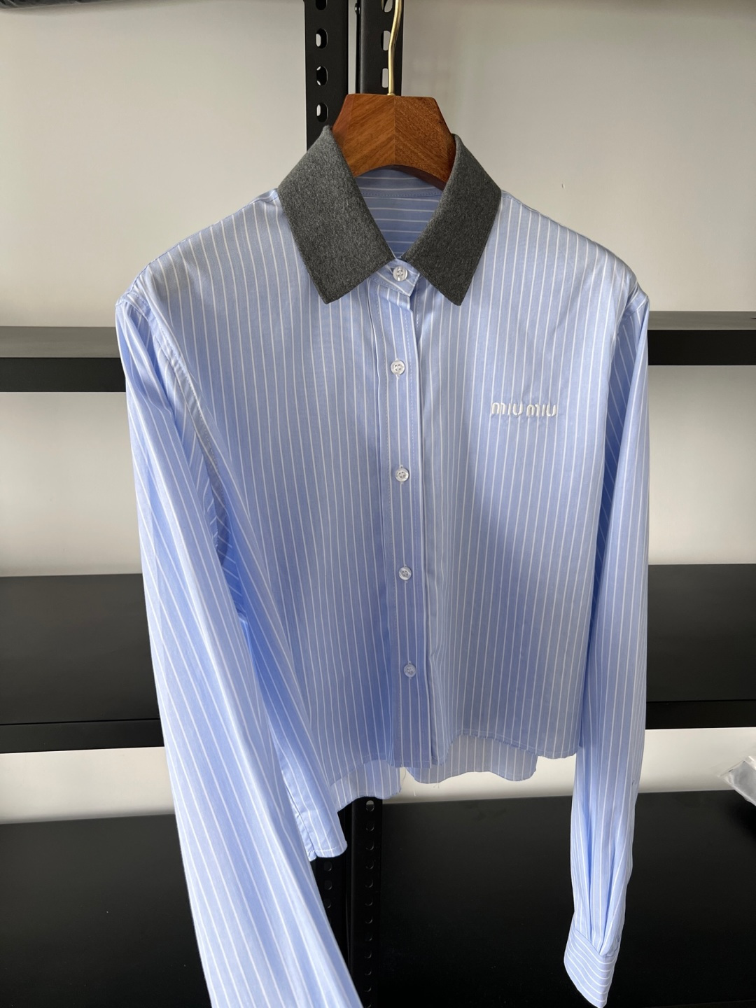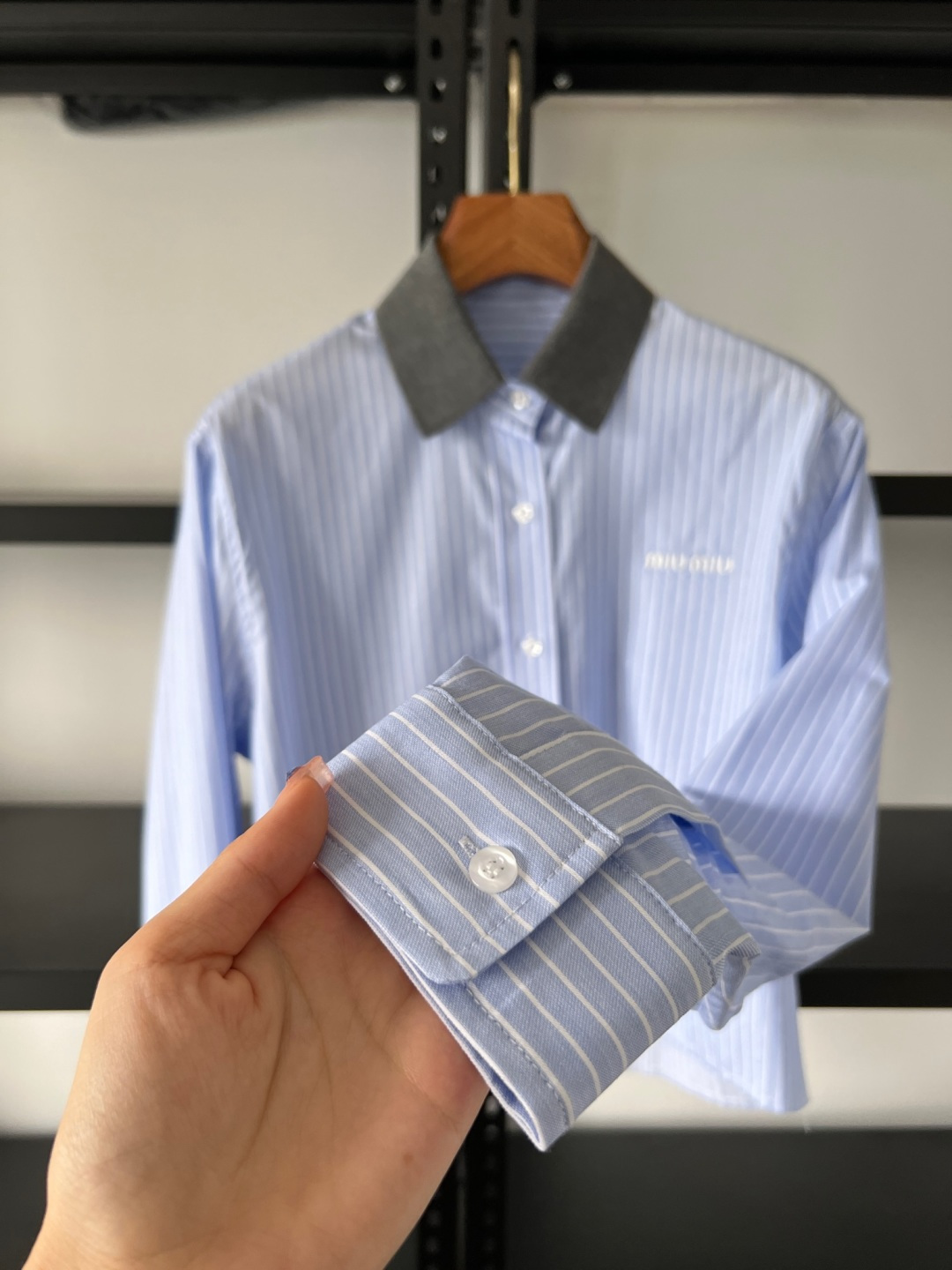 这款衣服是AAAAA 1:1 质量 (非常棒). 使用了和原版一模一样的材料. 商标部分也保持了和缪缪/Miu Miu一样. 图片拍摄是实物衣服拍摄, 您所收到的实物保证和我们图片一模一样.